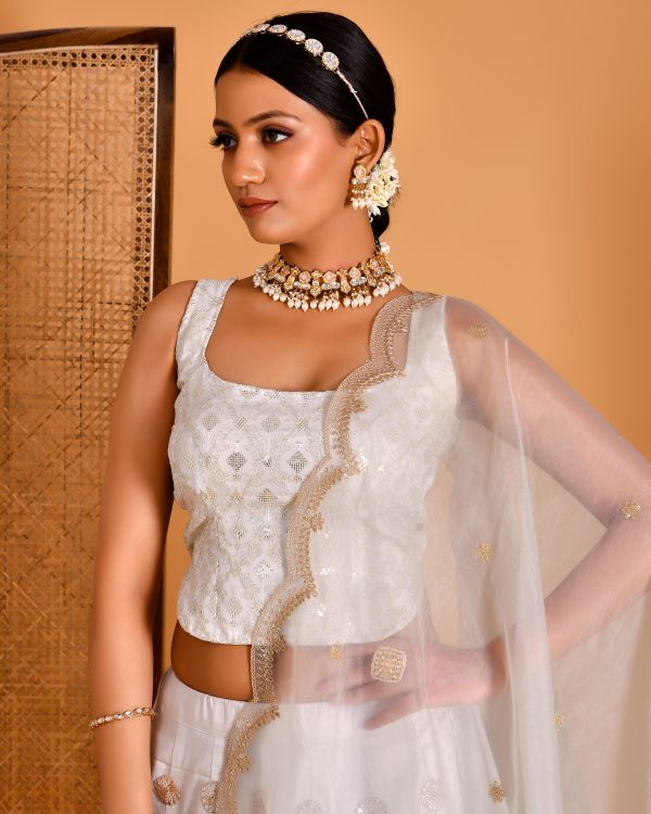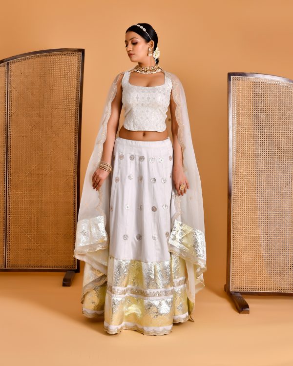 Introducing a refined expression of festive elegance, this ivory and gold lehenga set is designed to make a timeless statement. The voluminous lehenga is adorned with intricate gota work, lending rich texture and a subtle shimmer. Paired with a delicately sequined backless blouse featuring elegant tassel tie-up detailing and finished with a sheer dupatta with refined borders, this ensemble embodies graceful, feminine celebration.
