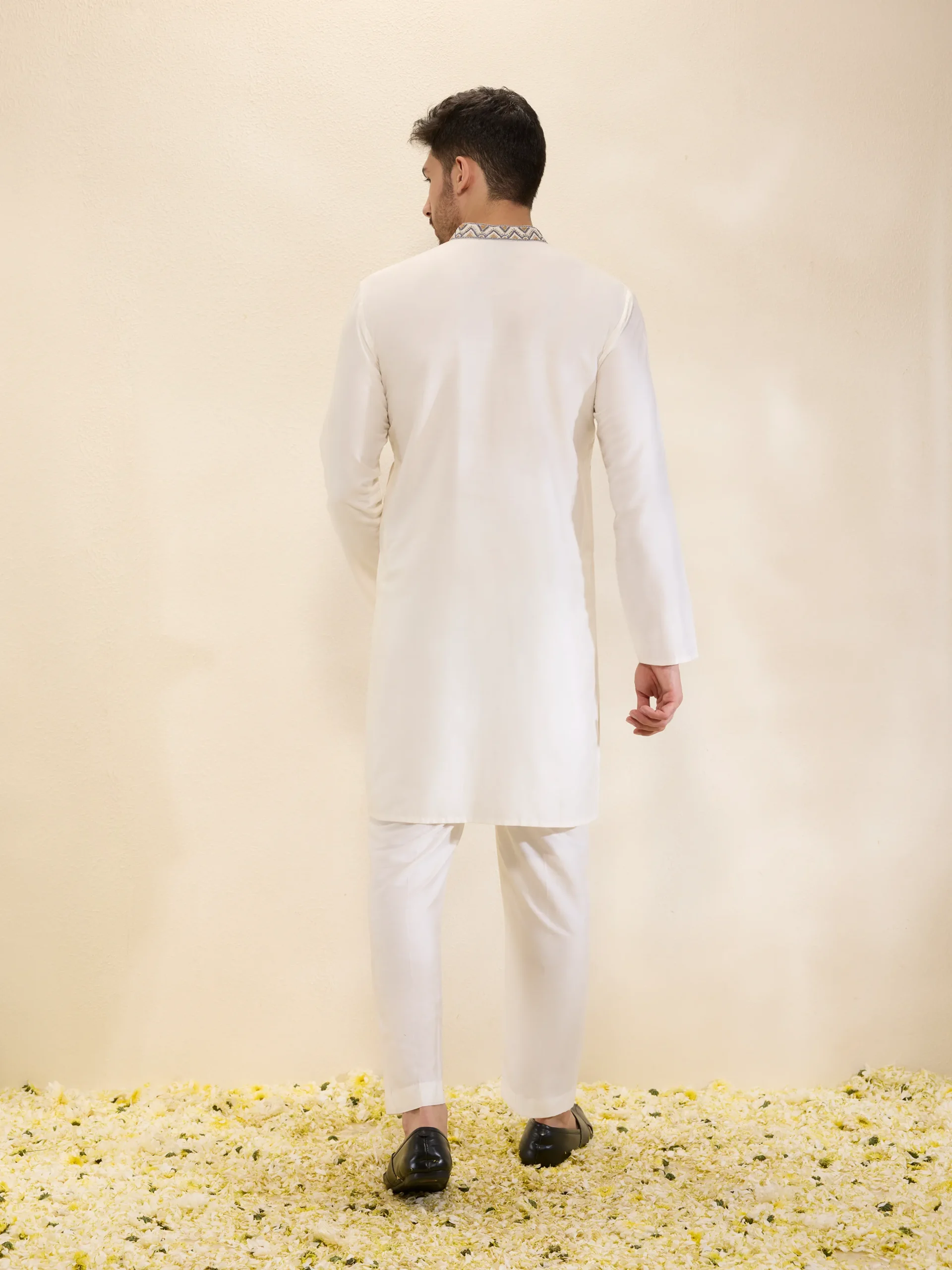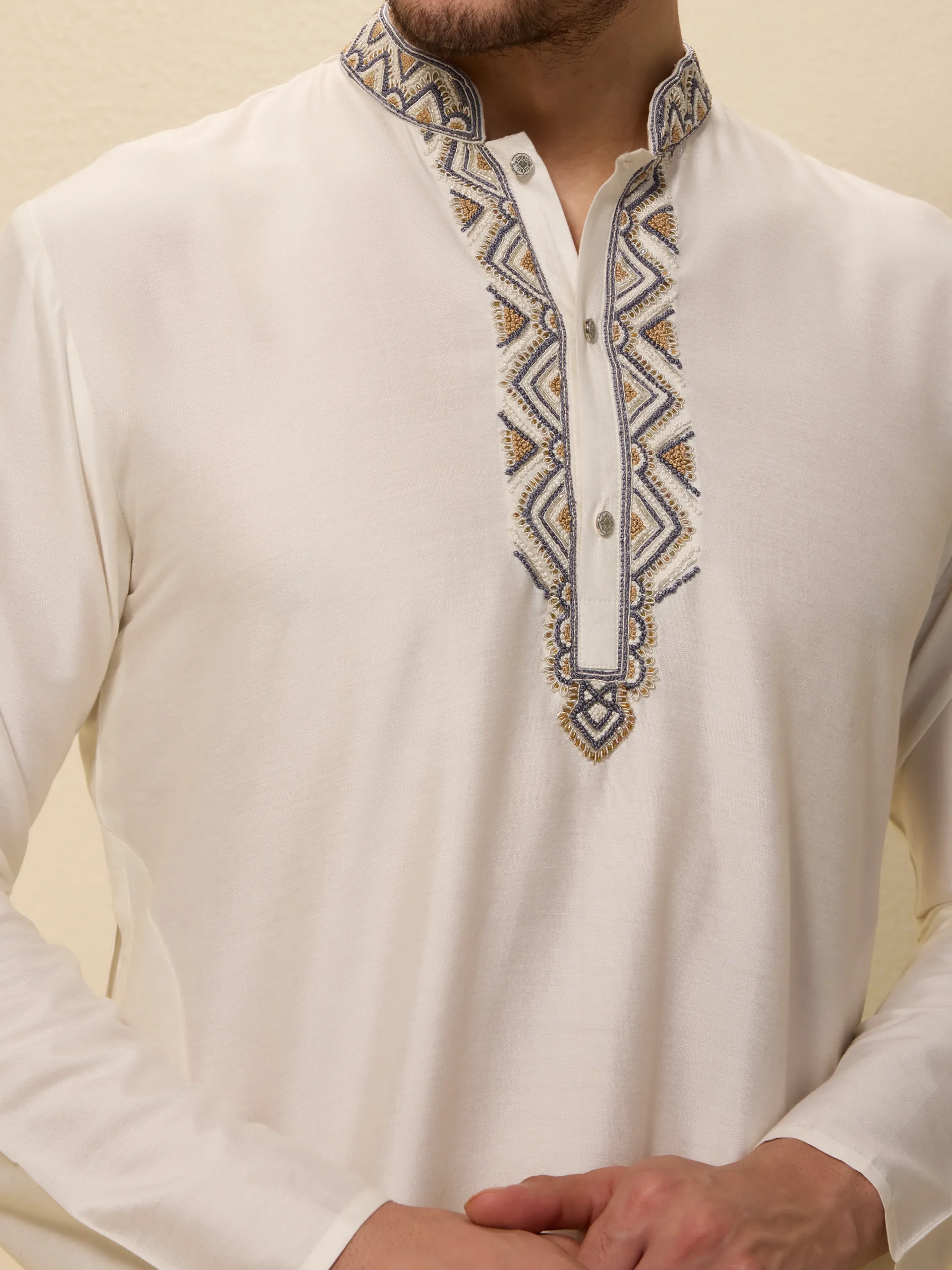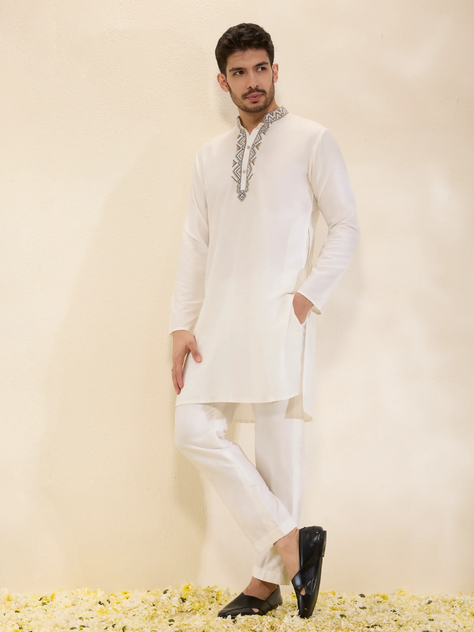 Ivory Hand Embroidered Kurta Set in Spun Silk with Collar and Placket Detail