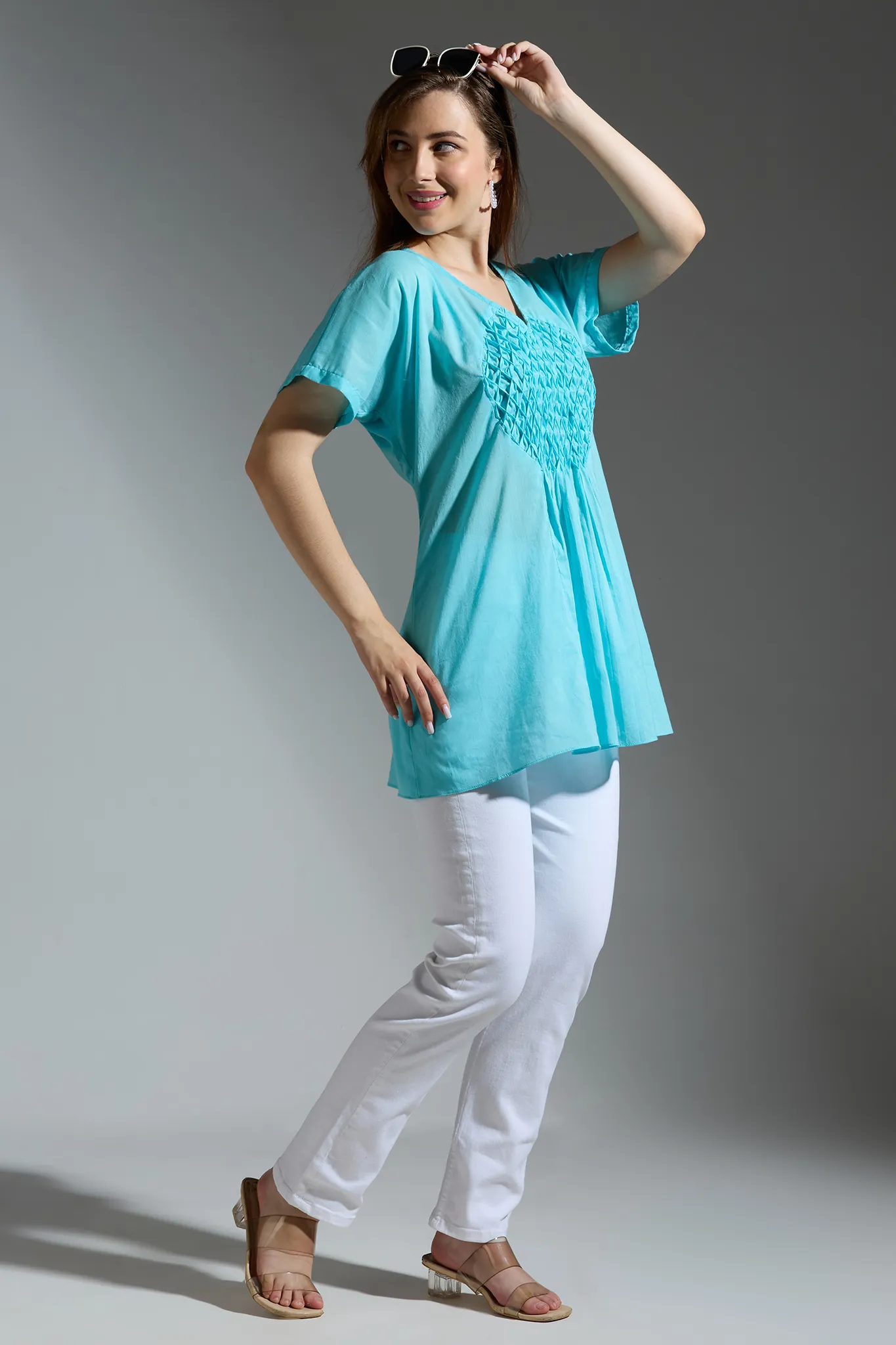 Ivory Smocked Tunic is soft ,flattering and endlessly versatile.Pair with leggings or straight pants(ivory,black,beige).Add flats ,heels or mules.Add hoops with delicate layered chains. The length allows to wear it as a short dress.