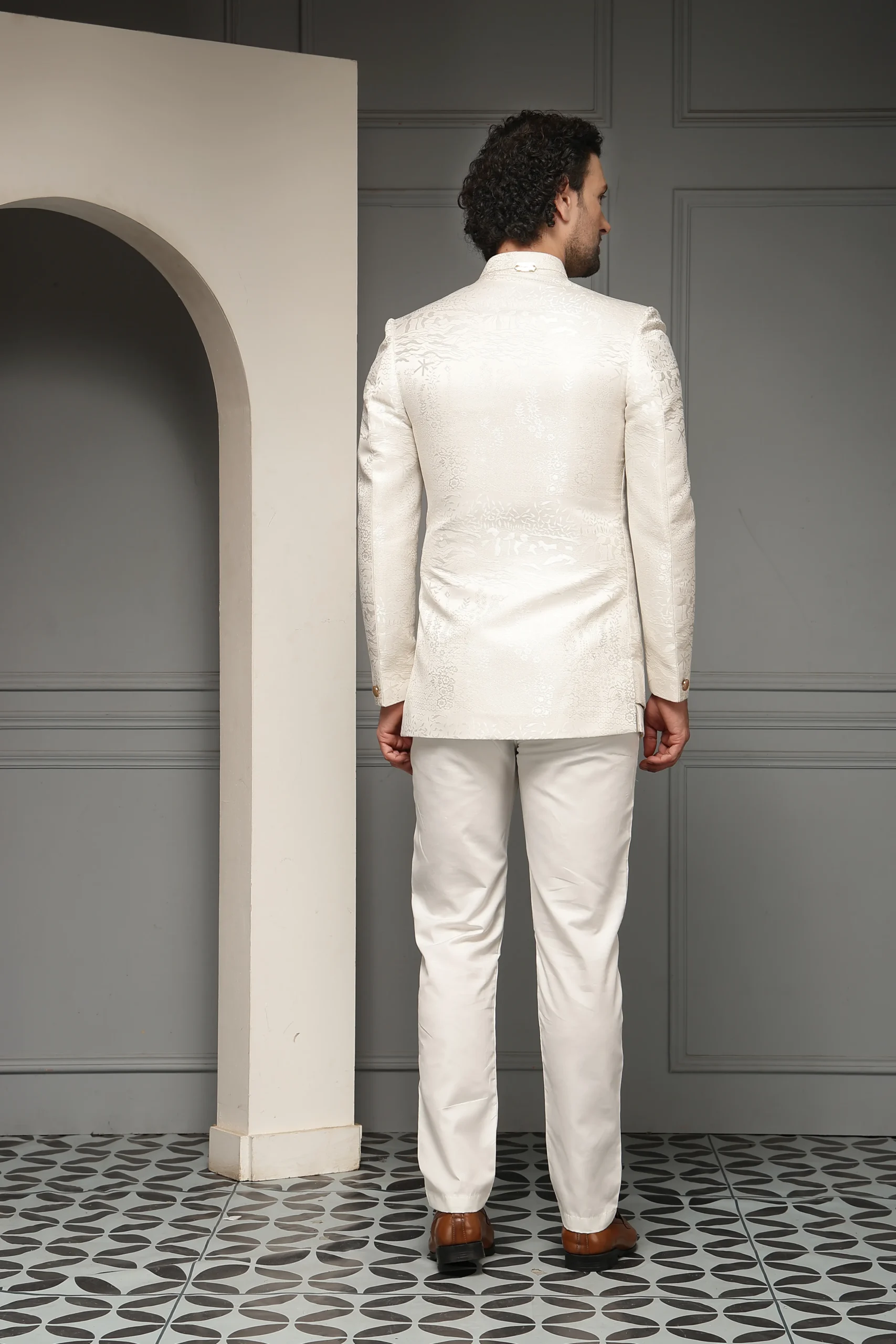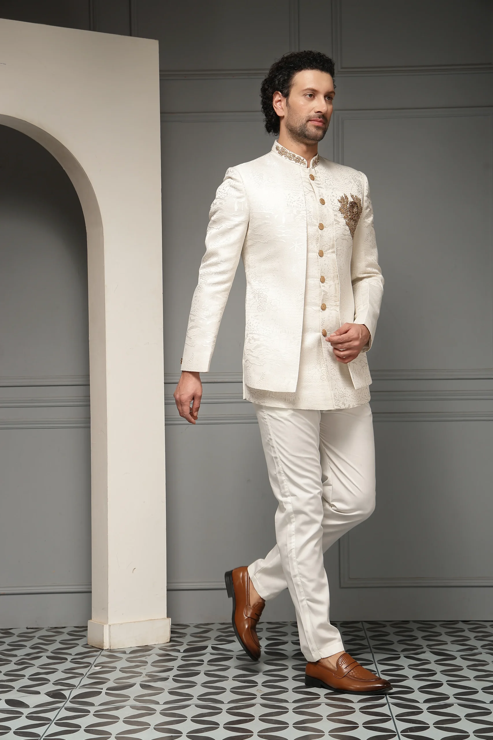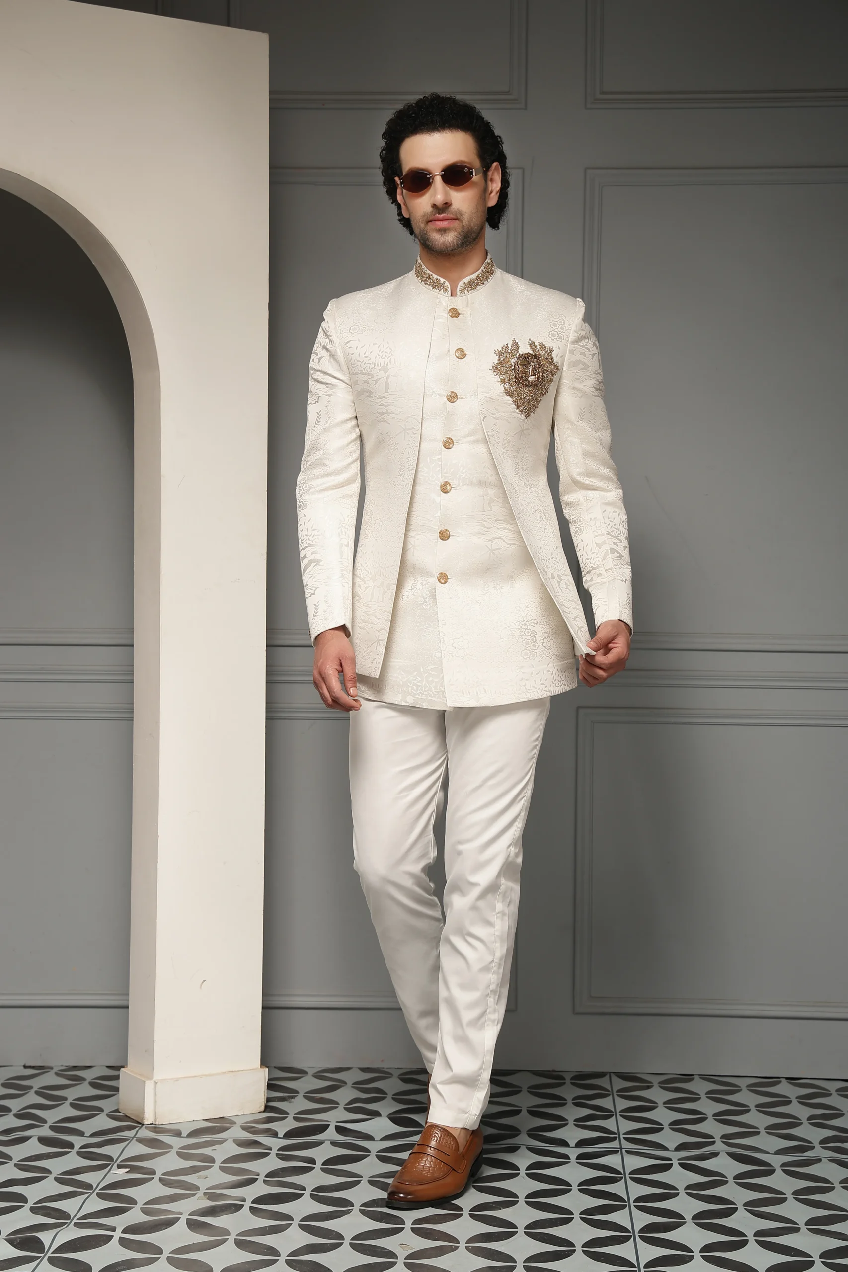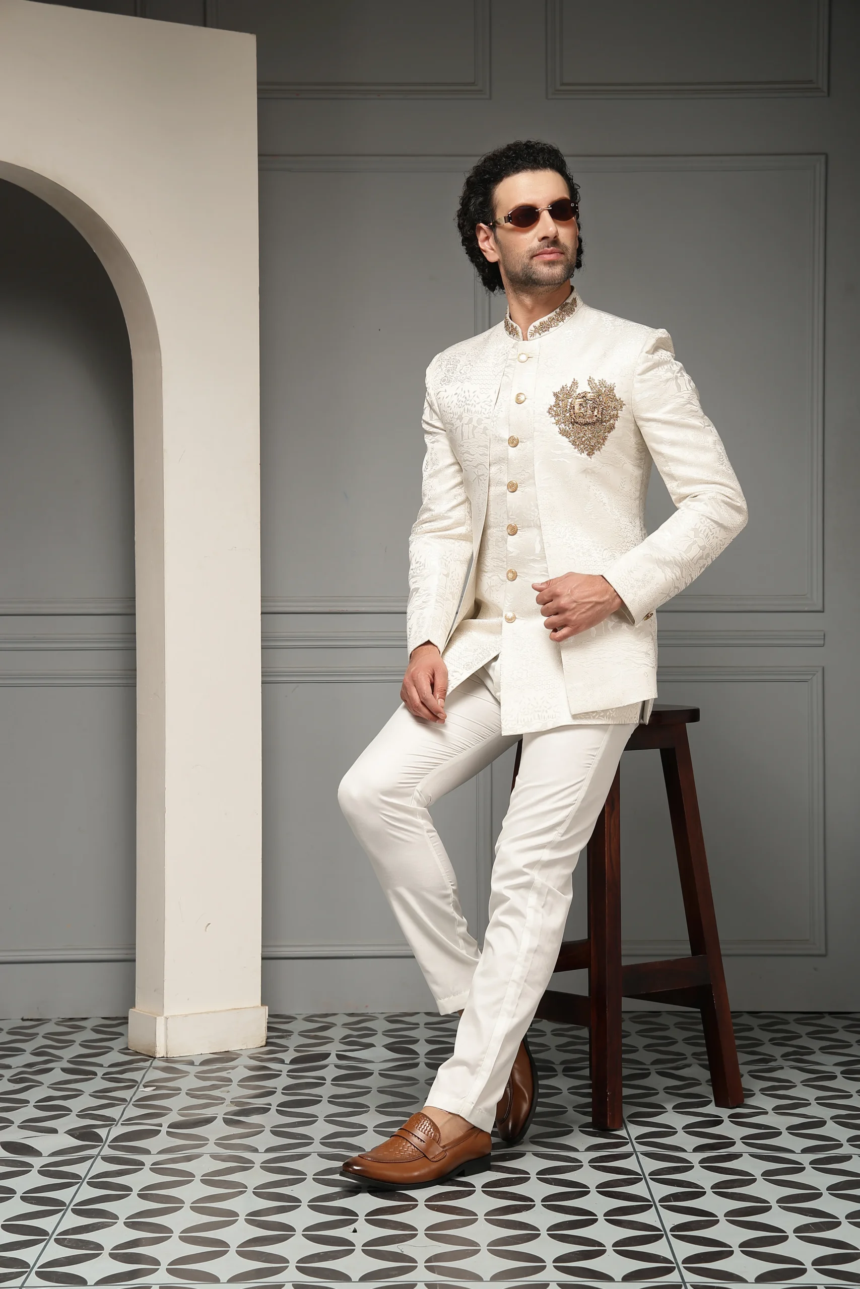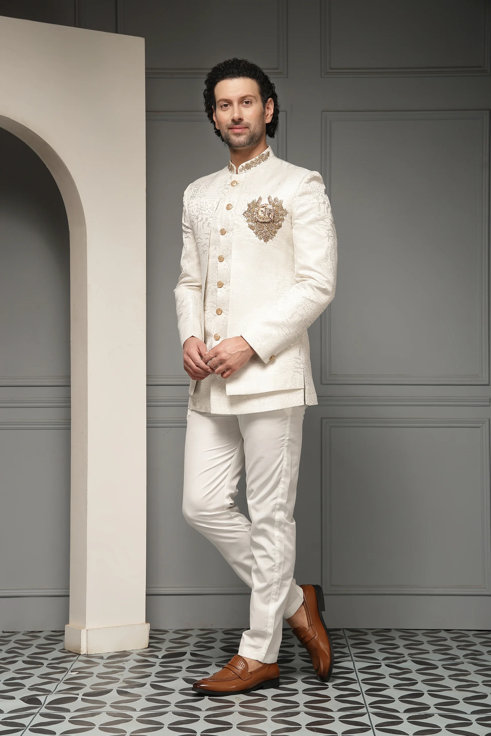 Ivory Jacquard Bandhgala Set with Antique-Gold Crest Embroidery