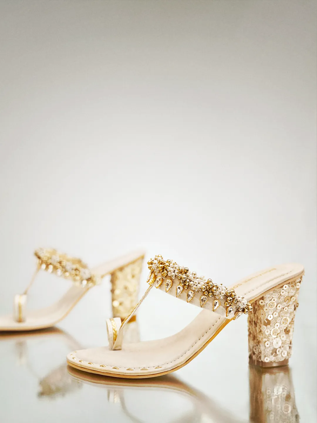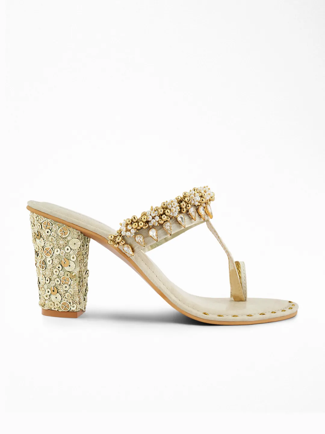 Craft : Kundan crystal drops | Pearl & gold bead cluster T-strap | Sequin-encrusted cylindrical block heelMaterial : Fabric on faux leatherWork of : 89 Hours