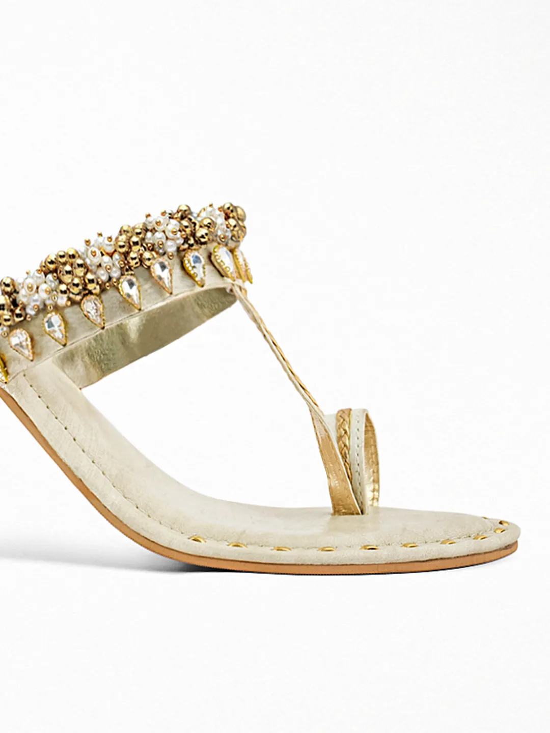 Adorned with Kundan crystal drops, pearl & gold bead cluster T-strap and sequin-encrusted cylindrical block heel in fabric on faux leather, this Ivory Kundan Block Heel Sandal is a royal heirloom piece.