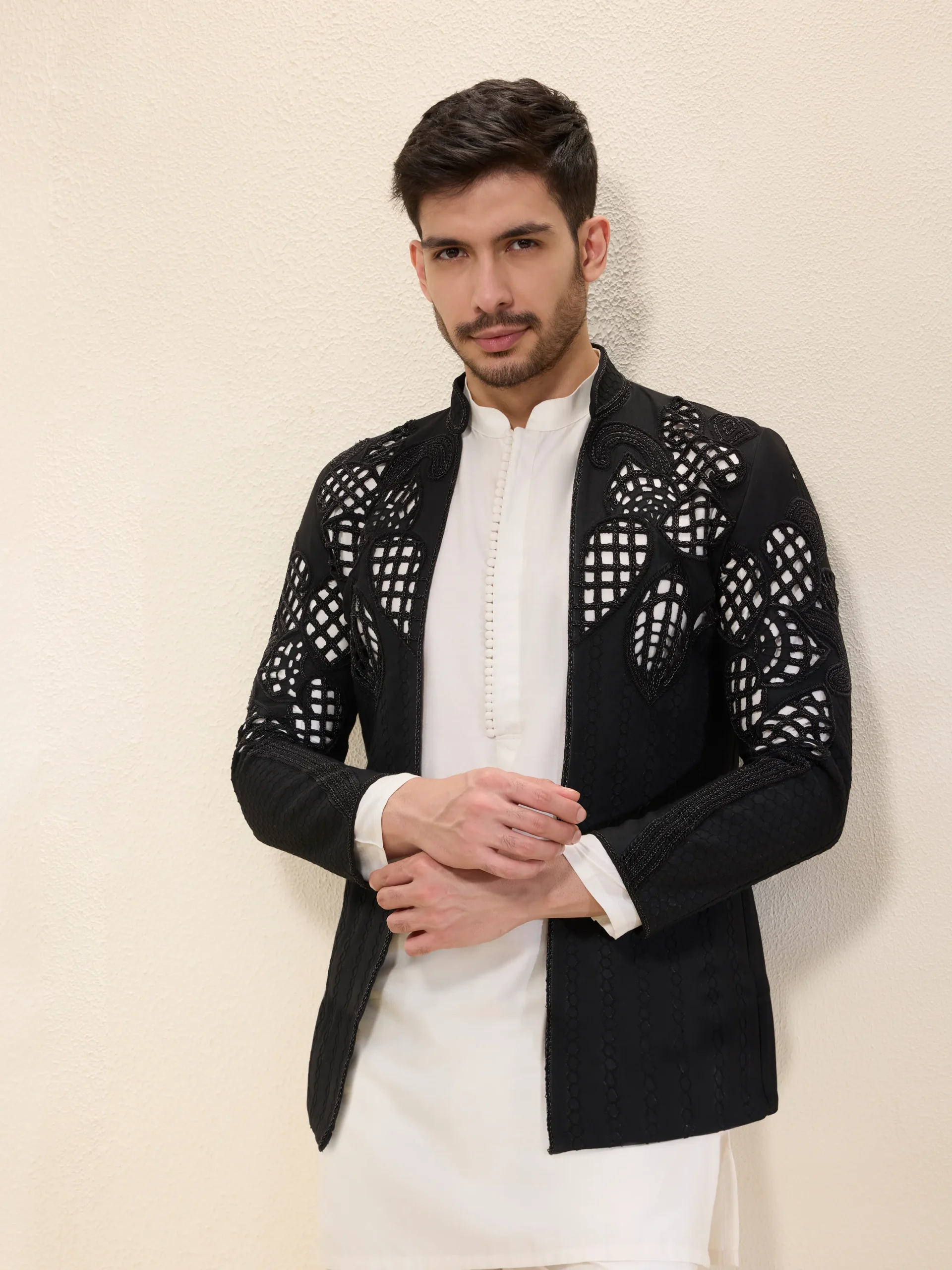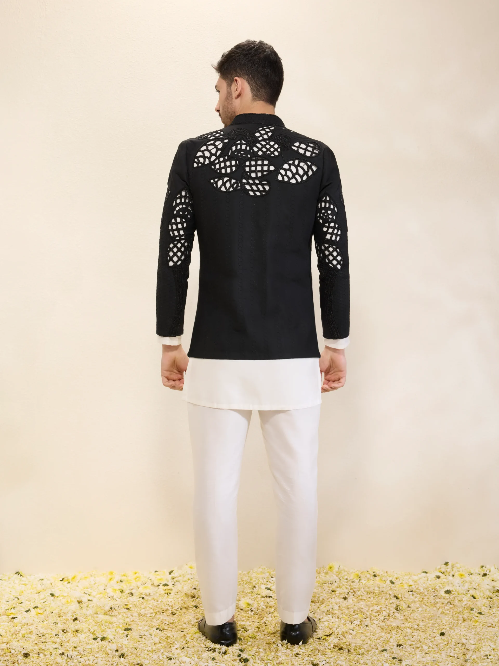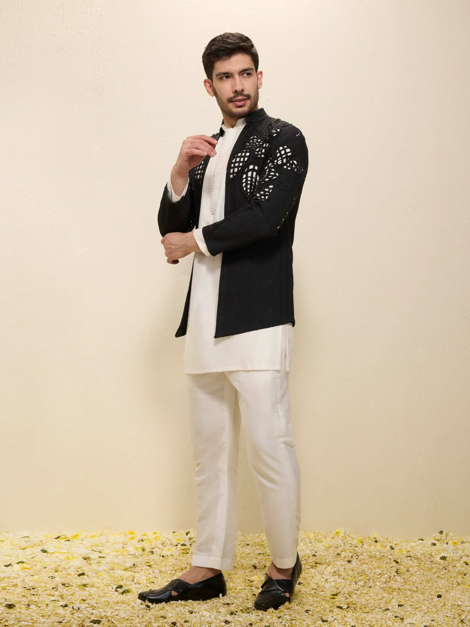 Introducing an ivory kurta set crafted in spun silk, featuring elegant potli button detailing and paired with matching pants. Layered with a striking black jacket adorned with cutwork and hand embroidery, this ensemble blends classic tones with intricate craftsmanship, making it perfect for weddings and festive occasions.