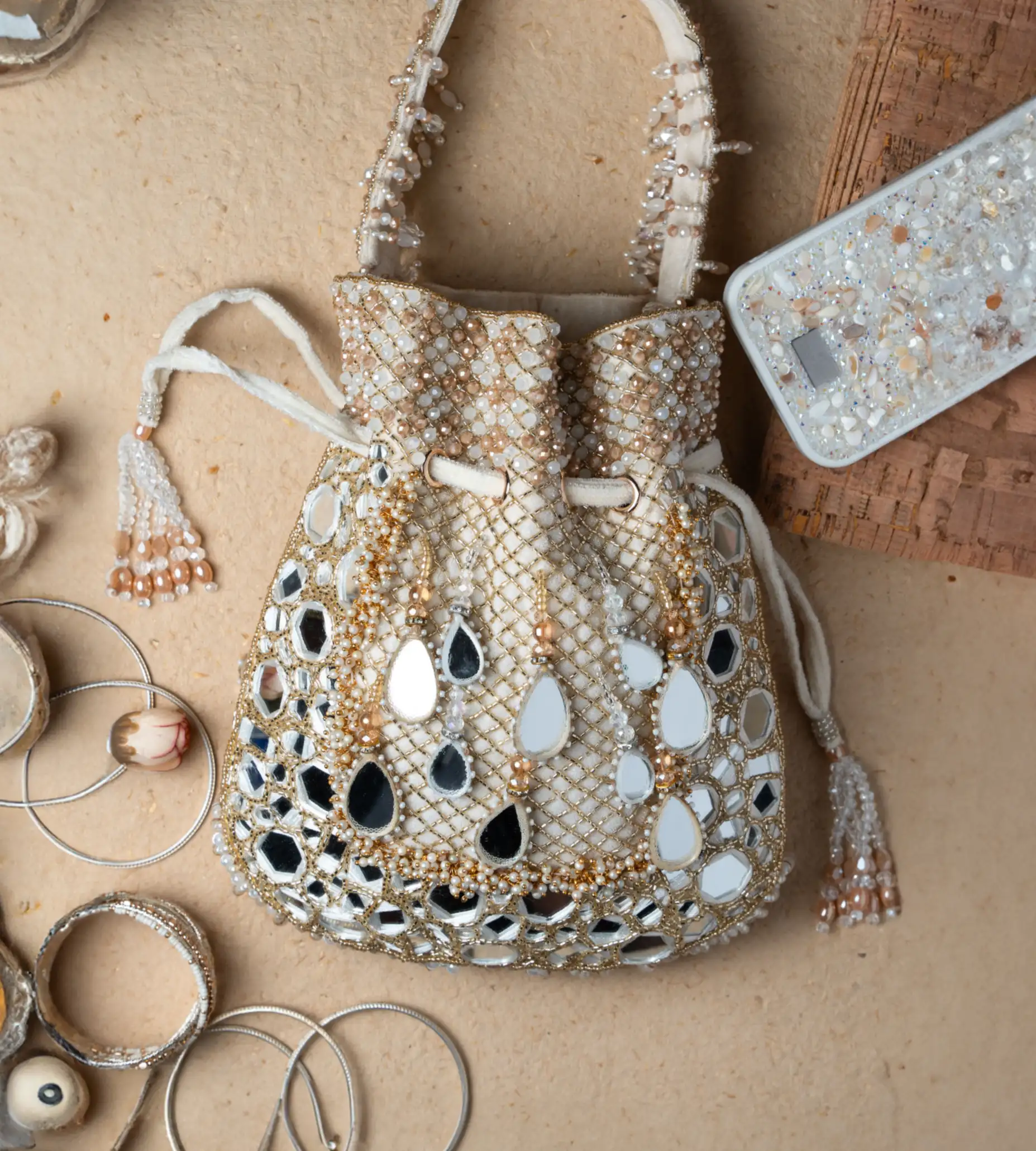 Ivory Mirror and Abla Work Potli with Pearl Finish and Tassel Detail