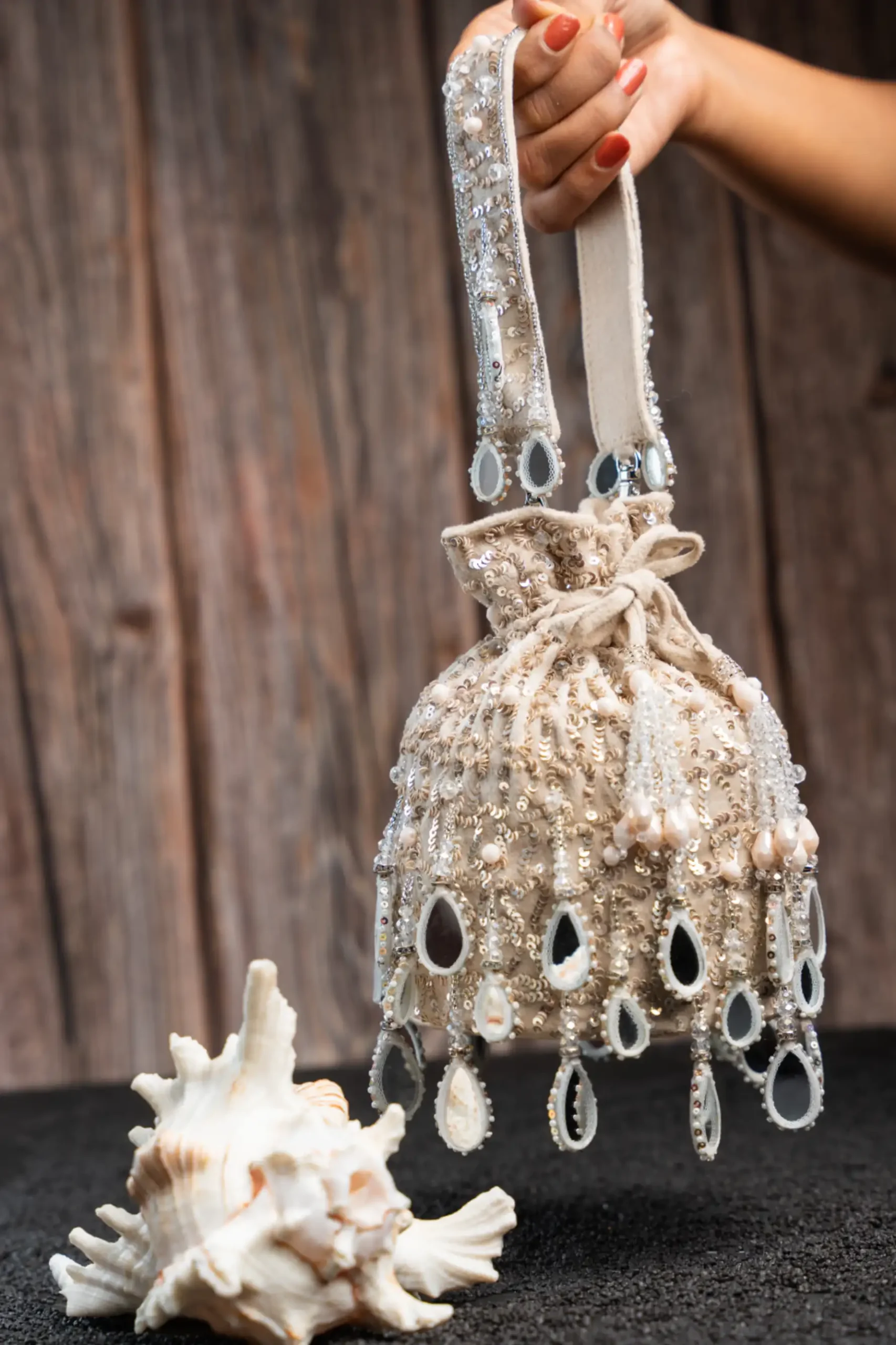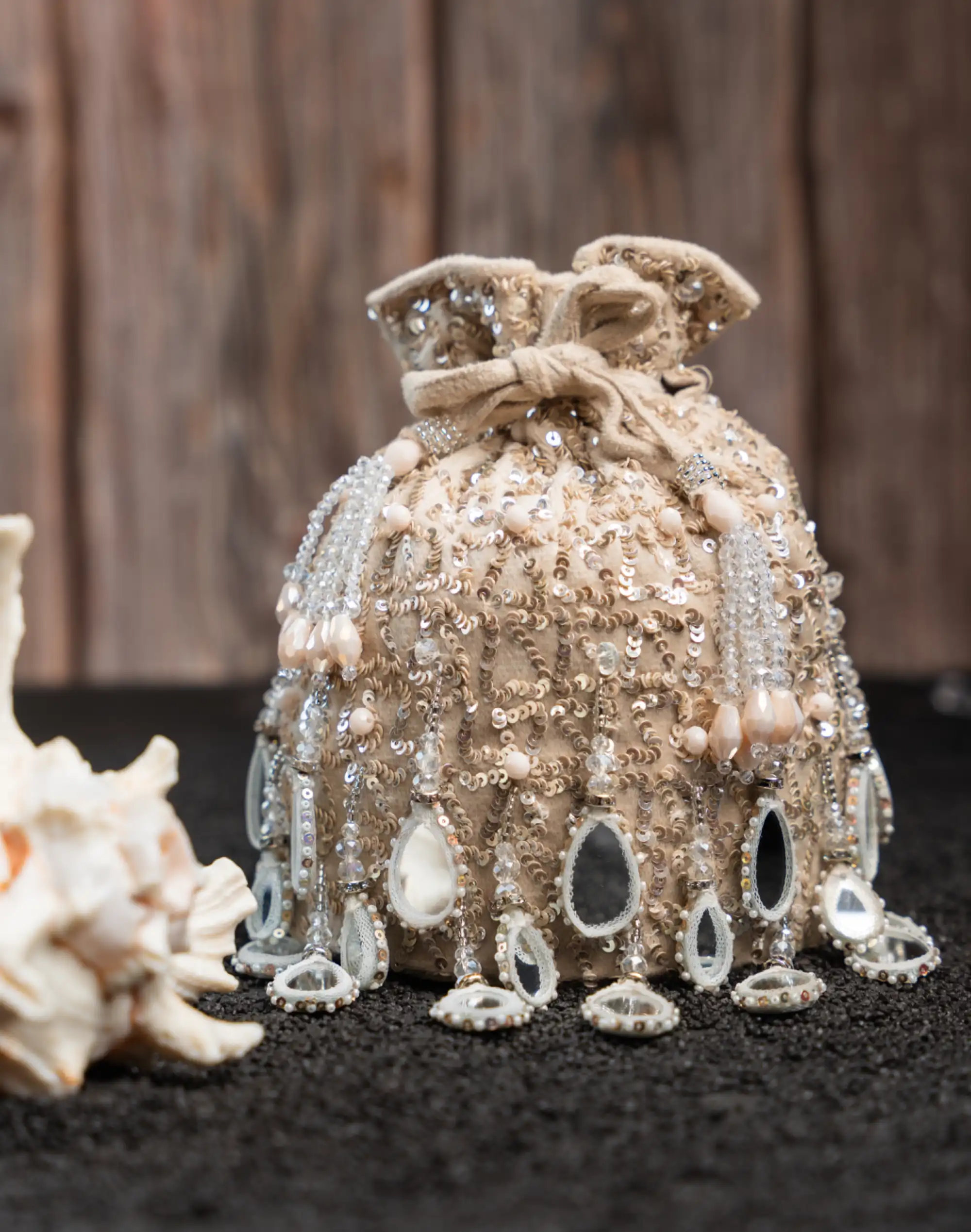 Pair this elegant ivory potli with embroidered sarees, pastel lehengas, or festive Indo-western ensembles. The mirror and bead detailing reflect light beautifully, while the playful tassels add graceful movement, making it a perfect accessory to complement statement jewellery and celebratory looks.