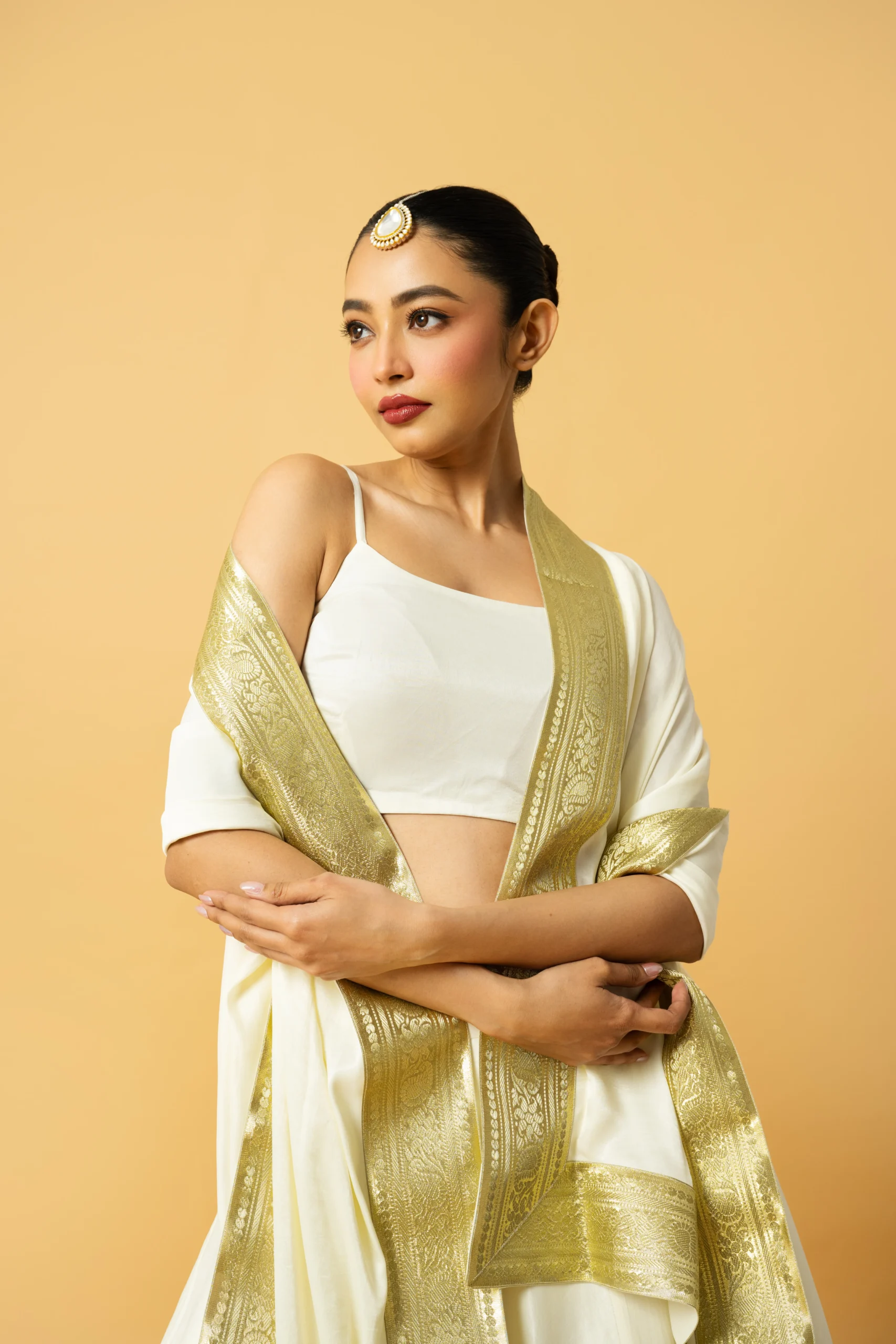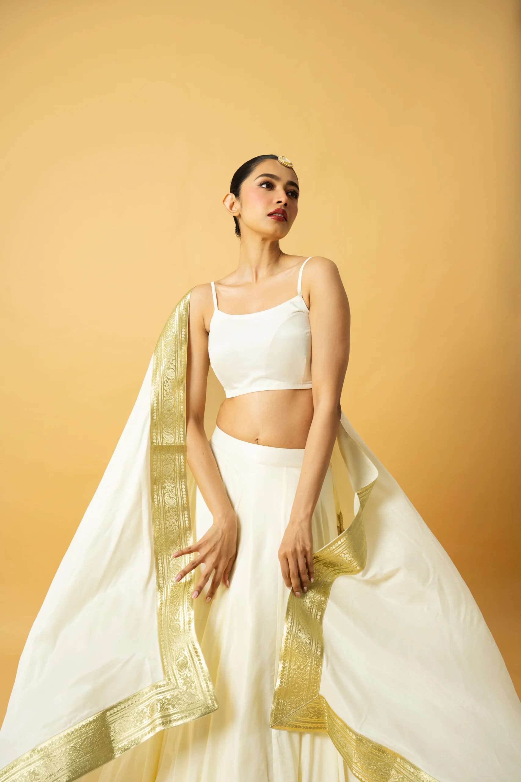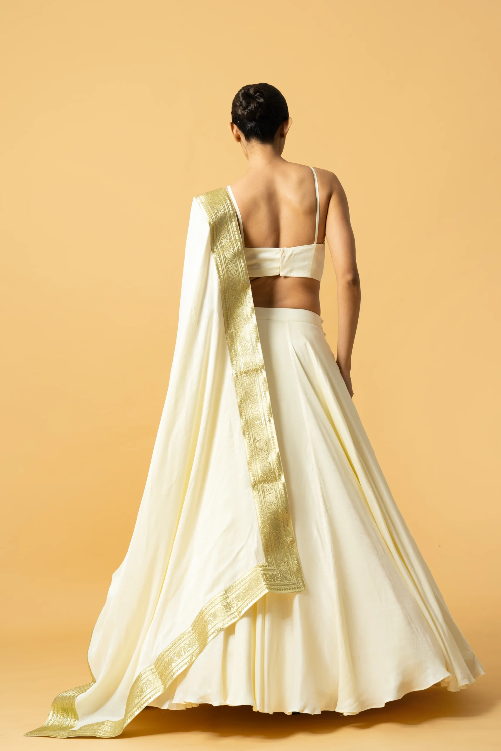 Ivory Modal Satin Lehenga Set with Sleeveless Blouse and Golden Lace Dupatta