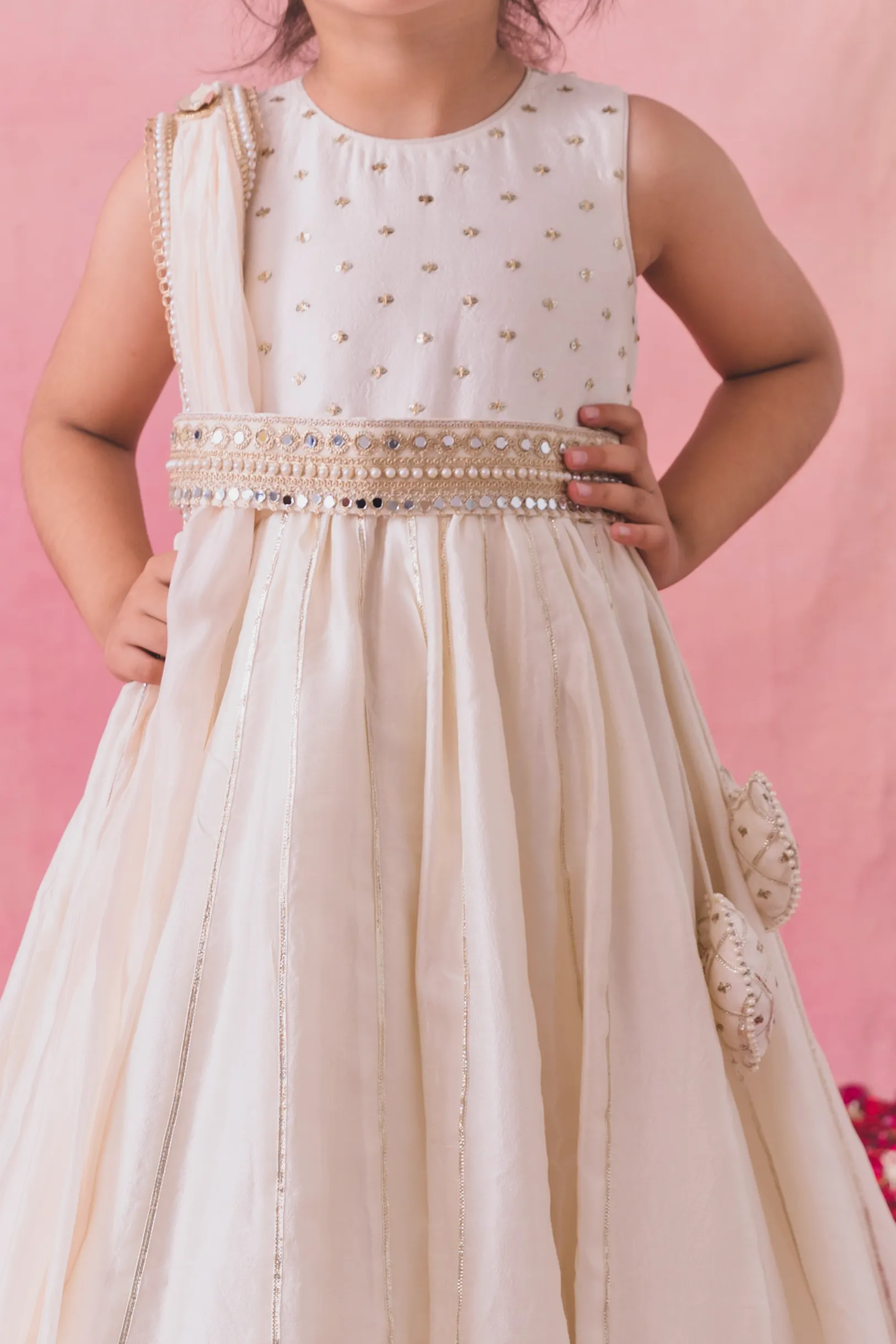 Style this elegant ivory ensemble with statement pearl or kundan jewelry to complement the detachable pearl belt. Opt for soft radiant makeup with defined eyes, subtle highlighter, and a nude or blush pink lip.