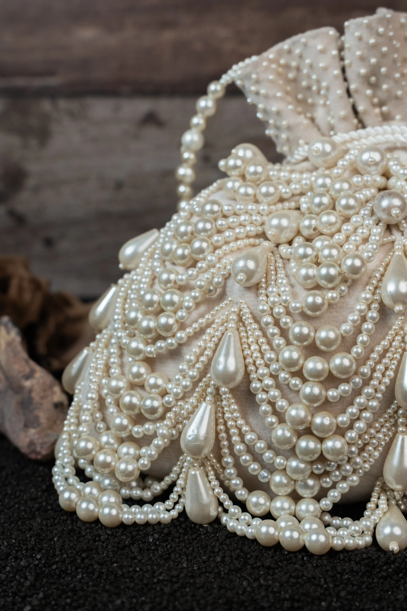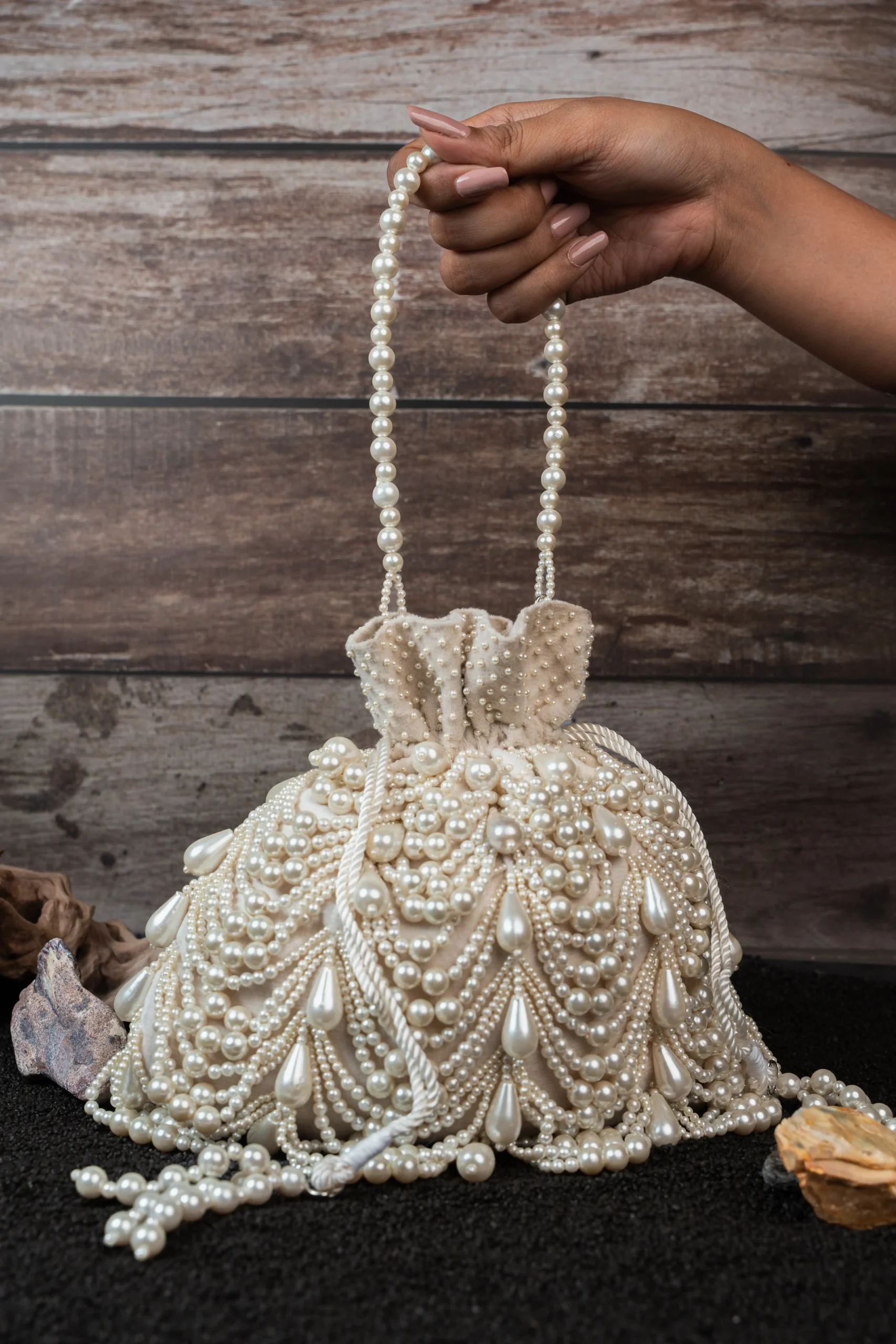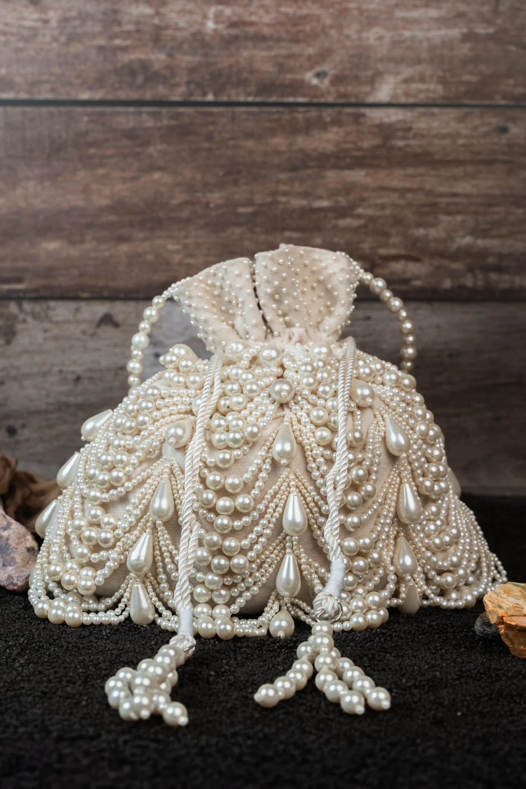 Ivory Pearl Embellished Velvet Potli Bag with Layered Pearls and Tassel Detail
