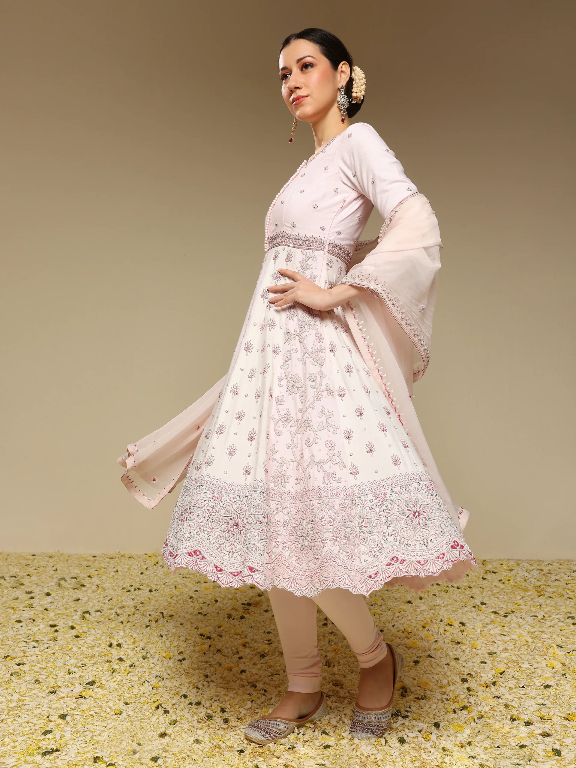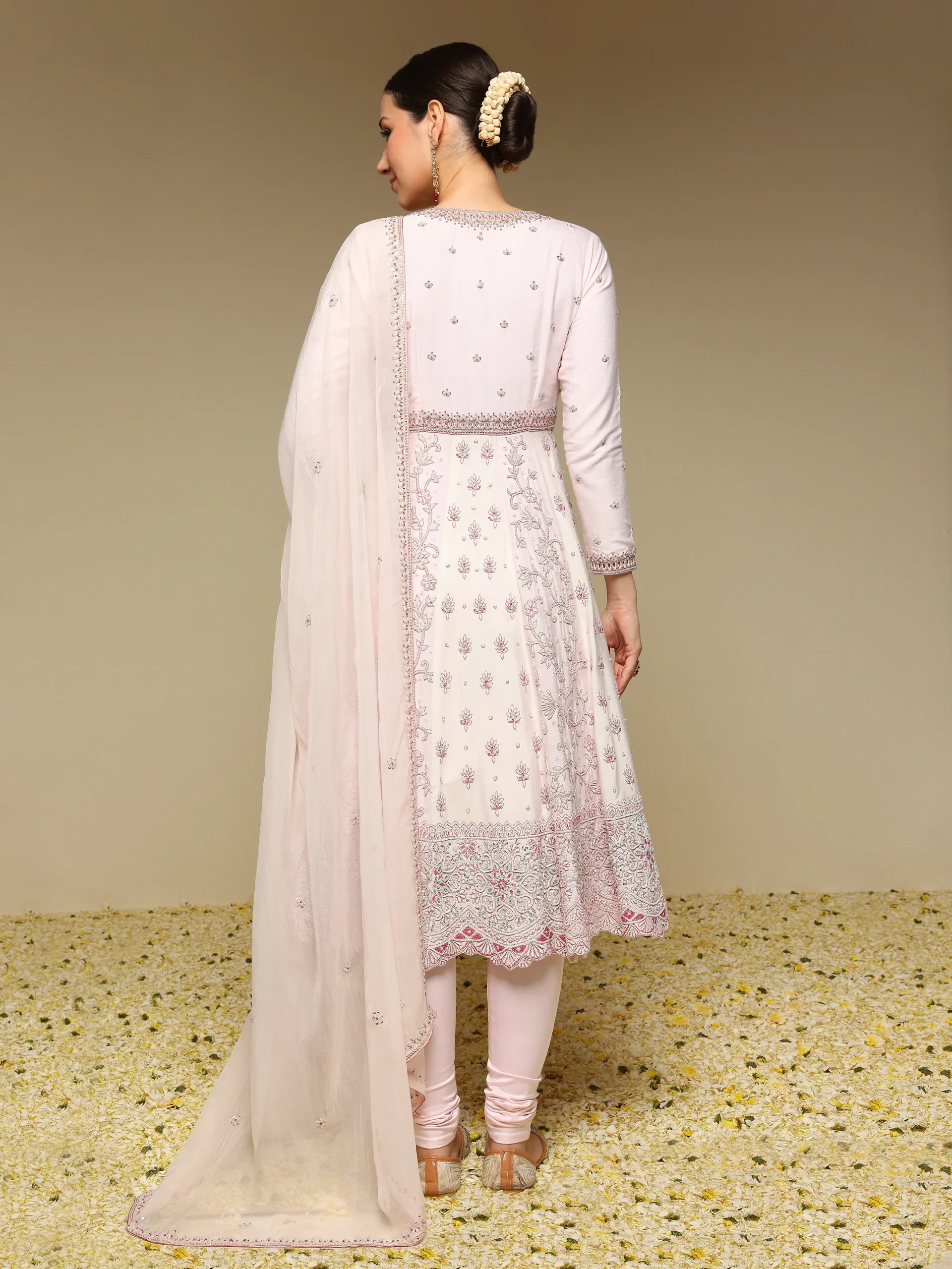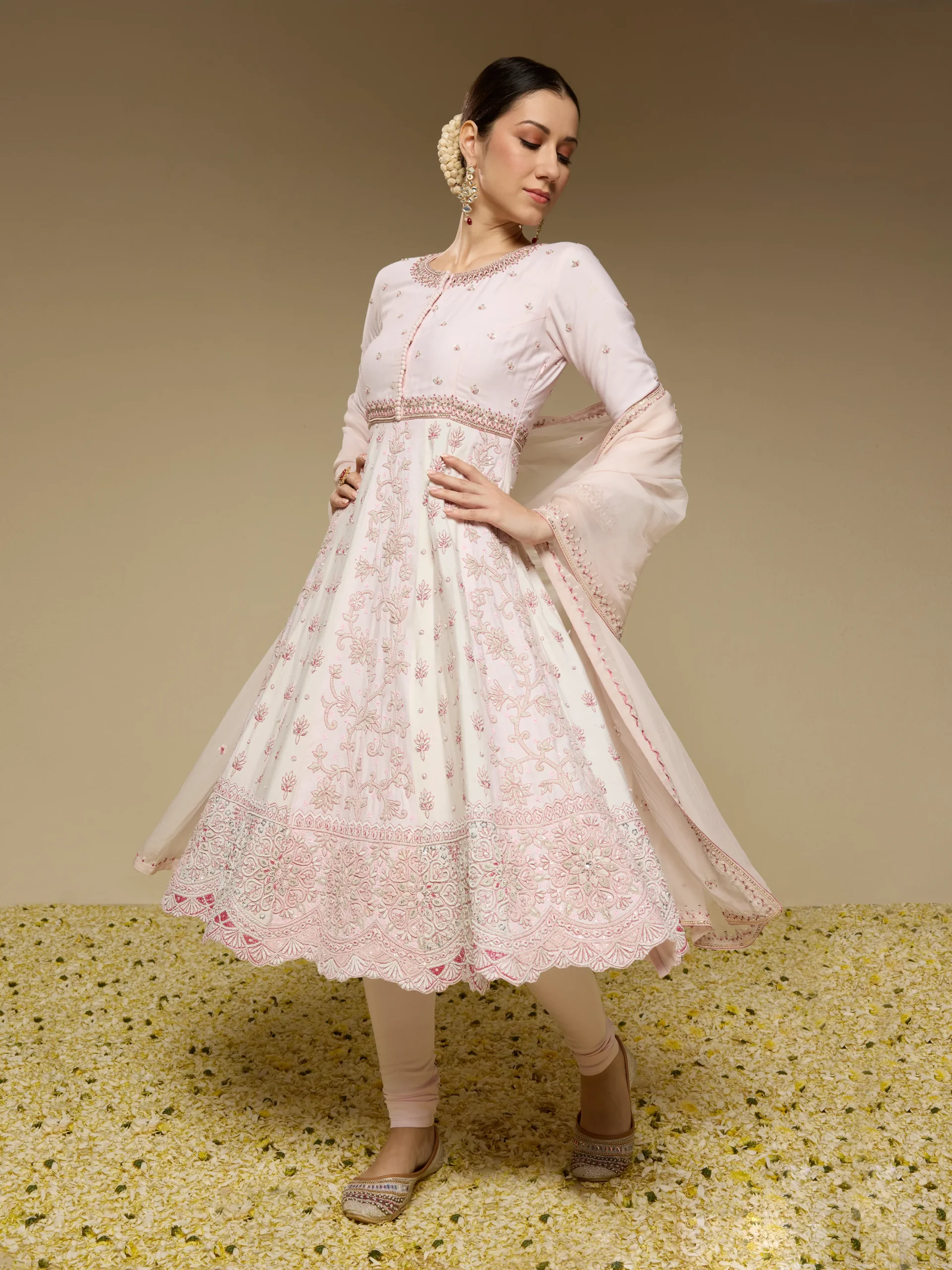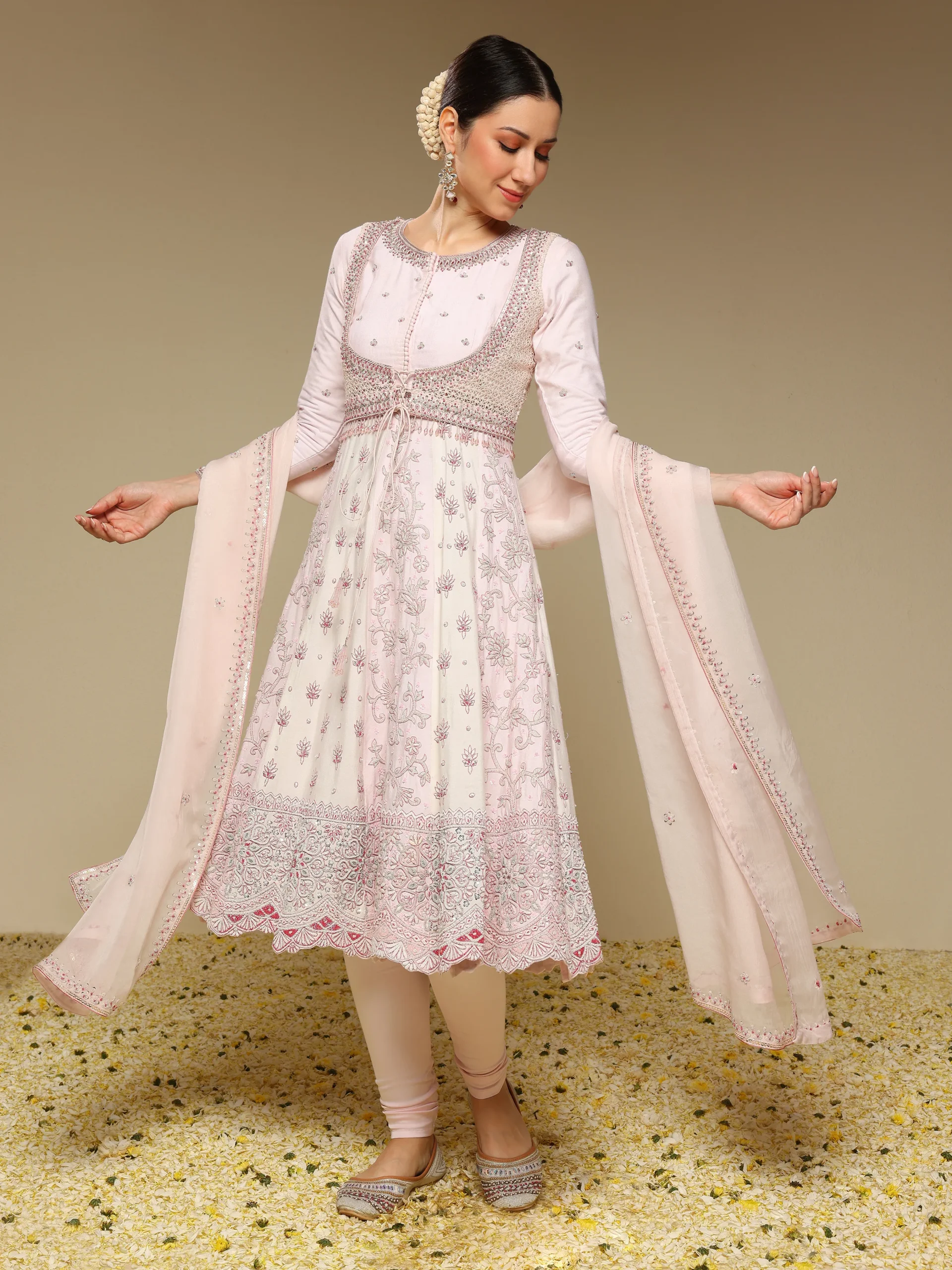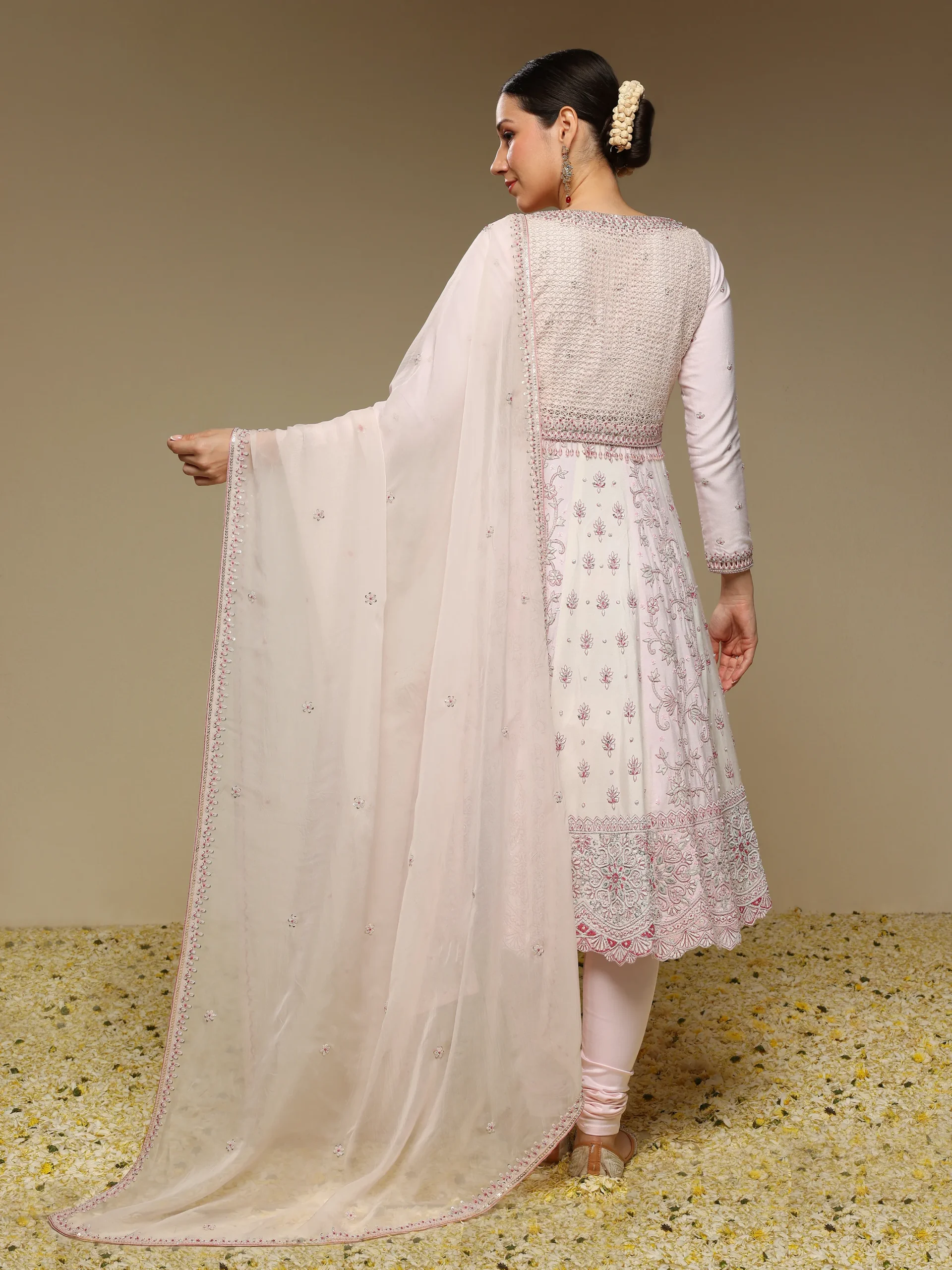Ivory Pink Panelled Kalidar Kurta Set with Jaali Jacket Organza Dupatta
