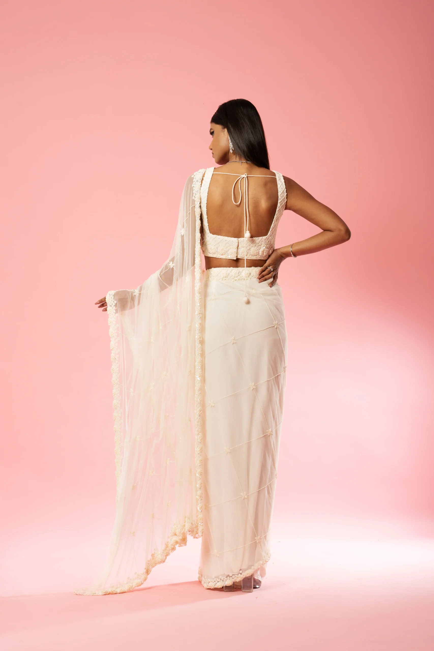 Introducing our graceful Ivory Pre-Stitched Saree, crafted in pure georgette and soft net for a light, fluid drape. Designed for effortless elegance, this contemporary silhouette offers ease of wear while maintaining a refined appeal. The blouse and pallu are adorned with intricate hand embroidery, adding delicate texture and subtle shimmer. Perfect for weddings, receptions, and festive occasions, this saree beautifully blends timeless charm with modern sophistication.