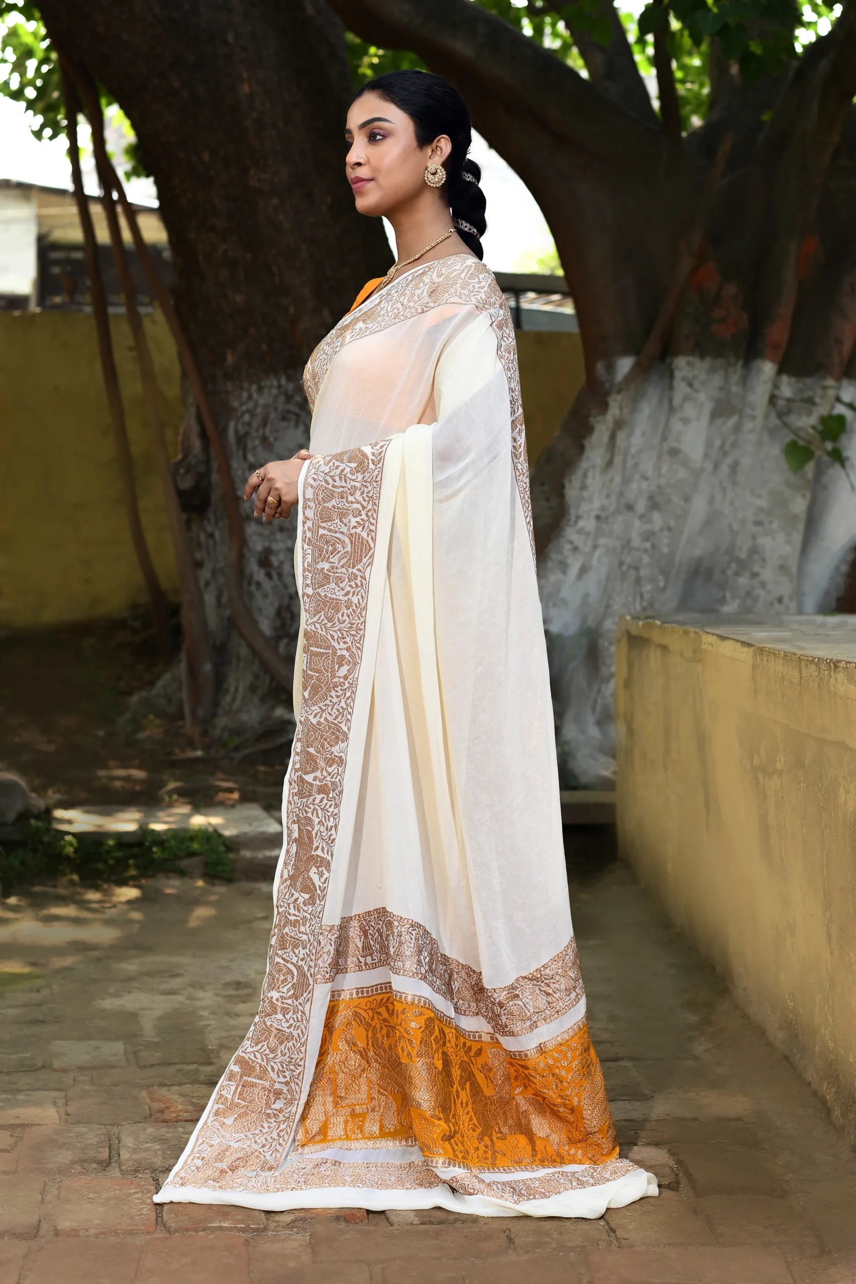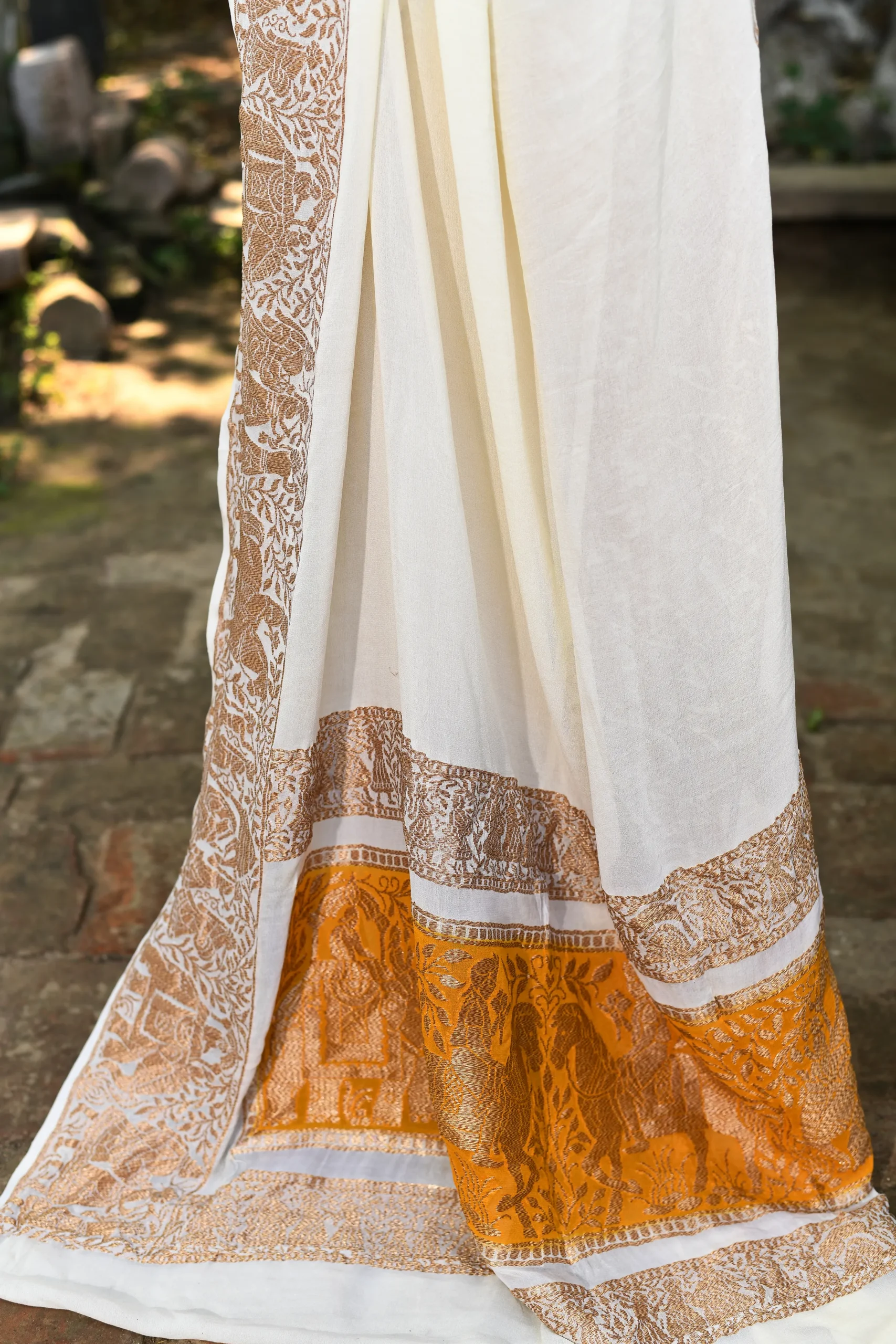 Ivory Banarasi Crepe Chiffon Silk Saree with Gold Zari & Mustard Border