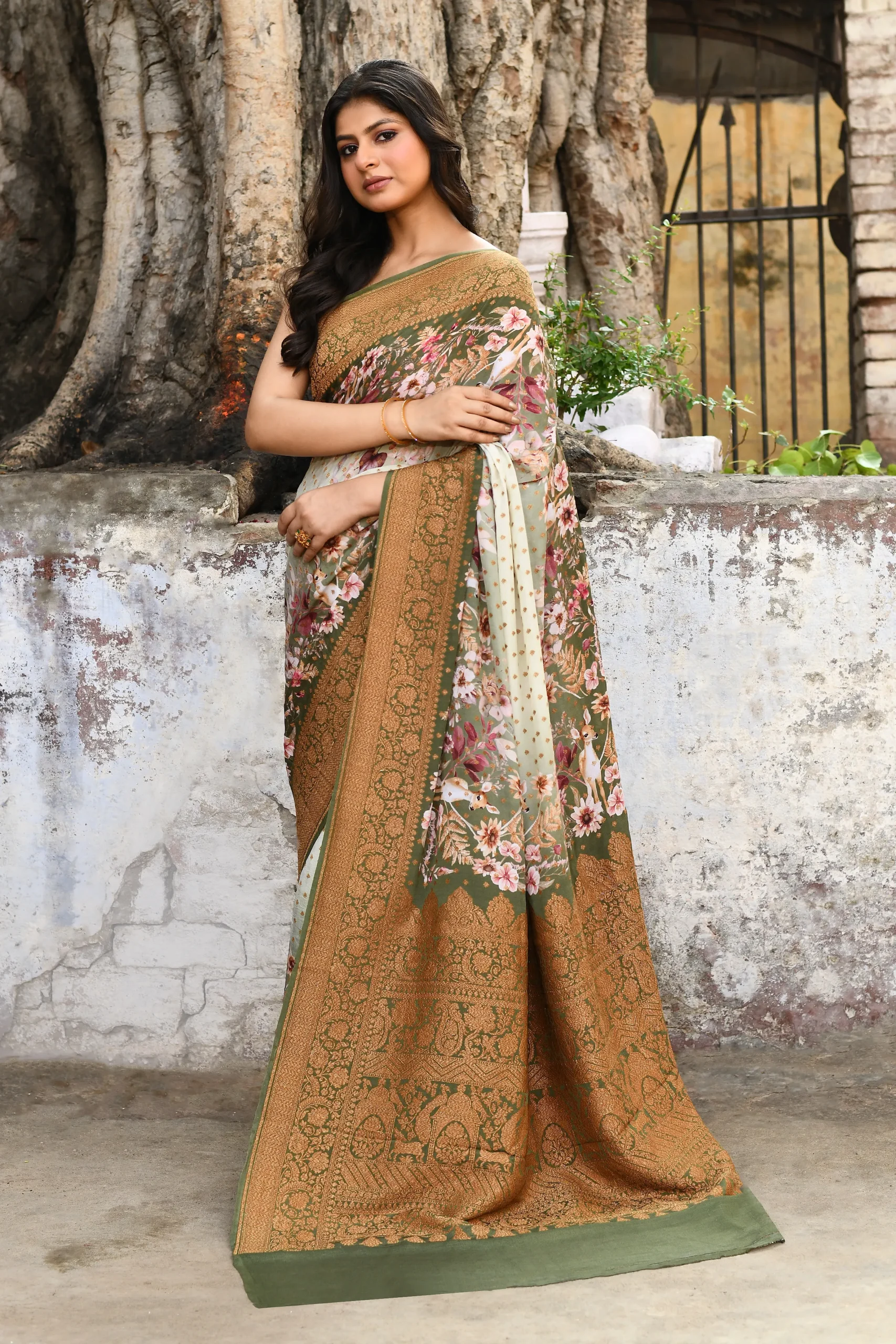 Ivory Pure Crepe Silk Saree with Floral Prints and Olive Gold Border