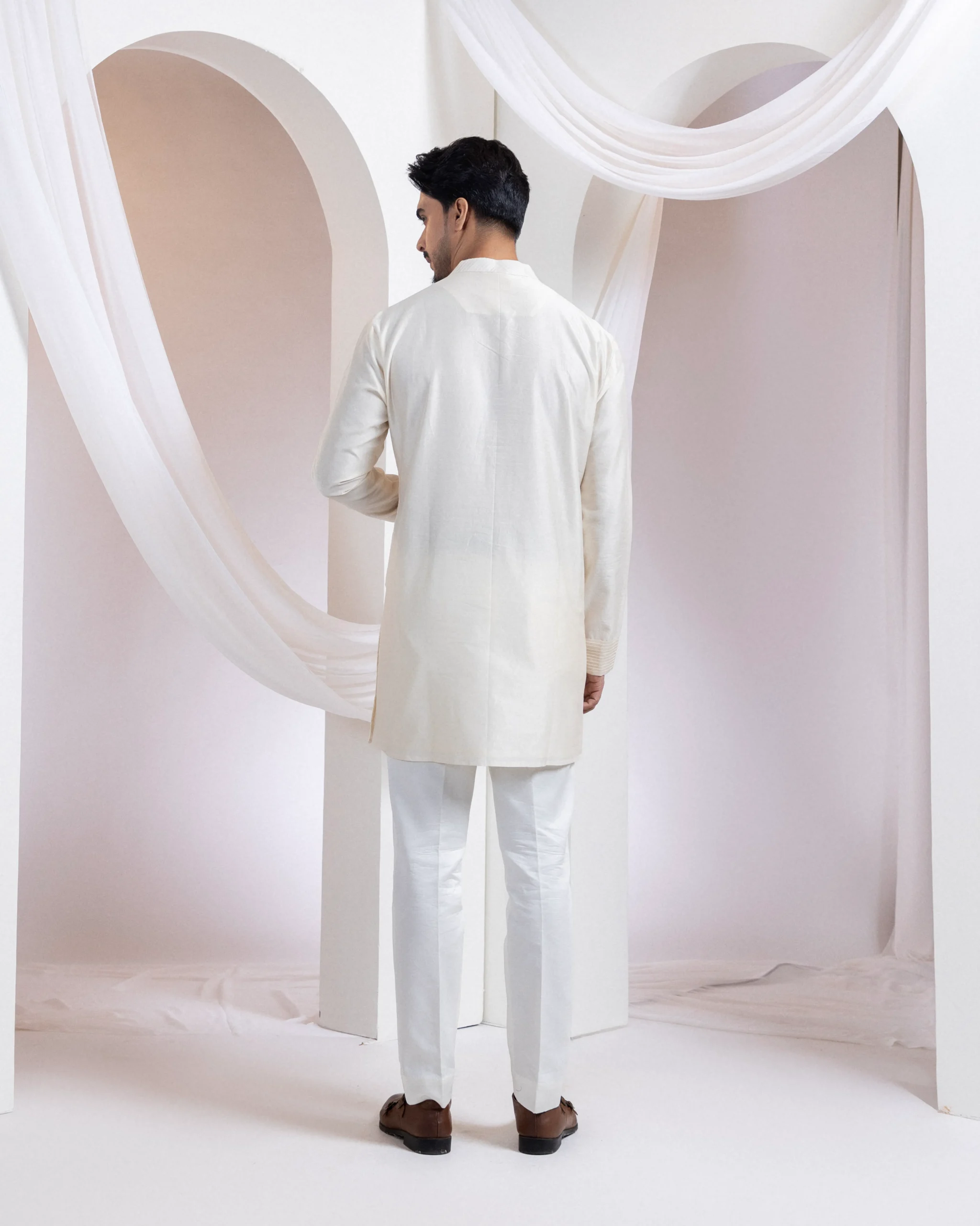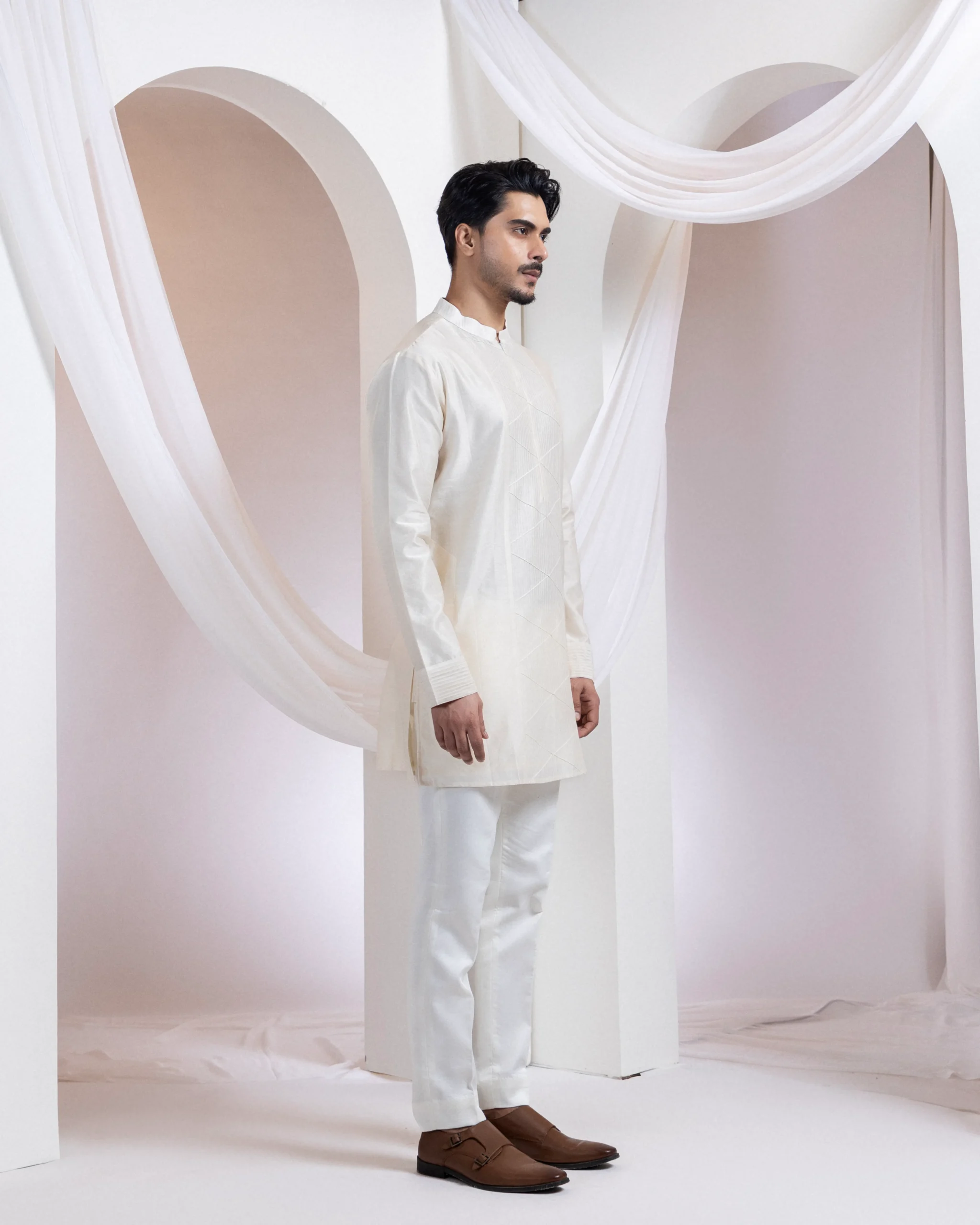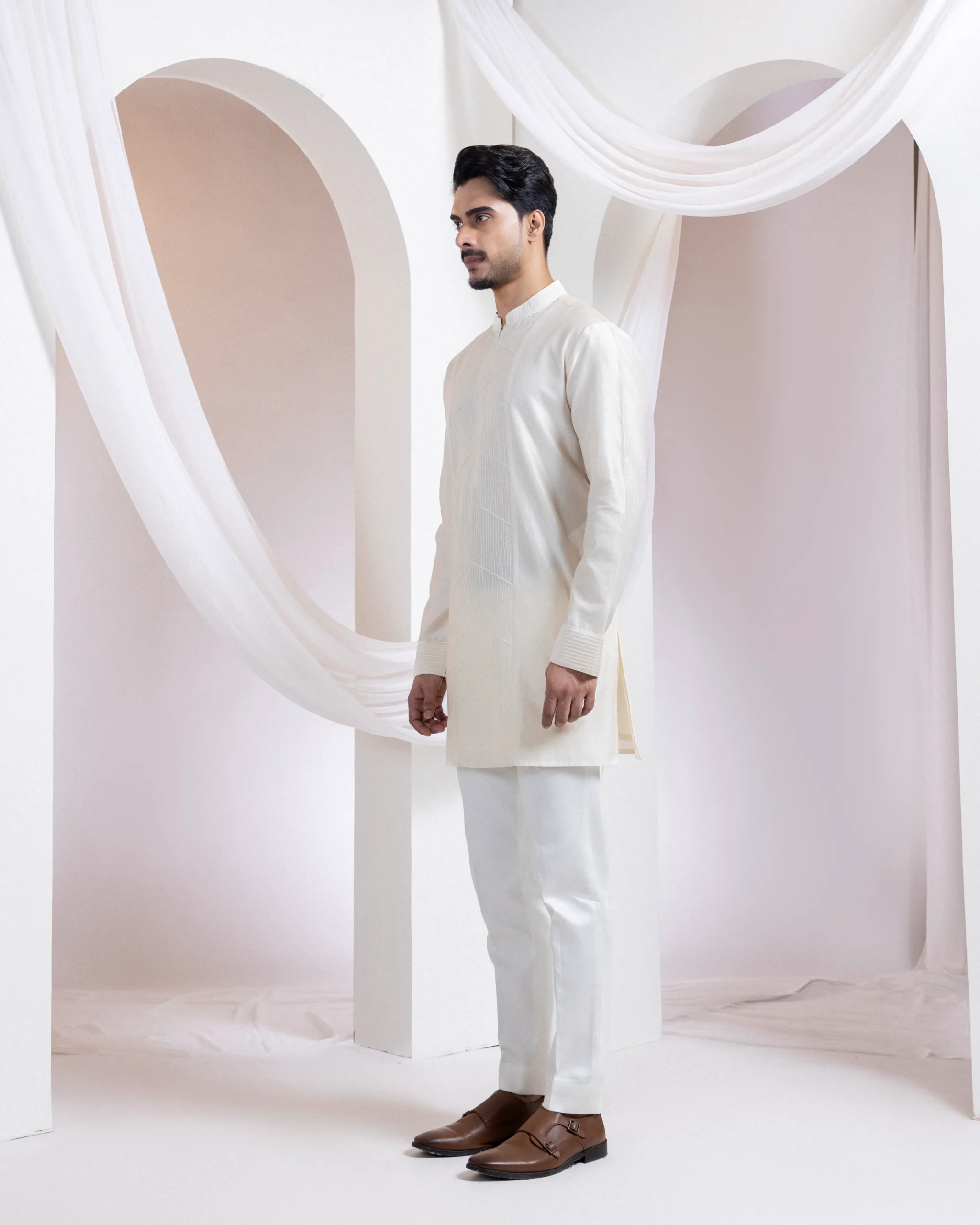 Introducing a contemporary two-piece set featuring an ivory straight kurta paired with coordinating pants. Designed with modern minimalism, the kurta highlights tone-on-tone linear thread embroidery forming a sleek geometric front panel, while refined horizontal pintucks detail the sleeves. Clean lines and structured elegance make it ideal for festive and elevated casual occasions.