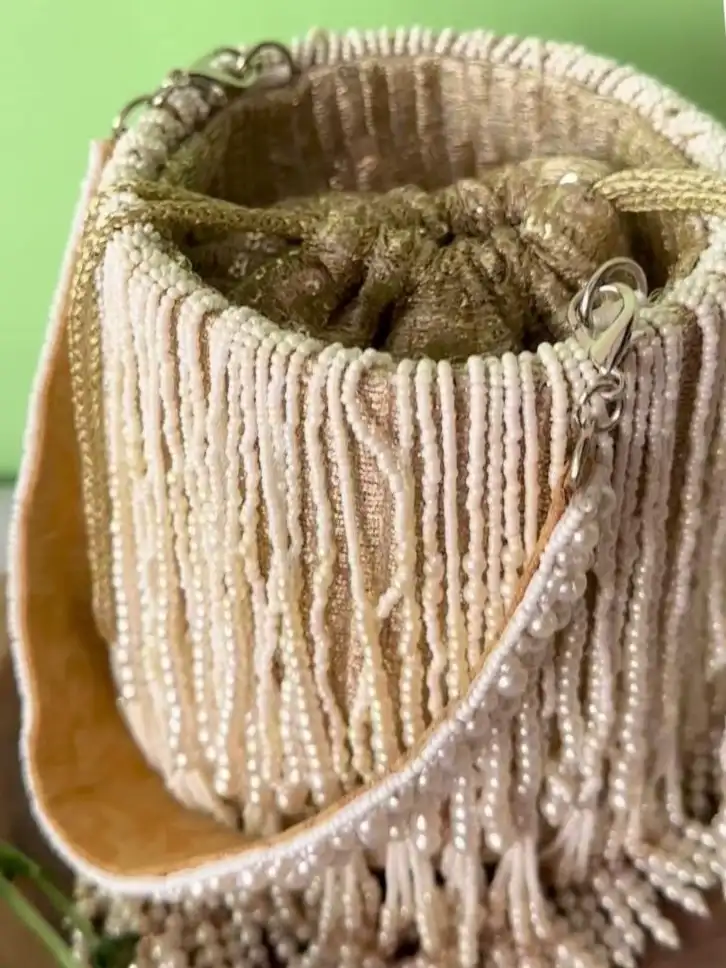 Introducing an elegant ivory suede potli designed to bring refined sophistication to your festive and occasion wear. Crafted on a soft suede base, it offers a luxurious texture that enhances its timeless appeal. Delicate pearl tassels add graceful movement and a touch of glamour, making it a standout accessory for special occasions. Perfect for weddings, festive celebrations, and elegant evenings, this potli pairs effortlessly with both traditional and contemporary ensembles.