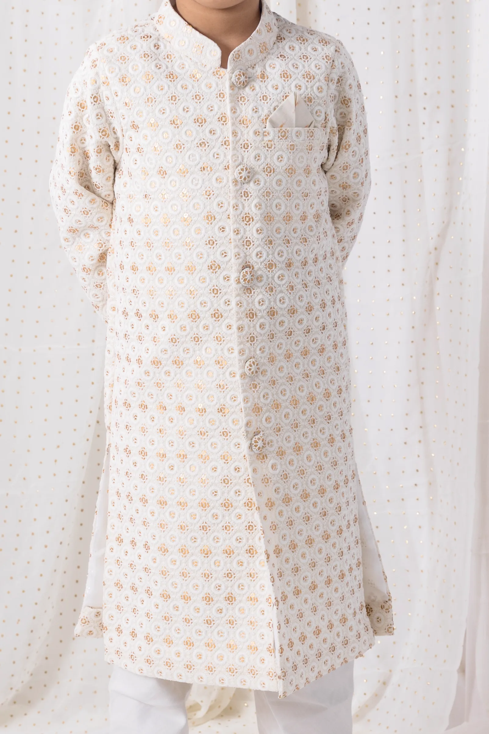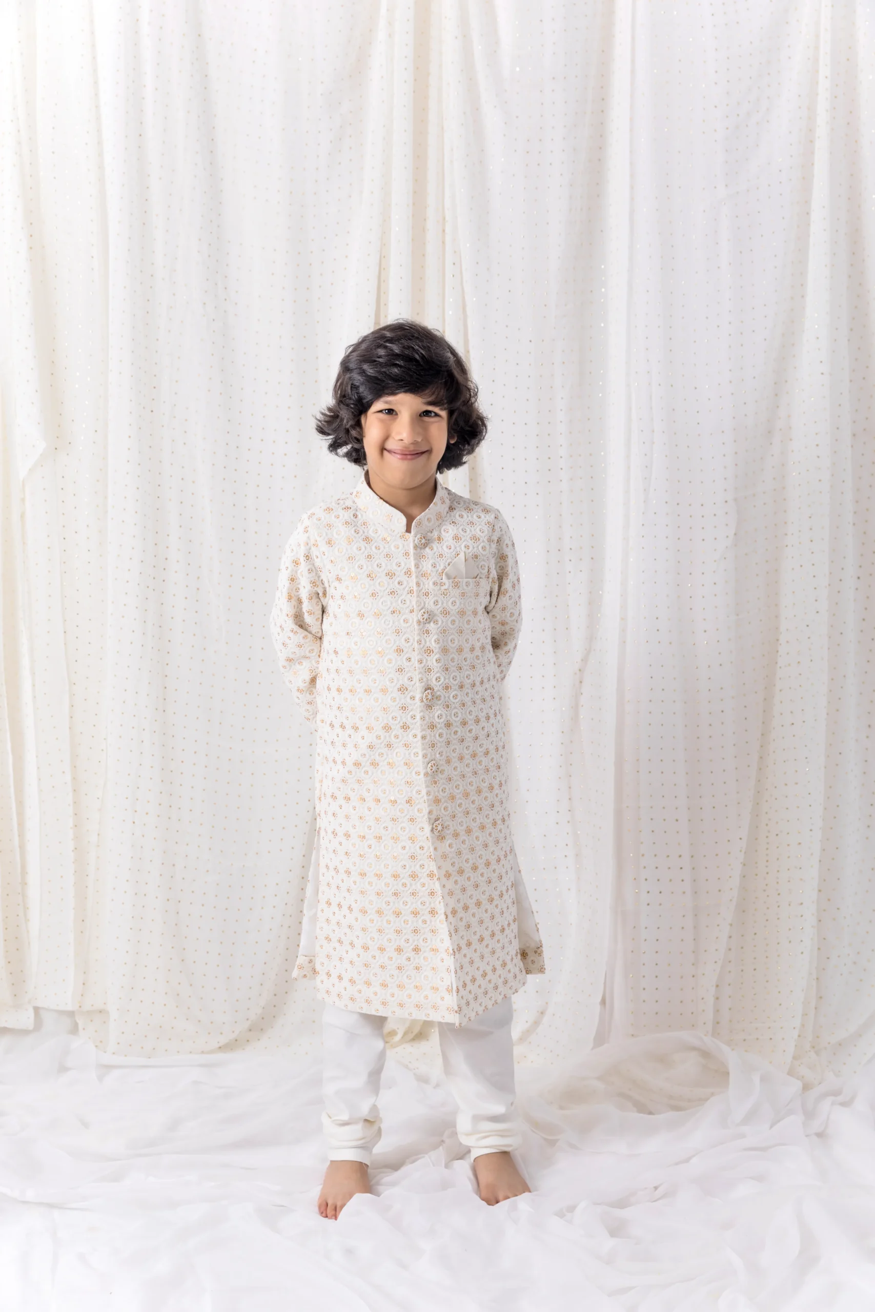 Ivory Thread & Sequin Embroidered Sherwani with Cotton Silk Pants for Boys