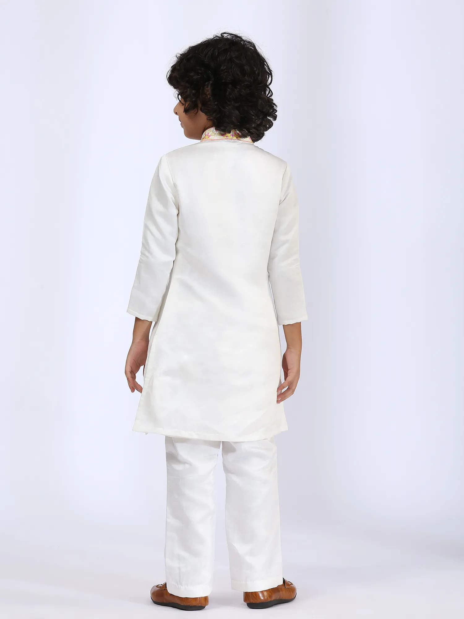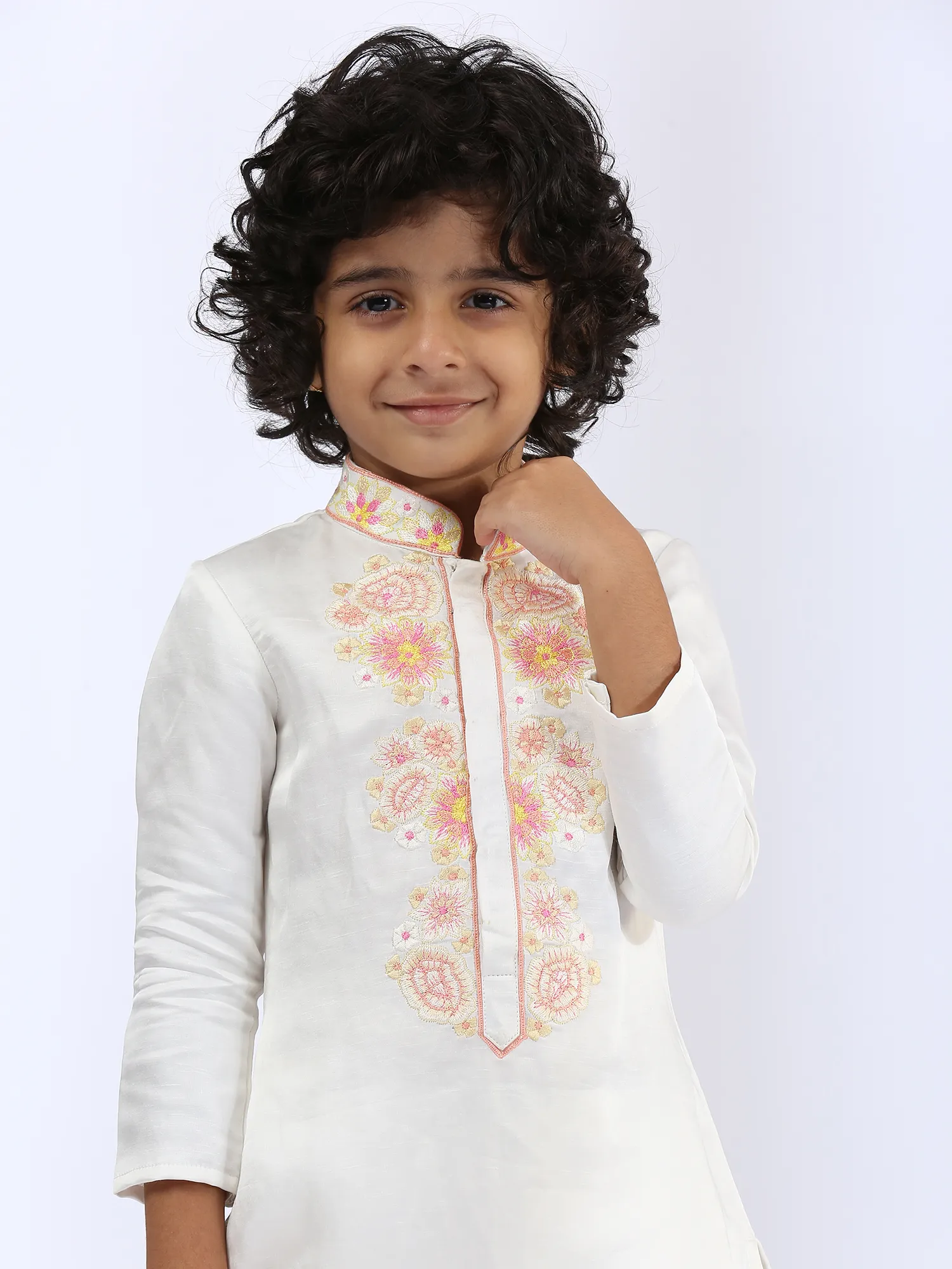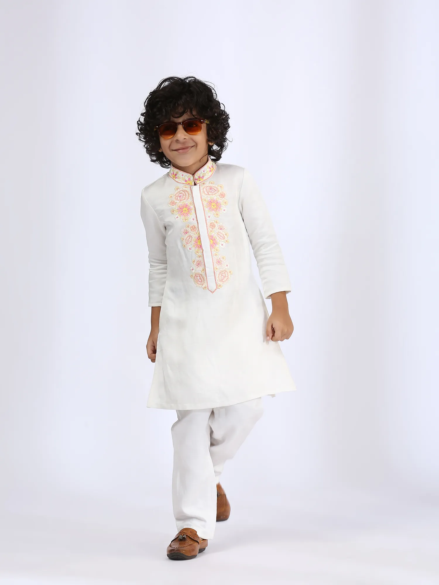 Introducing the Ivory Threadwork Embroidered Kurta Set with Matching Narrow Pants, crafted in premium satin linen for a soft and breathable feel. Featuring delicate thread embroidery on the collar and around the placket, this elegant ensemble offers a refined ethnic look, perfect for festive occasions, weddings, and celebrations.