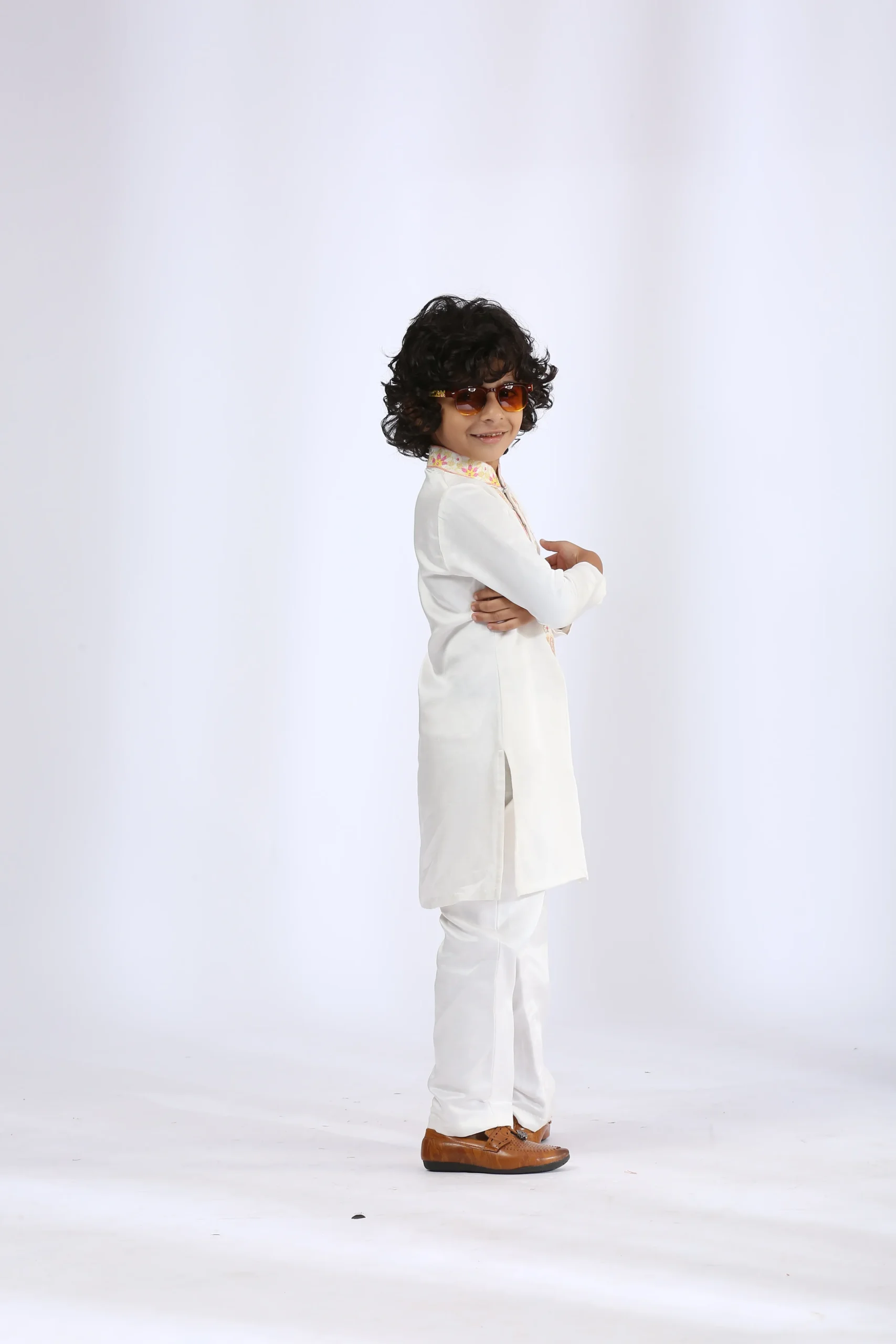Style this ivory embroidered kurta set with traditional mojris or sandals for a polished ethnic look. For festive occasions and weddings, pair it with a lightweight Nehru jacket to enhance the overall appeal. Keep accessories minimal to let the intricate threadwork and elegant ivory tone stand out beautifully.