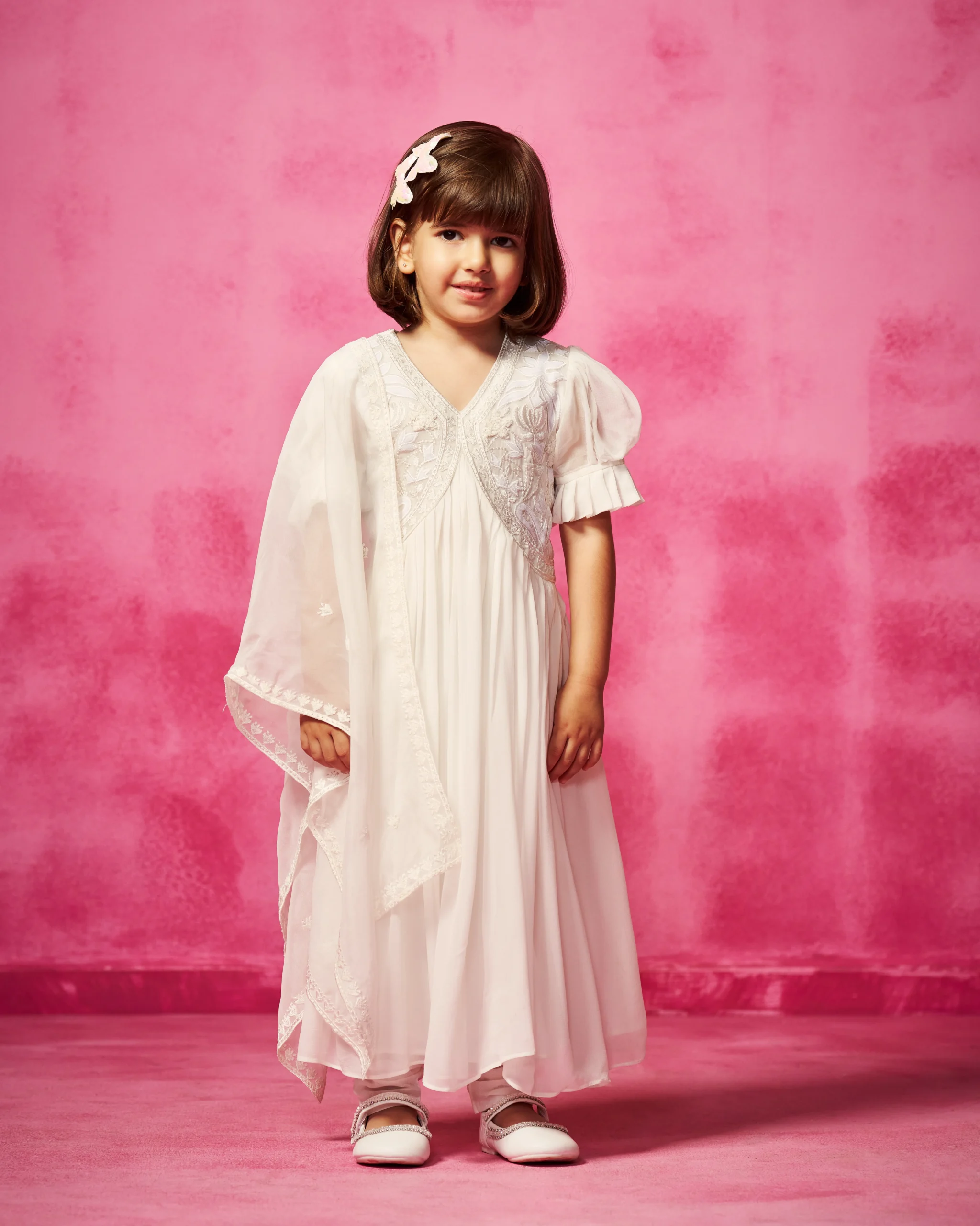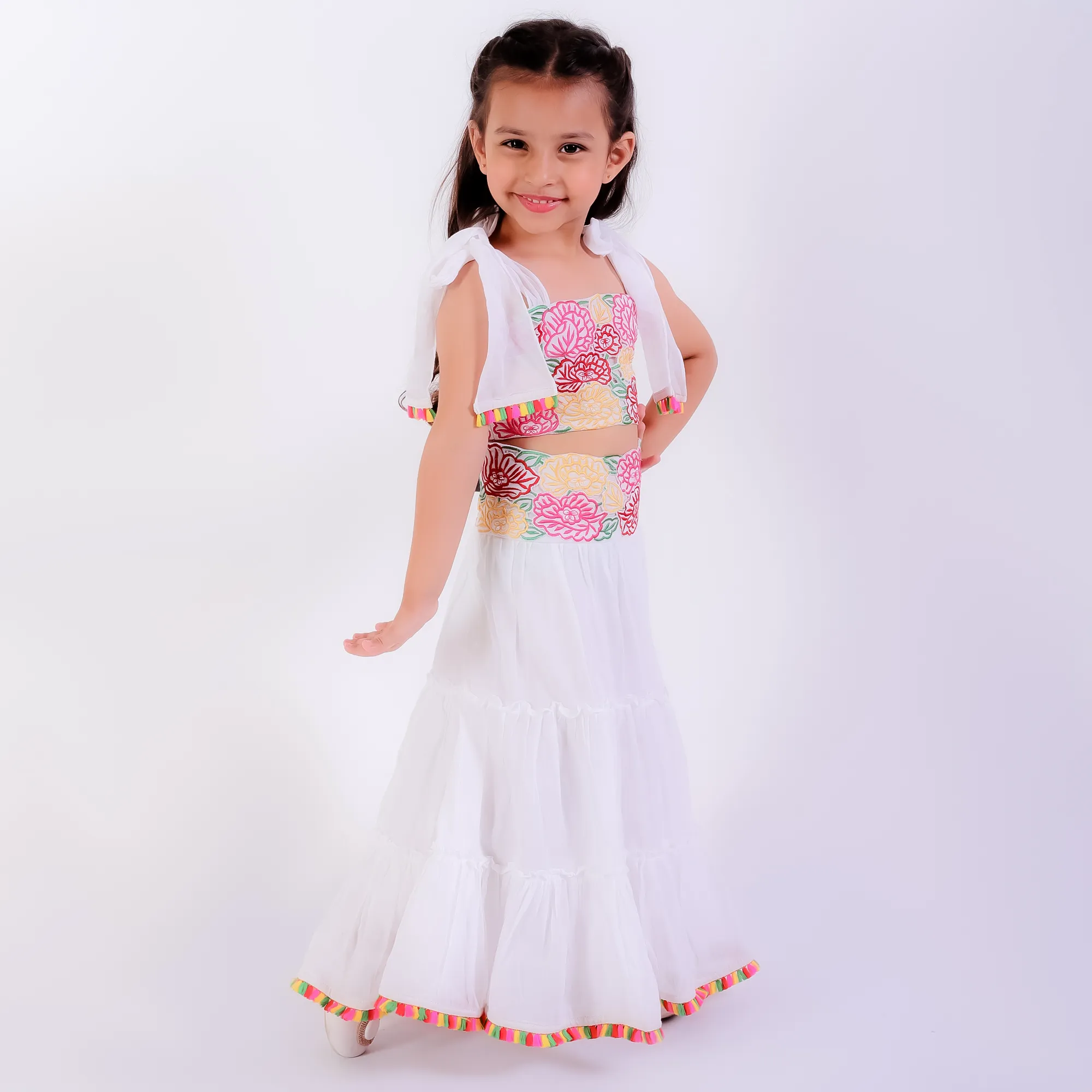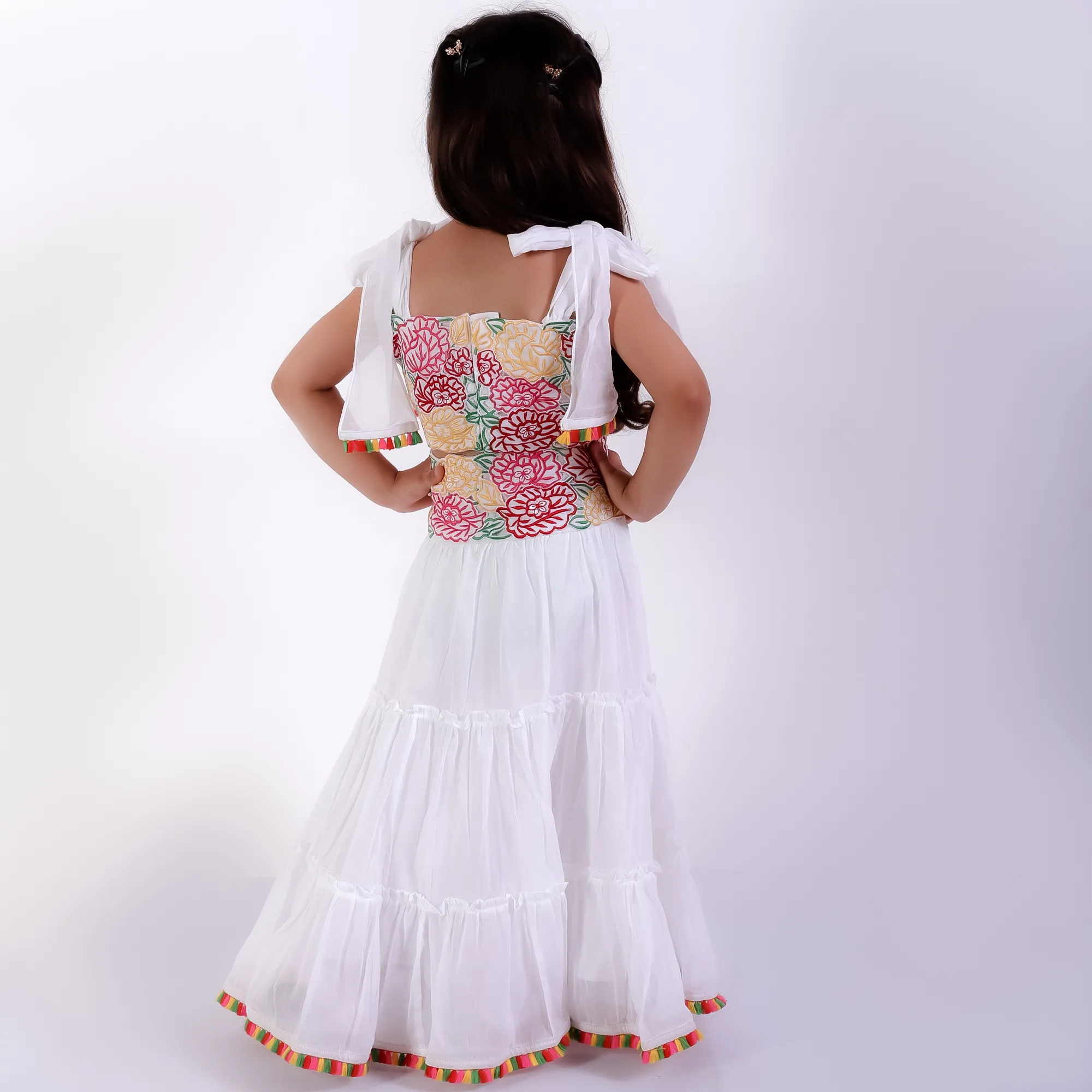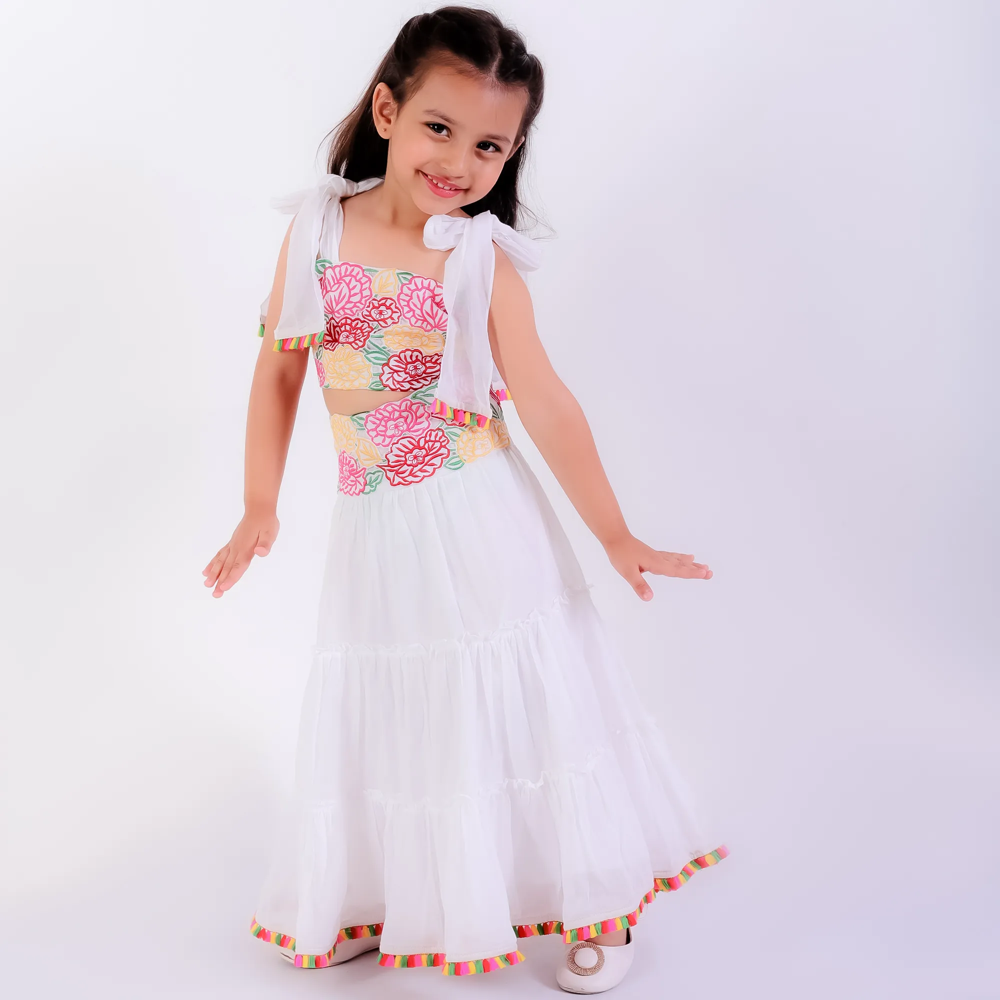 Introducing a charming Ivory Tiered Lehenga Set with Multicolored Embroidery for girls. Crafted in soft cotton mul, this delightful lehenga choli features vibrant thread and cutwork embroidery on the choli and yoke of the lehenga. Perfect for festive celebrations, family gatherings, summer occasions, and playful ethnic wear.