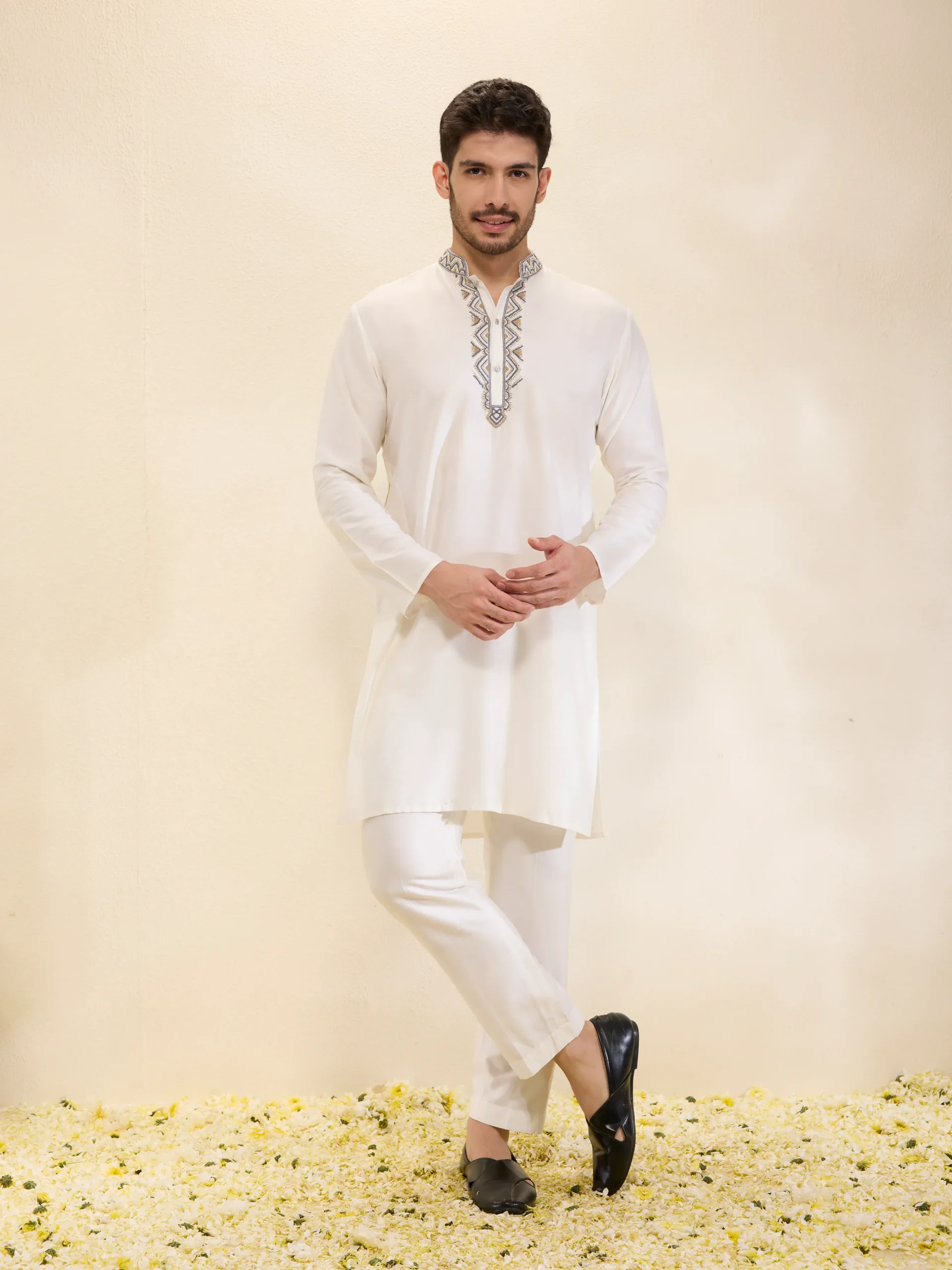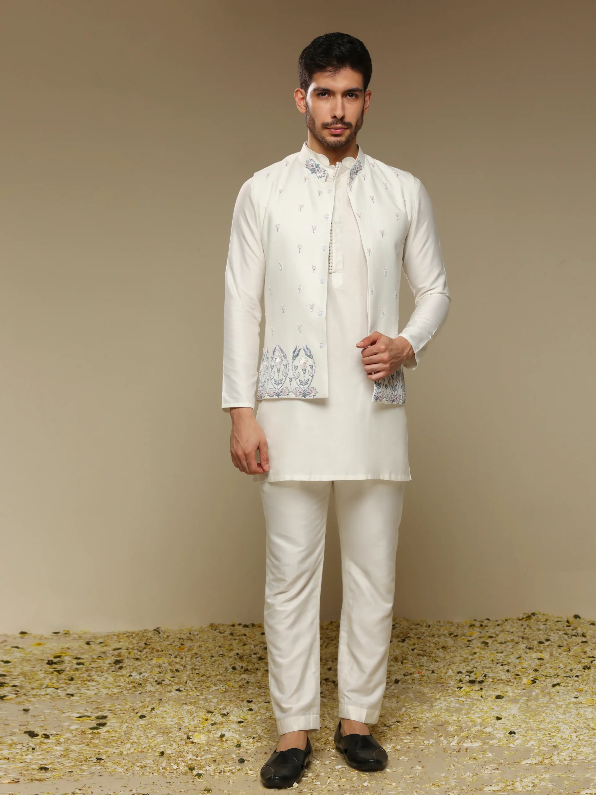 Style this ivory lehenga set with comfortable juttis or embellished sandals for a festive look. Pair it with colorful hair accessories or a simple hairband to enhance the vibrant embroidery. Minimal jewelry like small studs or a delicate bracelet will complete the cheerful ethnic appearance.