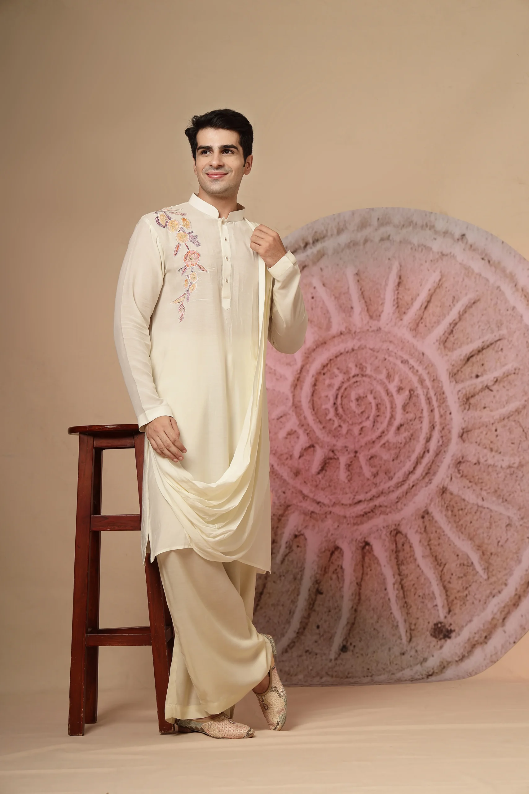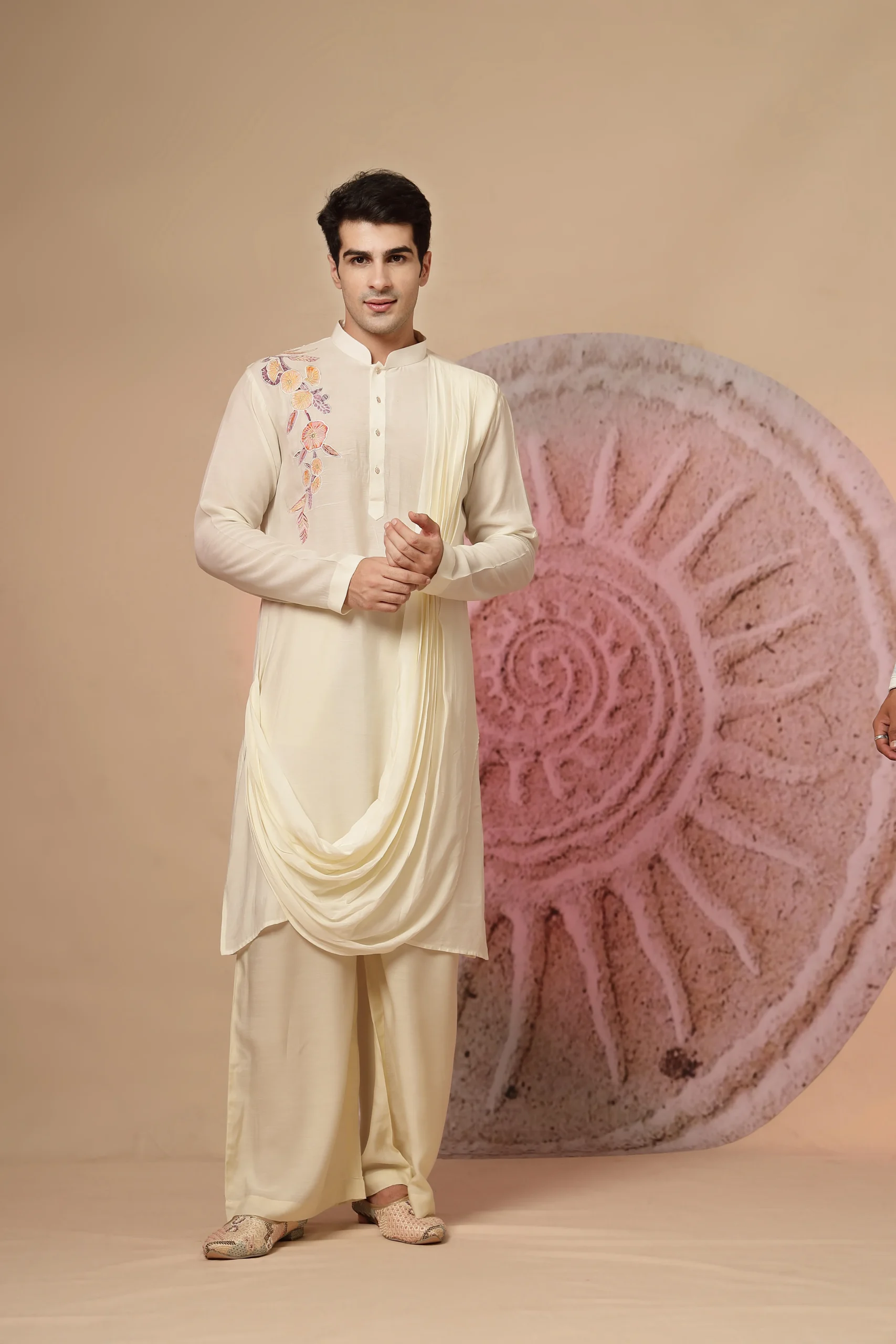 Style this ivory white draped cowl kurta set with beige or tan mojaris for an elegant festive look. Keep accessories minimal—such as a sleek watch or delicate bracelet—to complement the fluid drape and subtle embroidery.