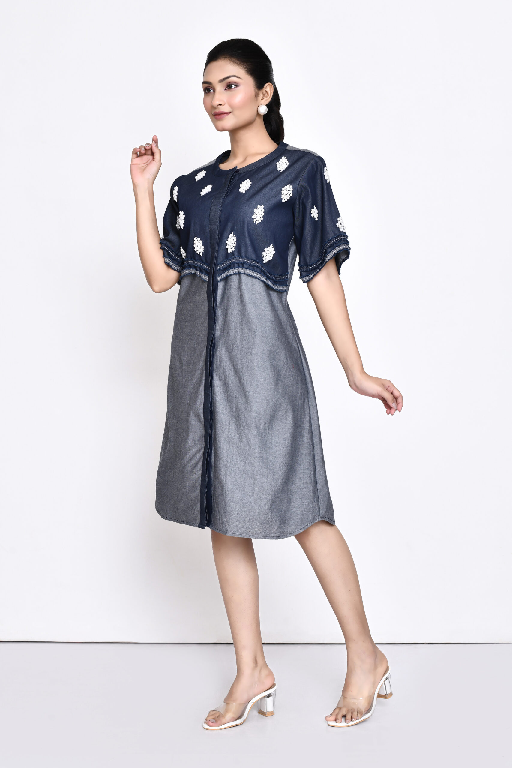 Introducing a stunning two-tone denim dress, a perfect blend of style and sophistication. This eye-catching piece features unique denim and pearl embellishments that add a touch of elegance to its casual silhouette.