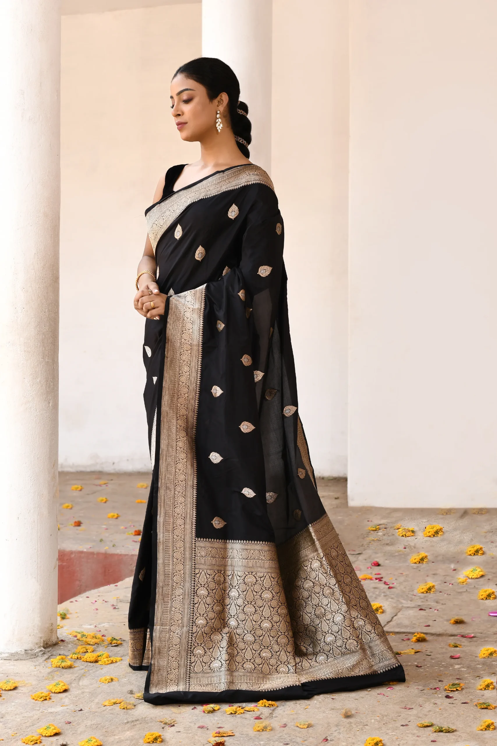 Jet Black Banarasi Katan Silk Saree with Gold Zari Butas