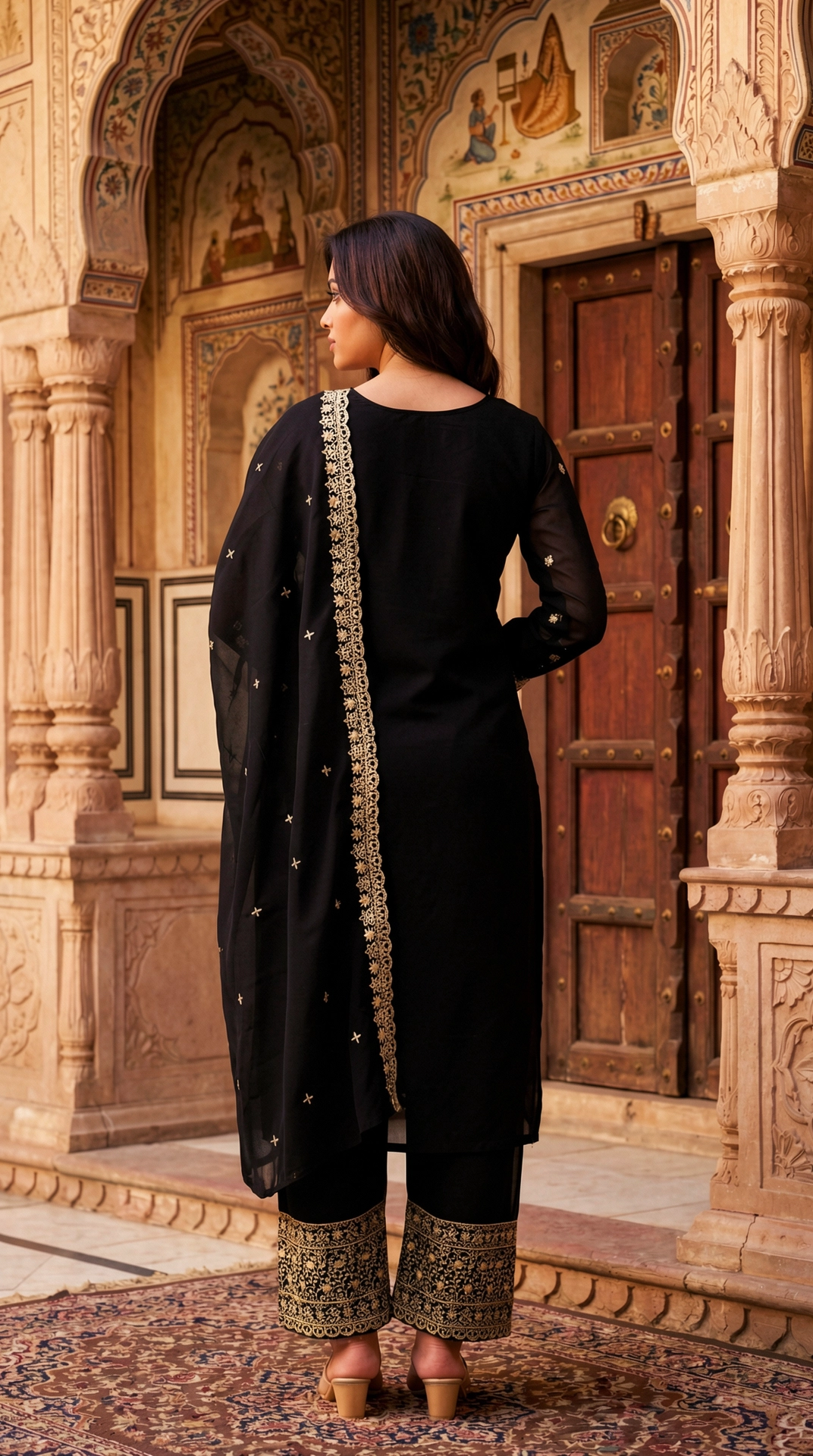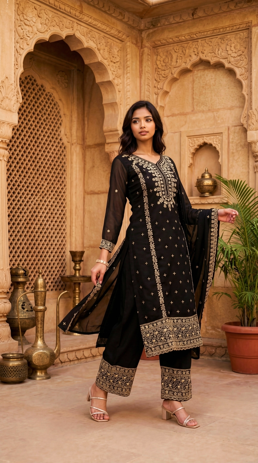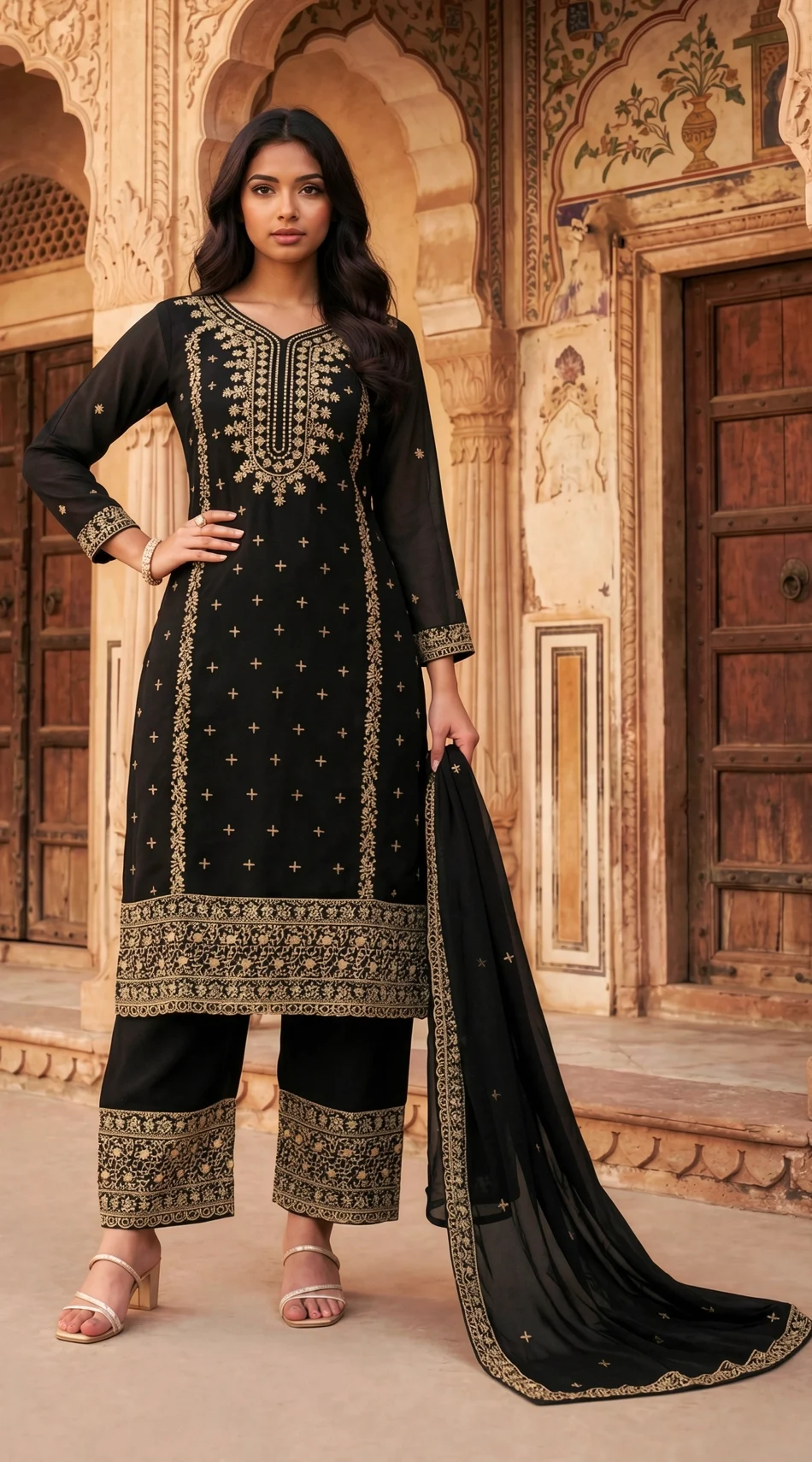 Introducing a refined three-piece ethnic ensemble in jet-black georgette, crafted for elevated festive occasions. The straight-cut kurta features intricate golden zari and thread embroidery with a graceful V-neckline and sheer full sleeves adorned in floral and geometric motifs. Paired with wide-leg palazzo pants showcasing a richly embroidered hem and a matching lightweight dupatta, this ensemble blends timeless craftsmanship with modern elegance—ideal for weddings and evening celebrations.