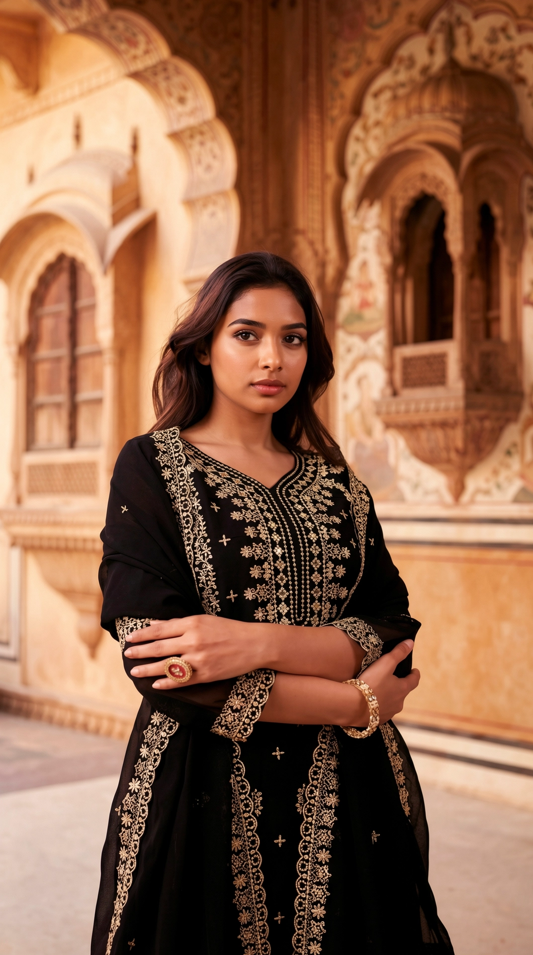 Style this jet-black georgette ensemble with antique gold or polki jewelry such as statement earrings or a sleek choker to highlight the golden zari embroidery. Pair it with embellished heels or refined sandals in gold or black tones for a polished evening look. Complete the outfit with a gold, black, or metallic embroidered clutch or minaudière to enhance its sophisticated appeal for weddings and festive celebrations.