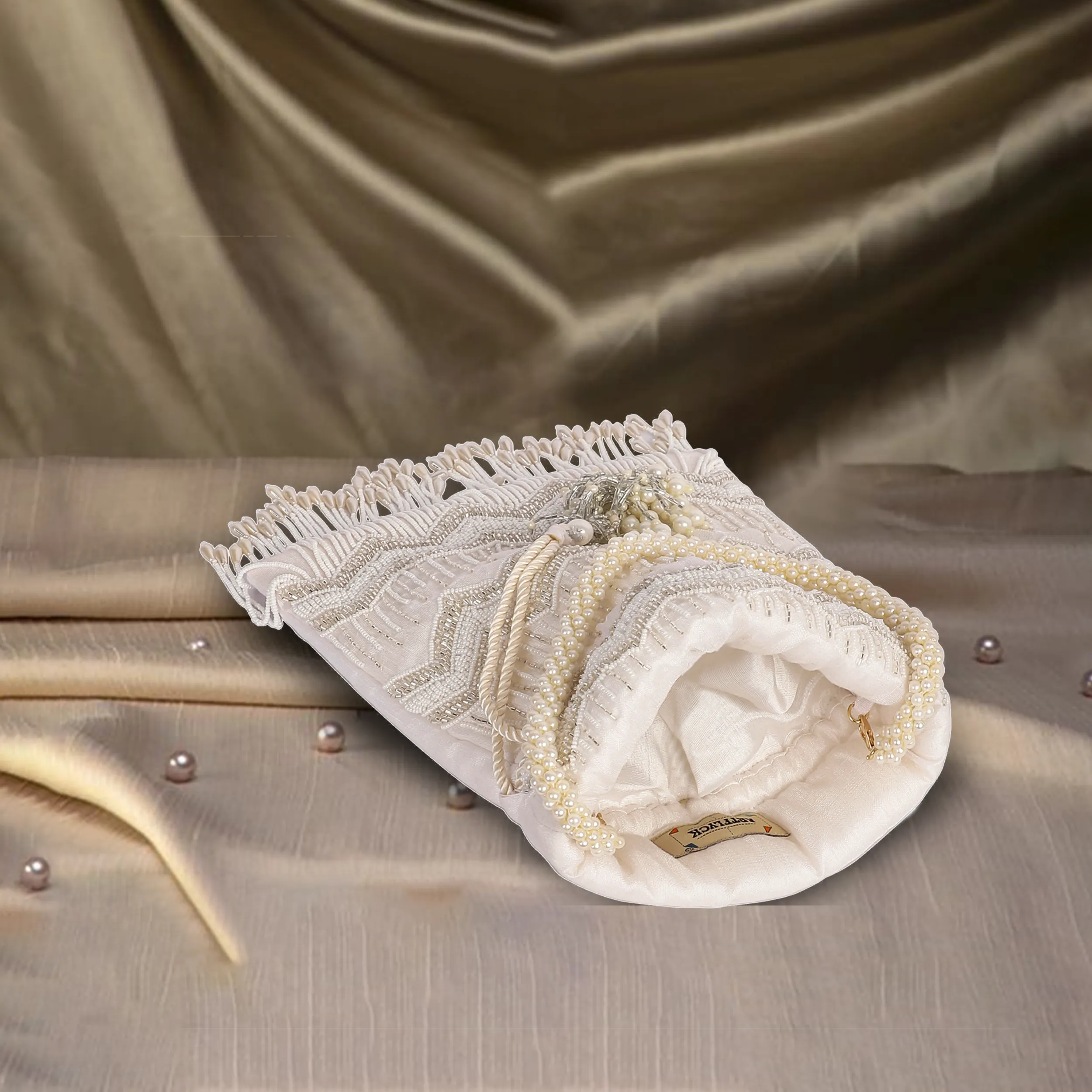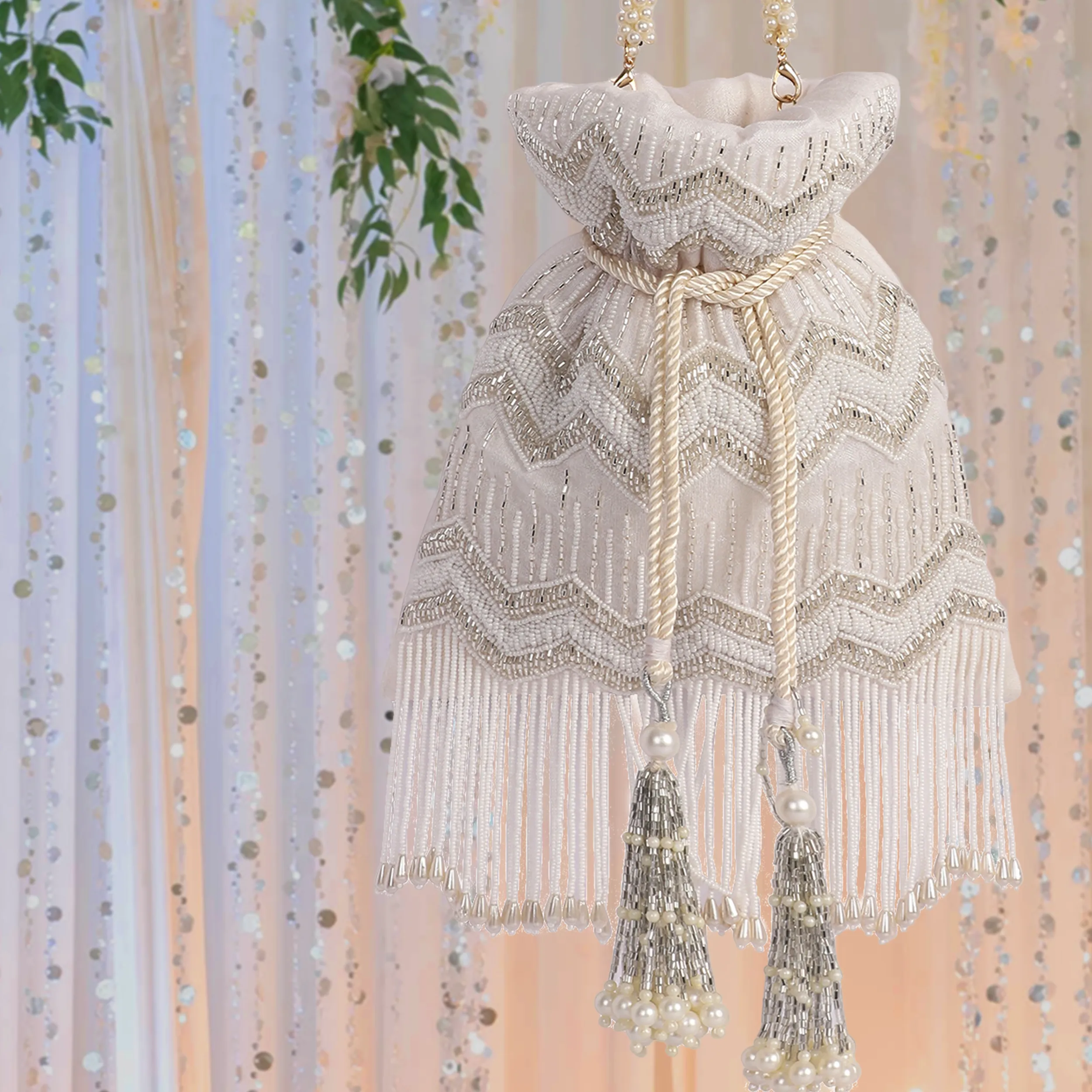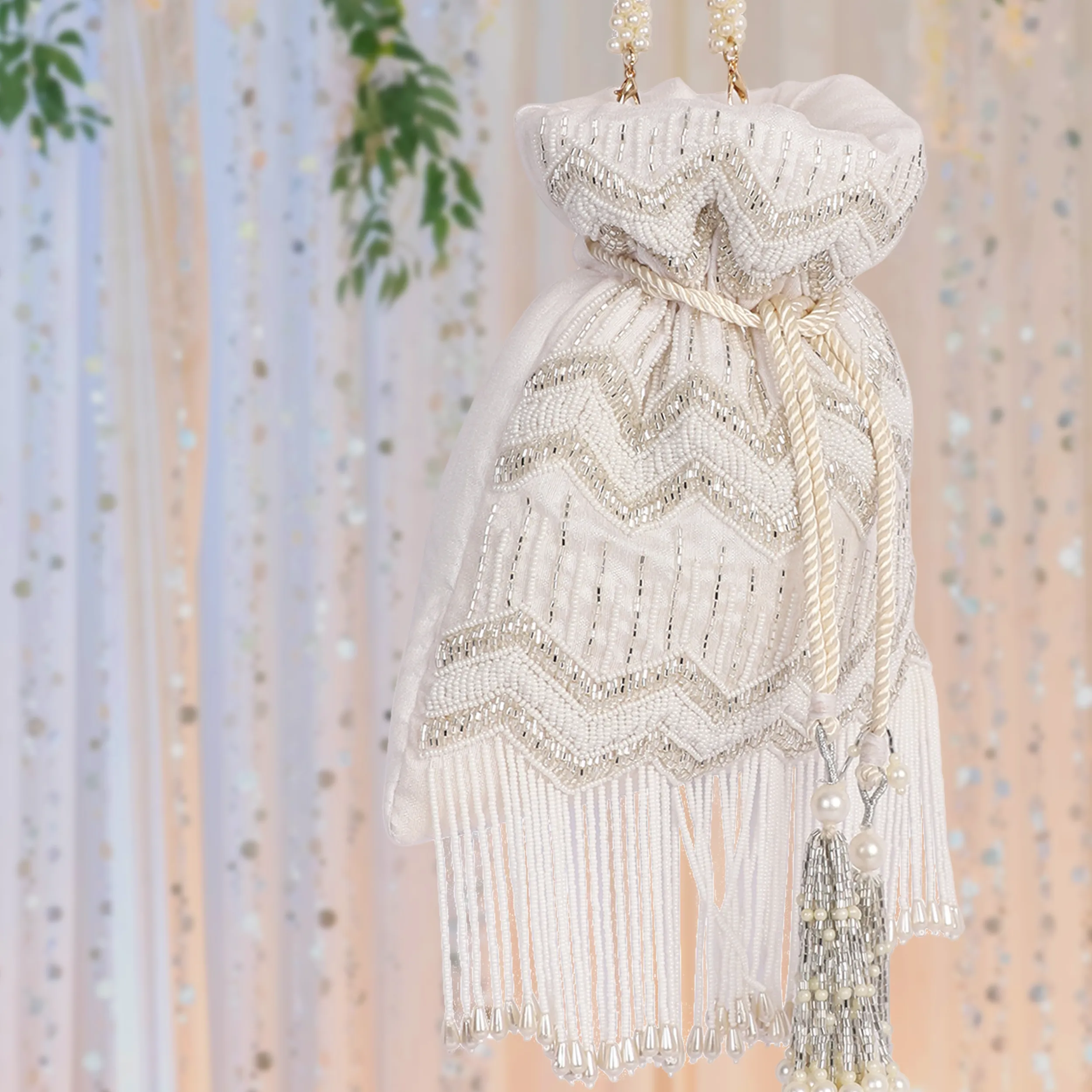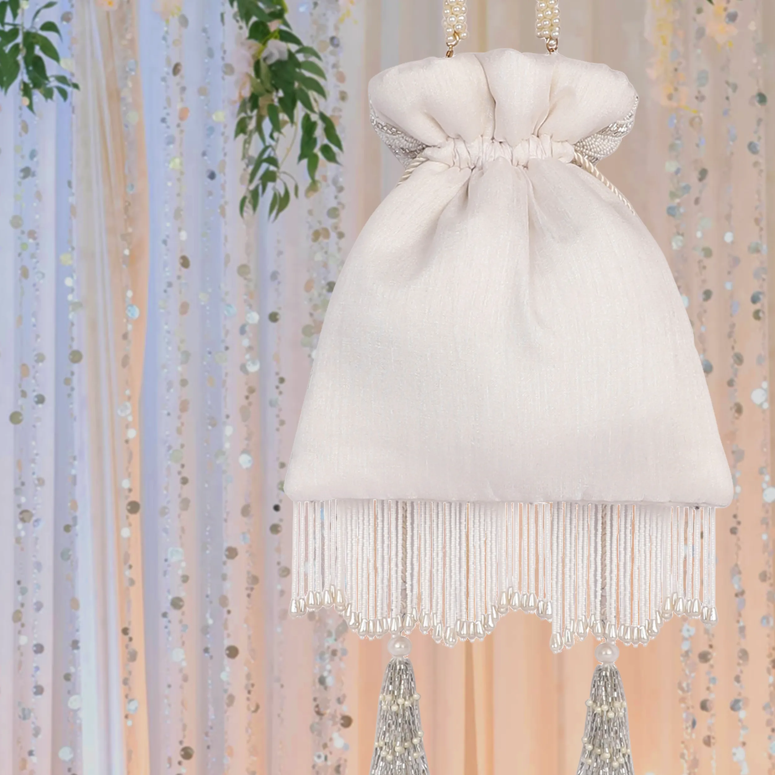 Crafted in elegant white silk, the Khaab Potli features intricate hand embroidery adorned with delicate pearls and shimmering cutdana detailing. Finished with long tassels and woven drawstrings, this handcrafted accessory adds refined elegance to festive, wedding, and traditional ensembles.