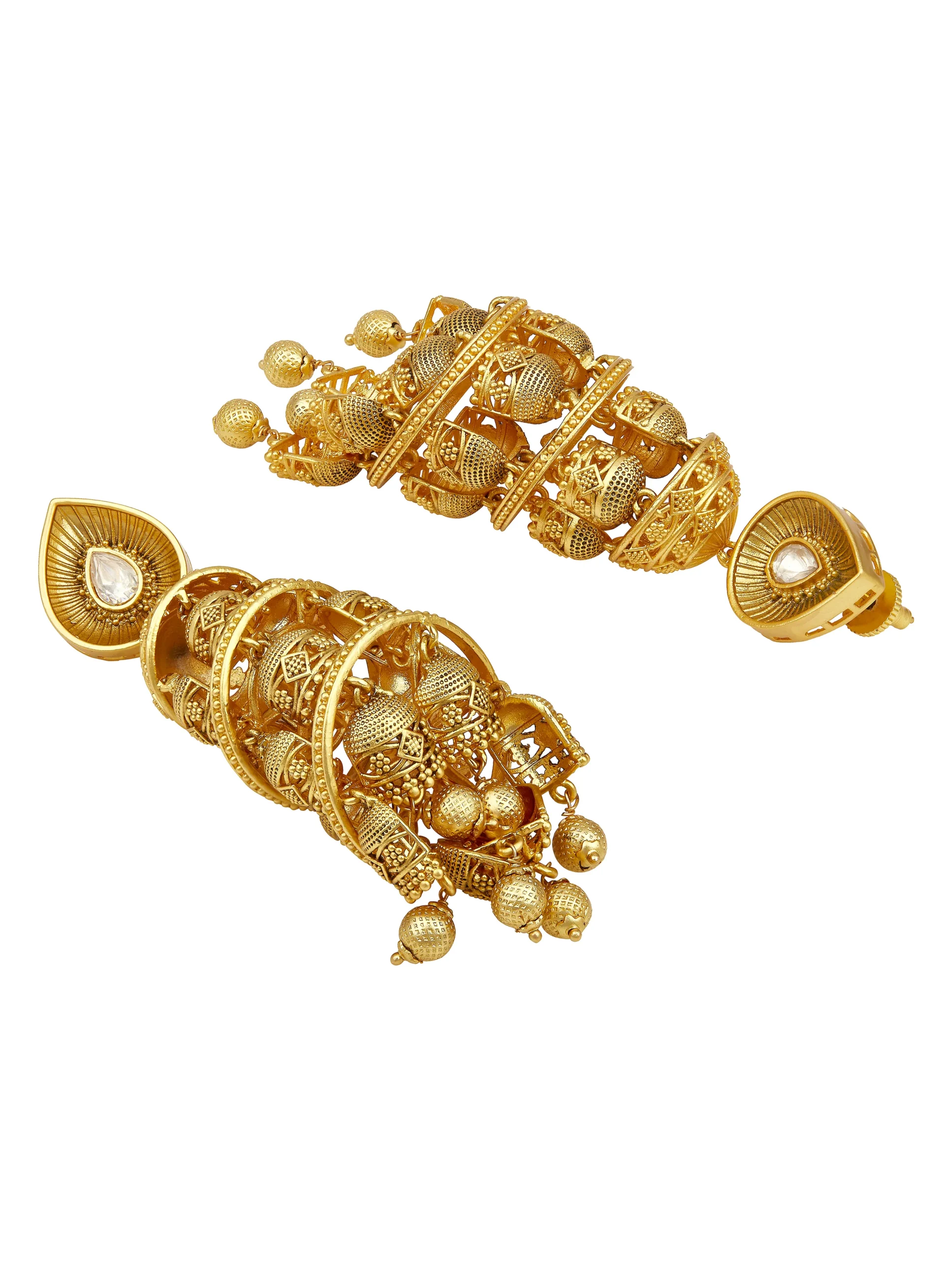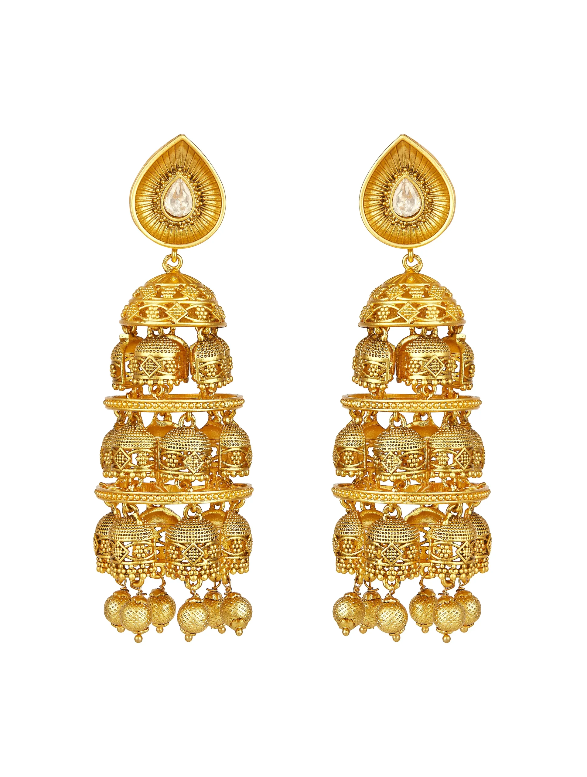 Pair these regal layered jhumka earrings with silk sarees, bridal lehengas, or heavily embroidered Anarkali sets for weddings and festive events. Their classic gold finish beautifully complements rich tones like red, maroon, emerald, and royal blue, while also adding a traditional statement to contemporary fusion outfits.
