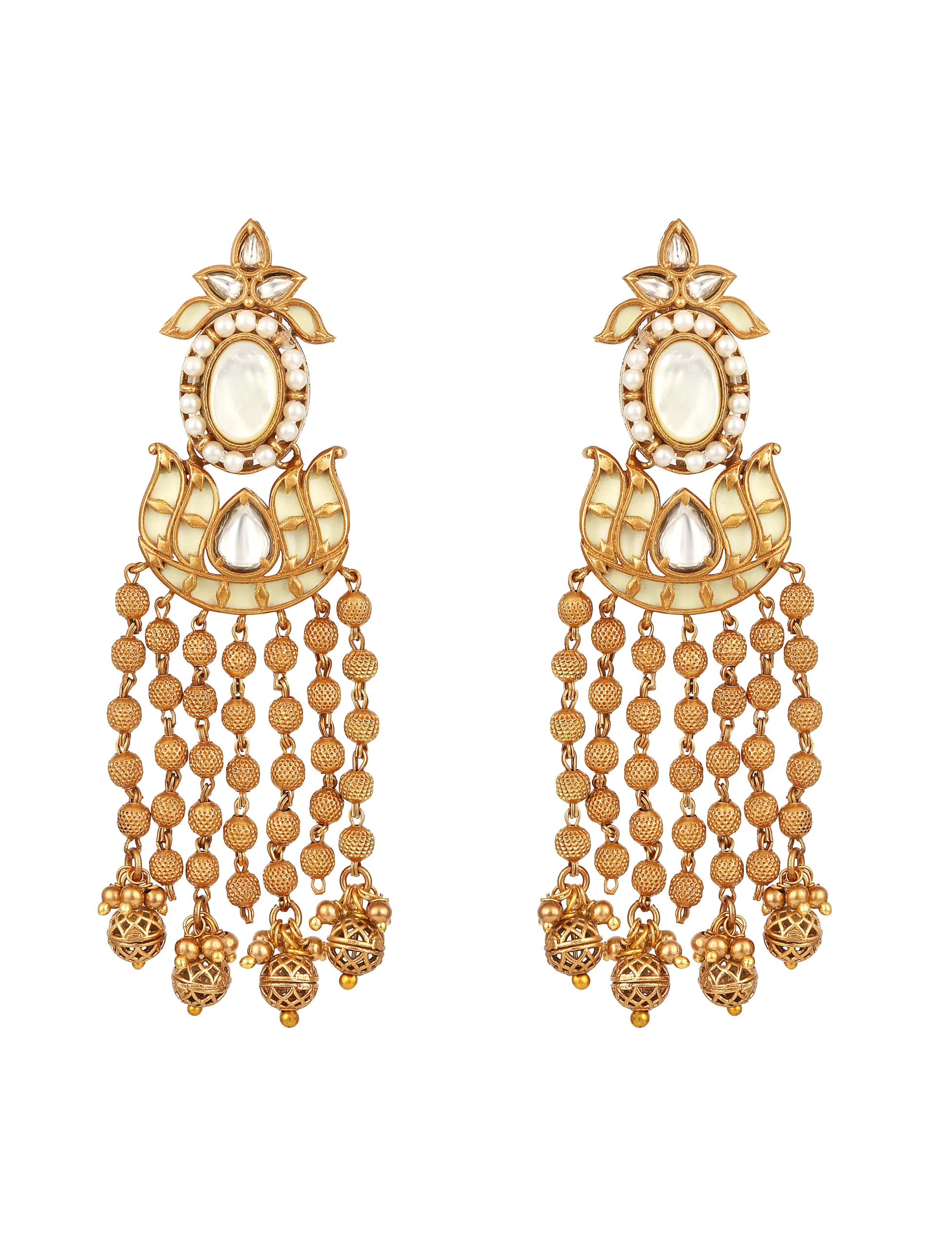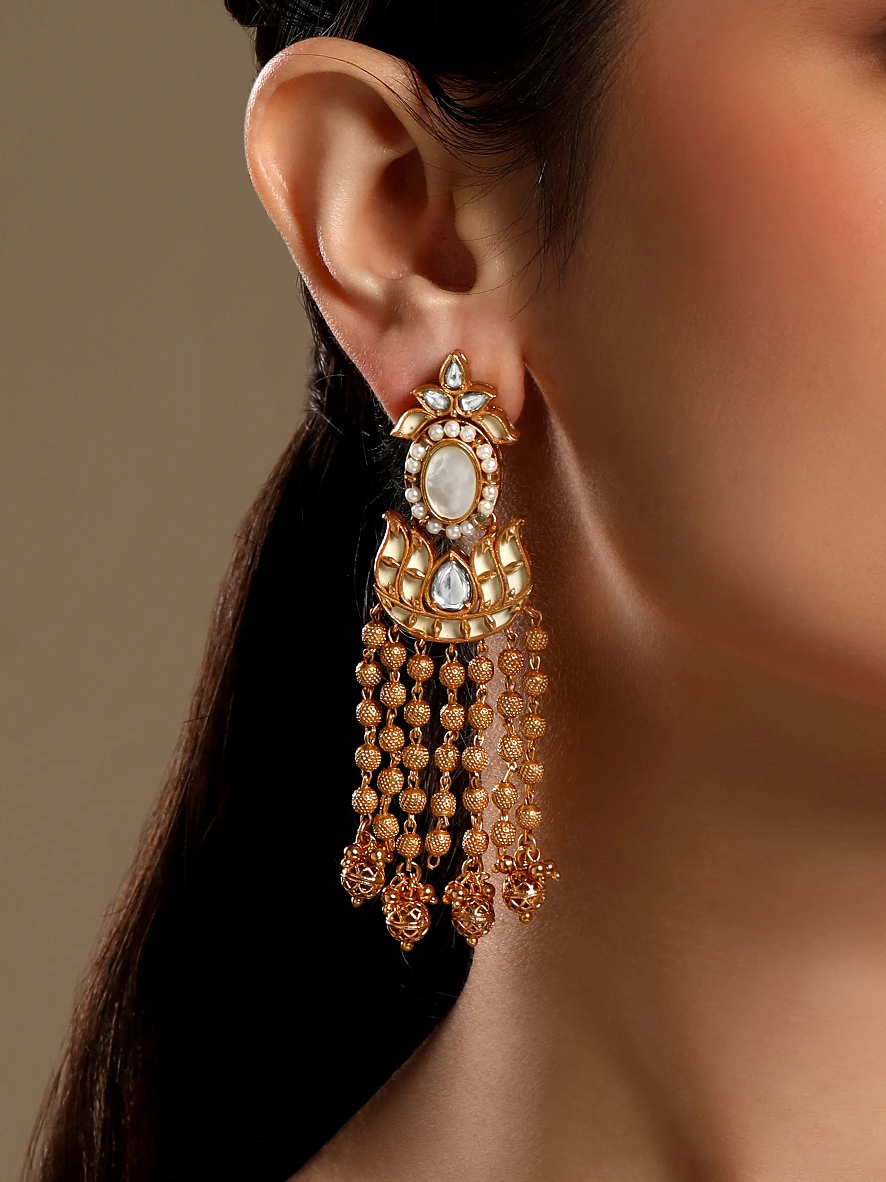 Introducing Kundan Polki Pearl Chain Dangler Earrings crafted in micron gold polished brass, featuring radiant kundan stones and cascading pearl chain drops. Handcrafted with intricate detailing, this elegant piece blends traditional charm with modern sophistication, perfect for weddings, festive occasions, and styling with Indian or Indo-western ensembles.