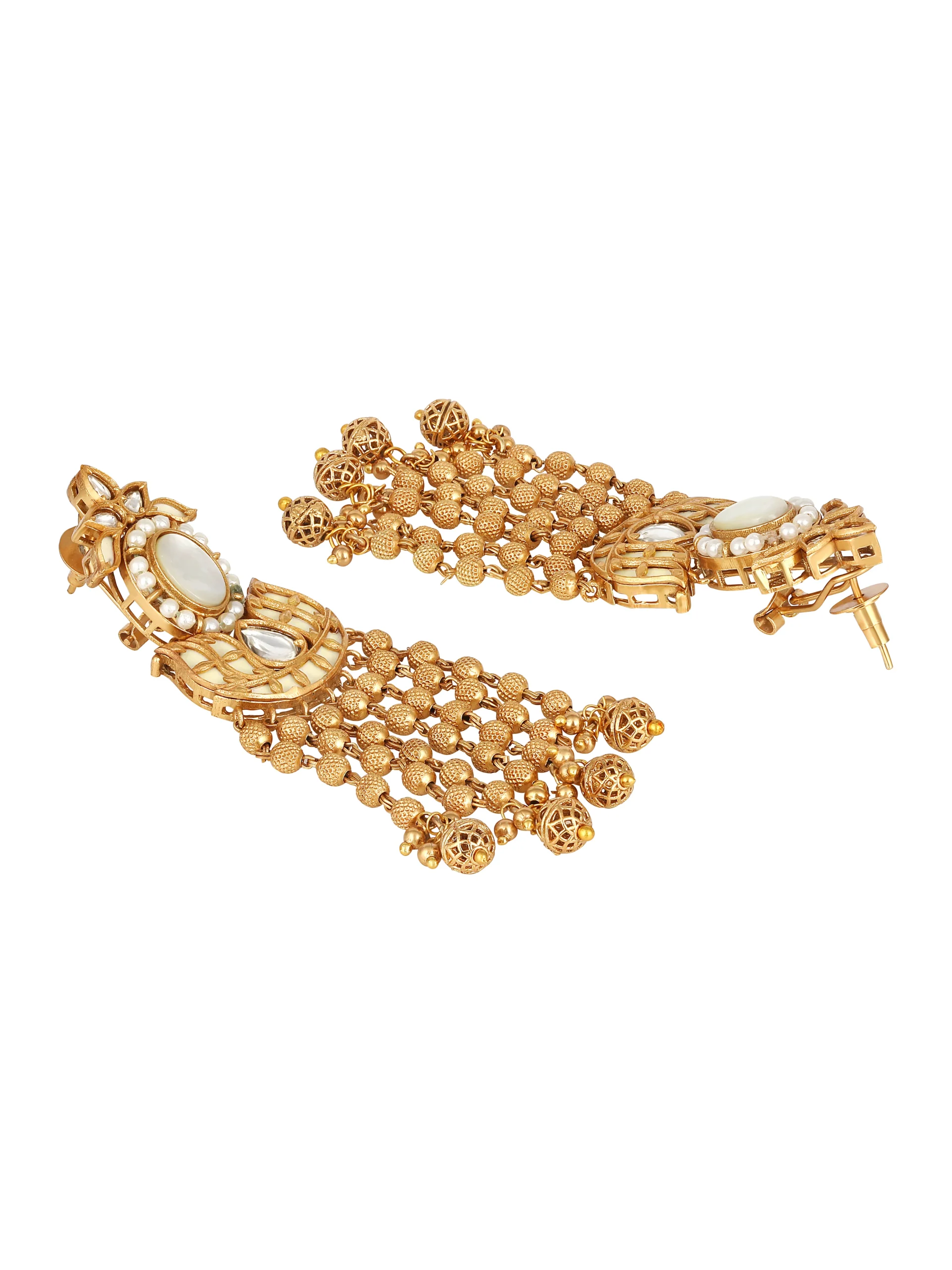 Kundan Polki Pearl Chain Dangler Earrings in Micron Gold Polish Brass