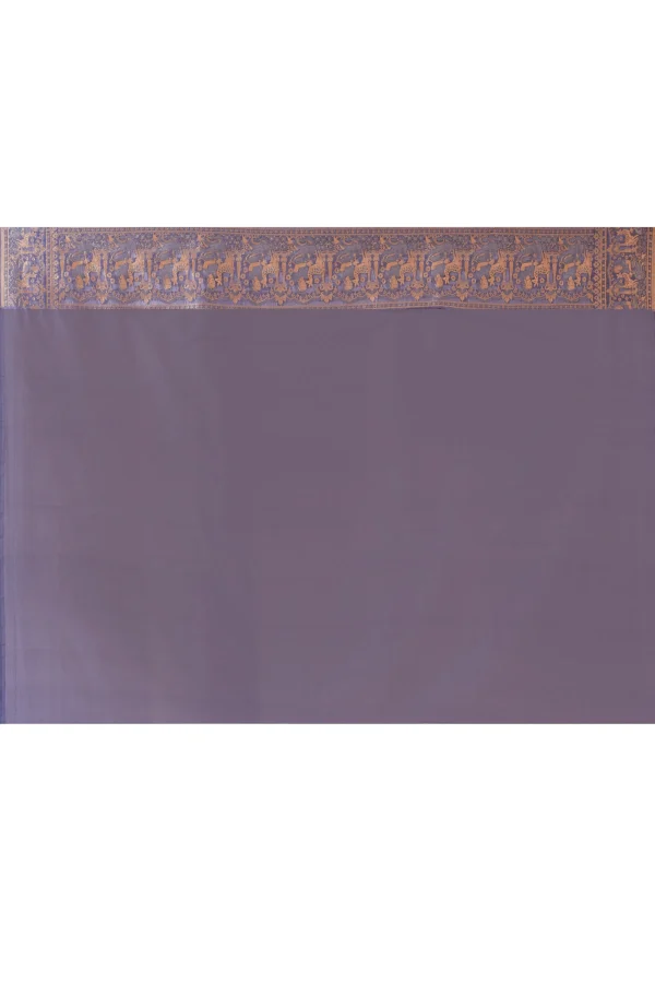 Introducing a Lavender Banarasi silk saree that reflects refined tradition and understated luxury. Featuring repeating circular traditional motifs across the body, it is enhanced by a rich navy blue border and palla with classic Banarasi patterns, woven in antique silver and soft gold zari. Comes with a matching running blouse piece.