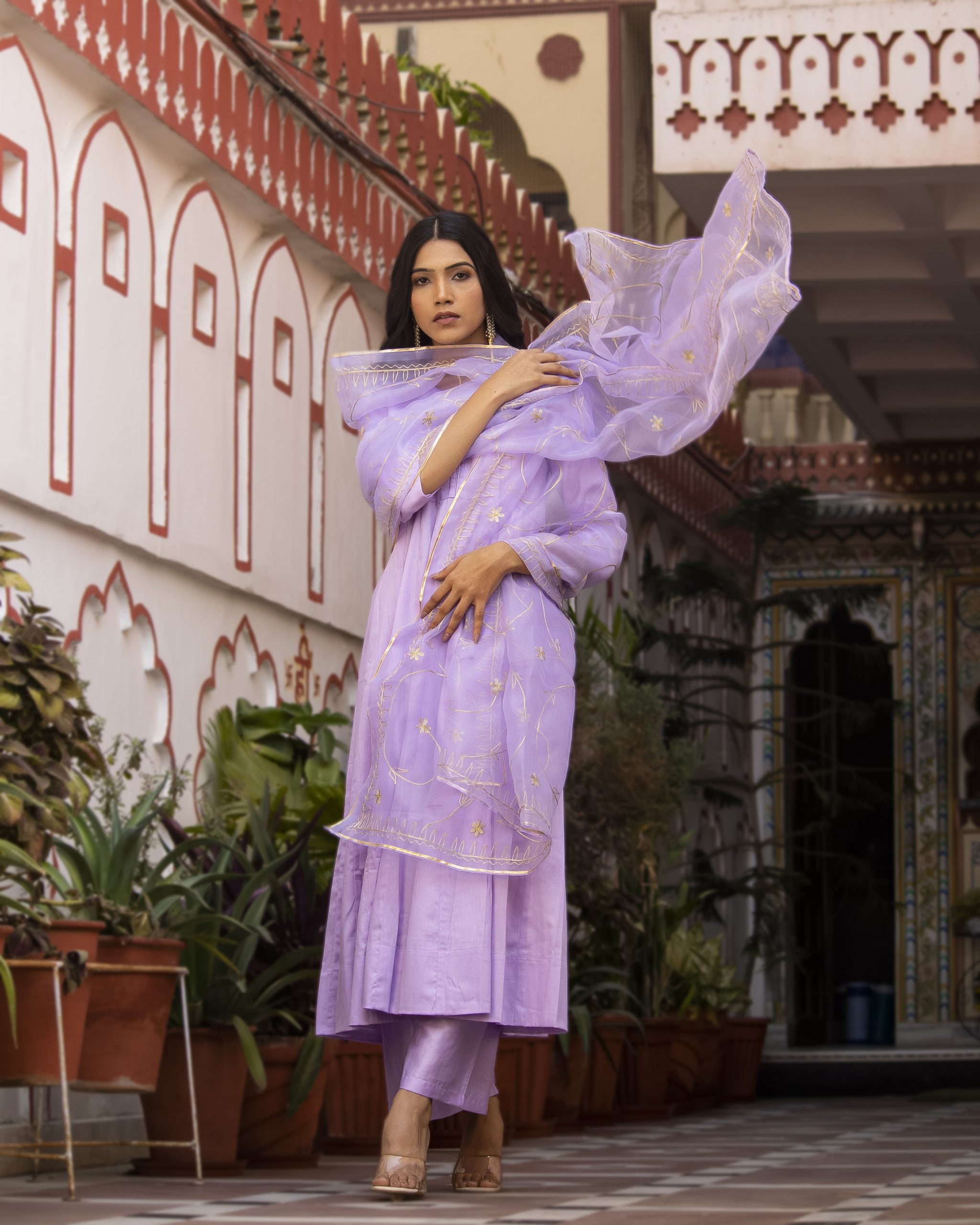 Introducing lavender cotton silk kurta set. Crafted in luxurious cotton silk, the kurta features a graceful flared silhouette. Paired with a matching moderately flared pant and an organza dupatta with all-over aari embroidery jaal, it exudes refined festive elegance charm.