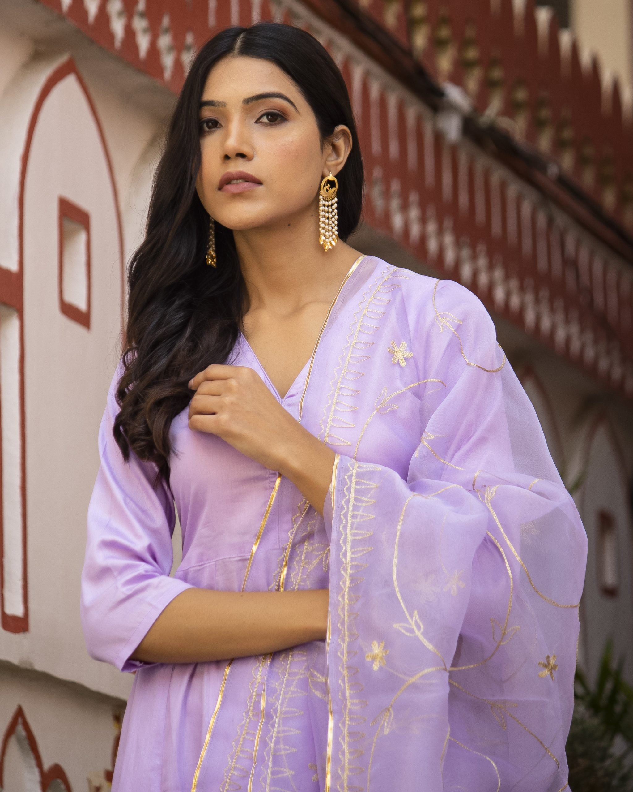 Lavender Cotton Silk Kurta Set & Aari Embroidered Organza Dupatta