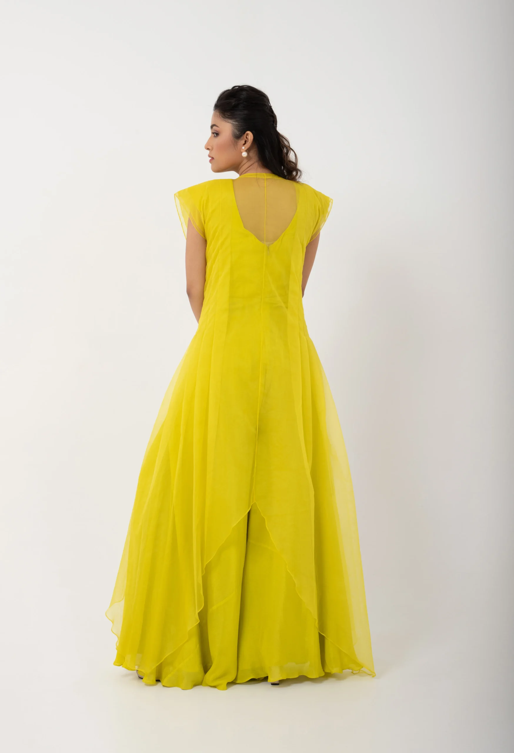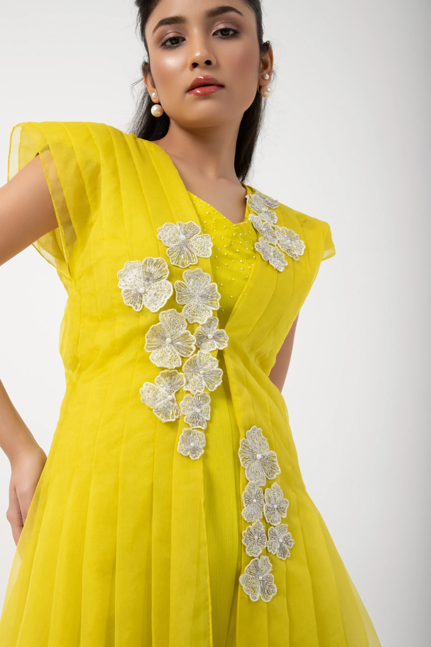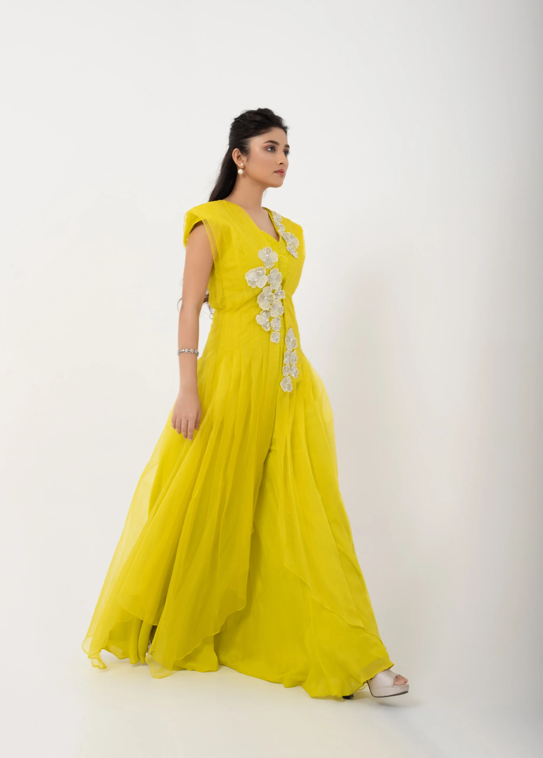 Introducing a lemon yellow chinon jumpsuit paired with a sheer organza jacket, crafted for contemporary elegance. The flared-leg silhouette is enhanced with delicate hand embellishments on the yoke for a flattering finish. Topped with a pleated organza jacket featuring structured shoulders, white 3D floral appliqués, and diagonal embroidery, this ensemble blends comfort with refined, high-fashion charm—perfect for summer celebrations and statement occasions.