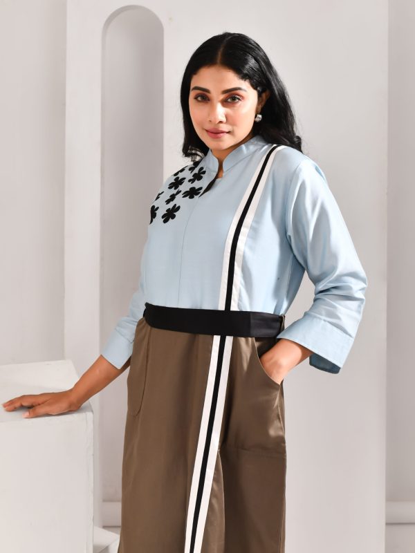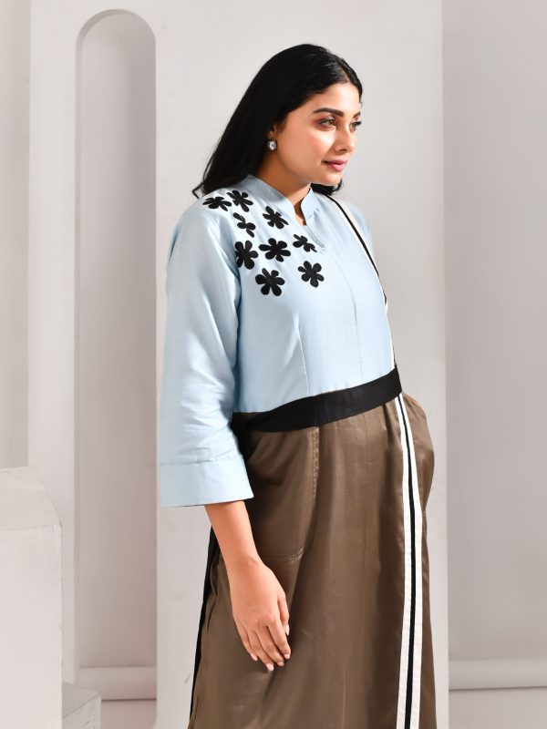 The perfect balance between formal and casual , offering the utmost comfort. A classic light blue and mud brown colored blended cotton midi dress featuring floral patch work at the yoke , accentuated with a belt In our signature colour blocking technique. Combining style with functionality.