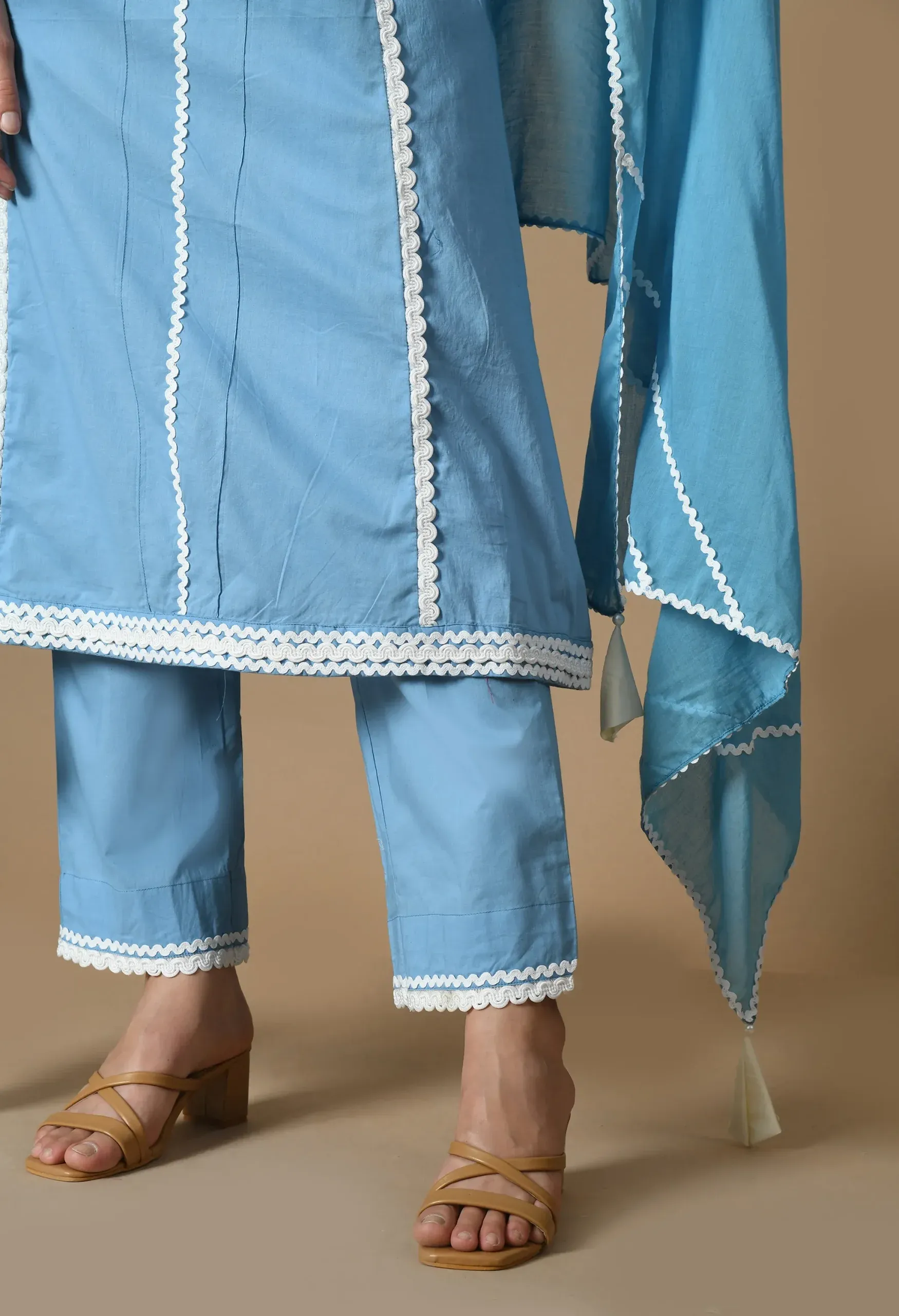 Enhance this set with soft pearl studs or floral-inspired earrings to highlight its delicate detailing. Opt for nude, blush, or metallic sandals for an elegant finish, and complete the look with a minimal clutch for graceful sophistication.