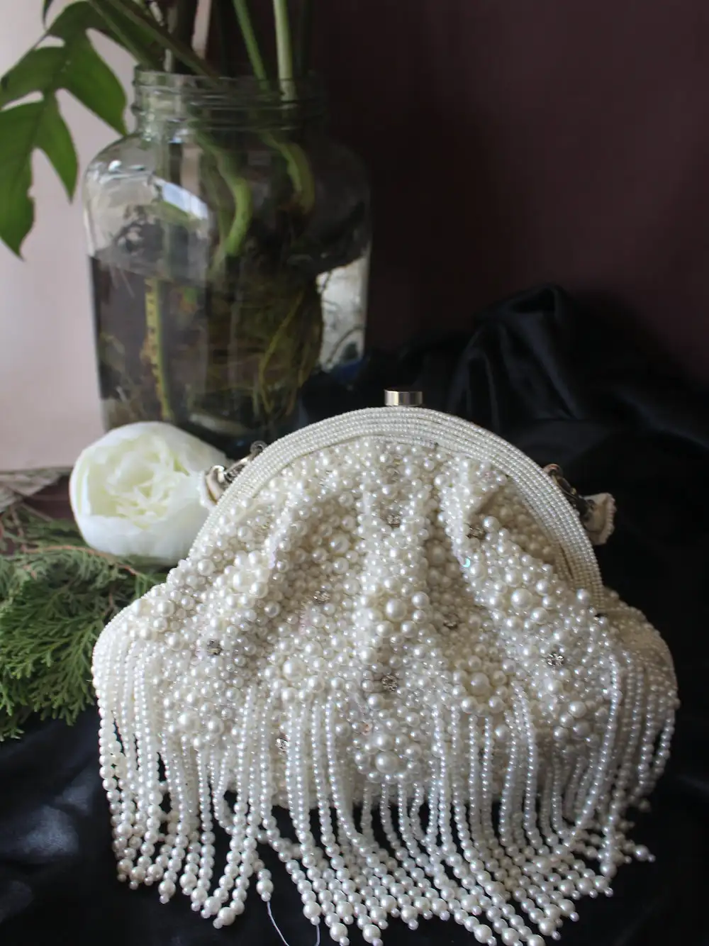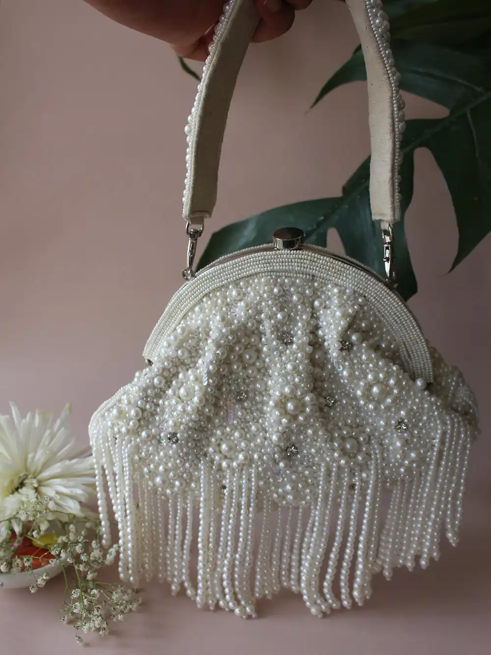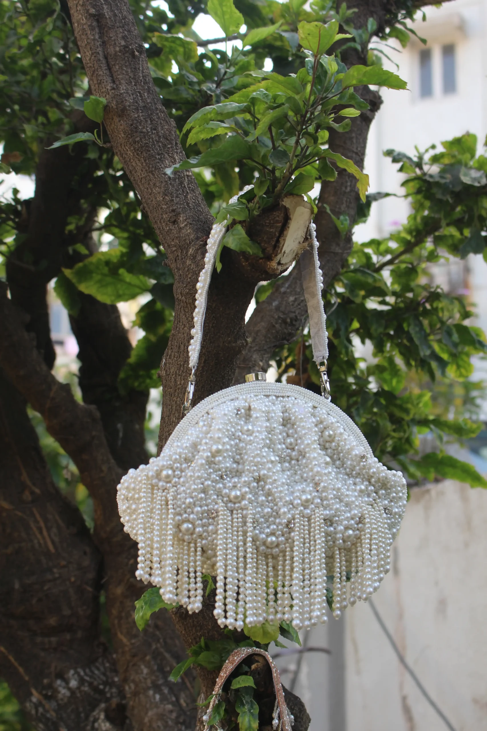 Introducing a dazzling light gold sequinned potli designed to add a touch of sparkle and elegance to your festive look. Crafted on a shimmering sequinned base, it reflects light beautifully to create a radiant finish. Delicate pearl tassels enhance its luxurious appeal while adding graceful movement to the design. Perfect for weddings, festive celebrations, and special evenings, this elegant potli complements both traditional and contemporary ensembles with effortless charm.