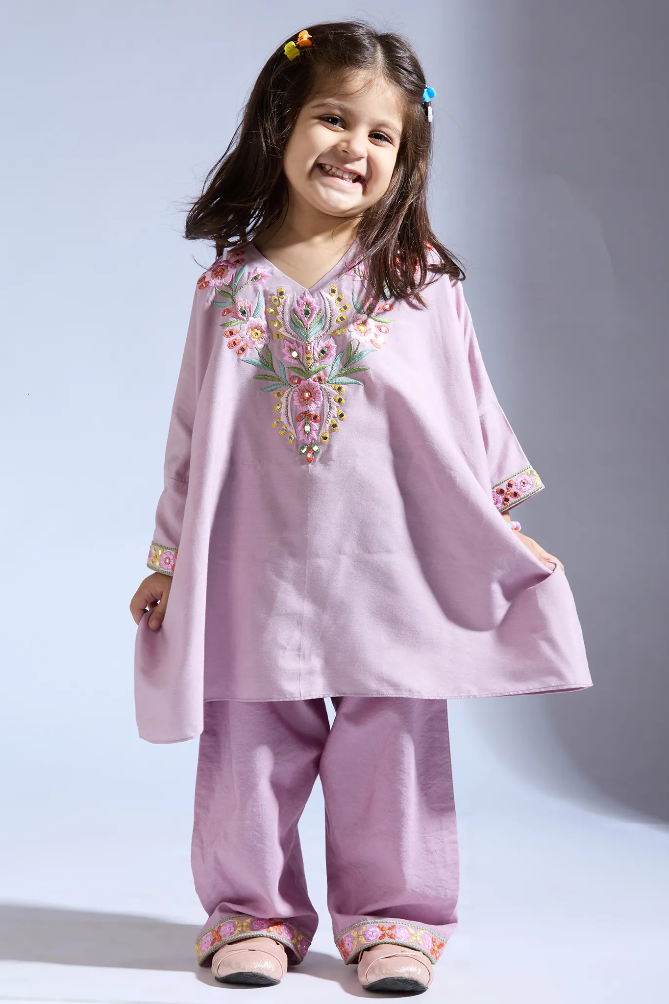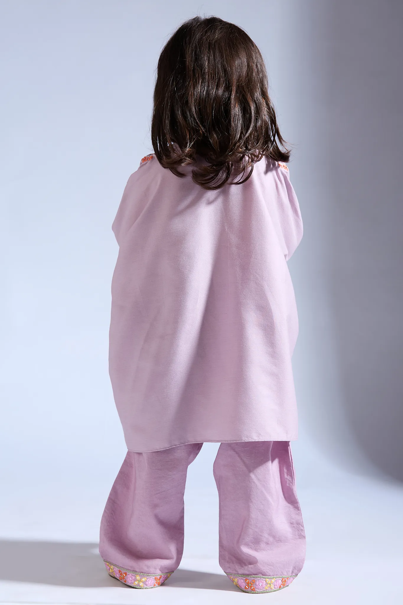 Introducing a graceful Light Purple Spun Silk Embroidered Co-ord Kurta Set for girls. Crafted in luxurious spun silk, this elegant outfit features intricate thread and mirror work detailing on the yoke and cuffs, paired with matching pants. Perfect for festive celebrations, weddings, and special occasions.