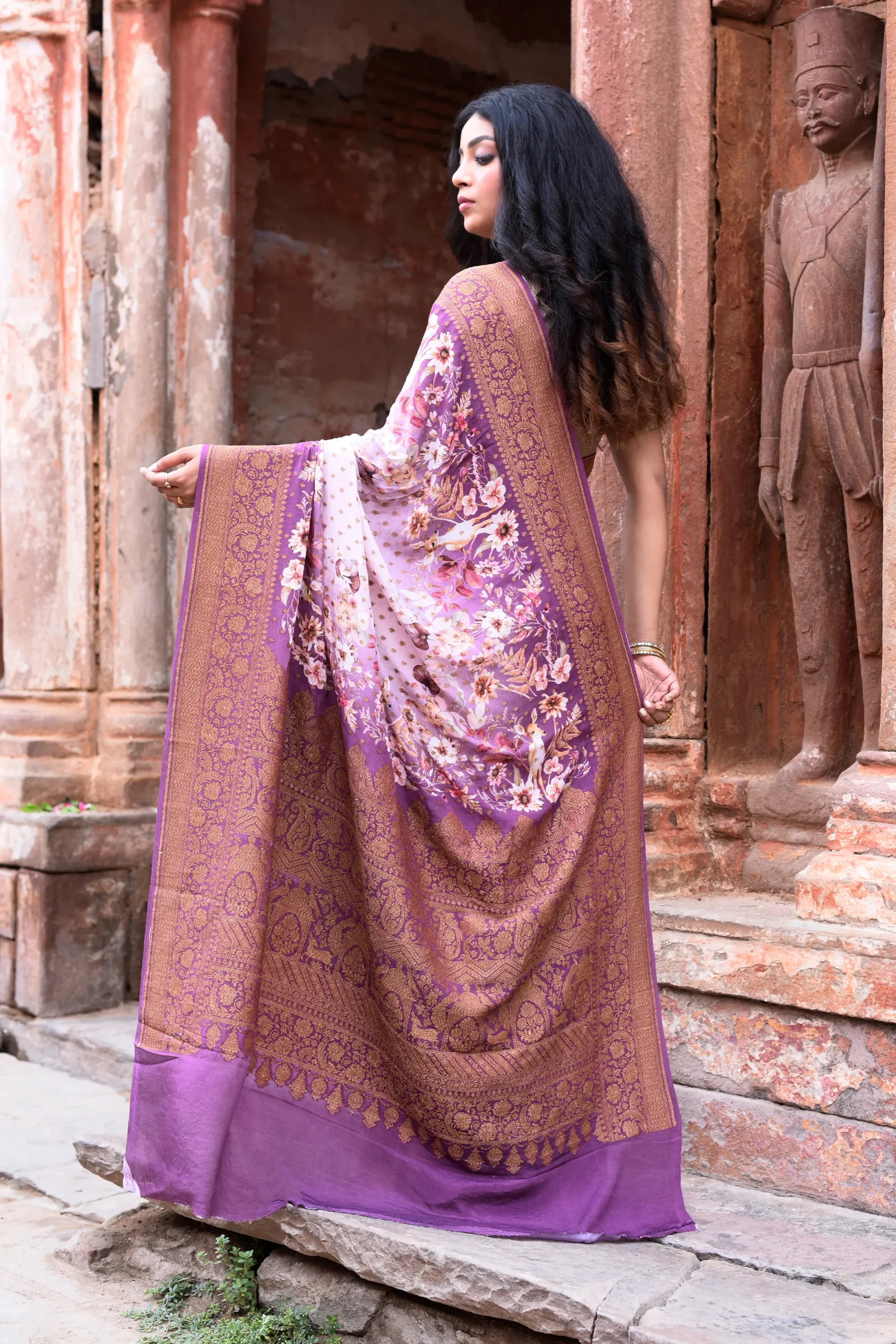 Lilac Banarasi Crepe Chiffon Silk Saree with Antique Zari