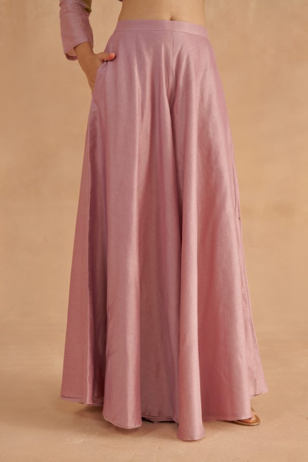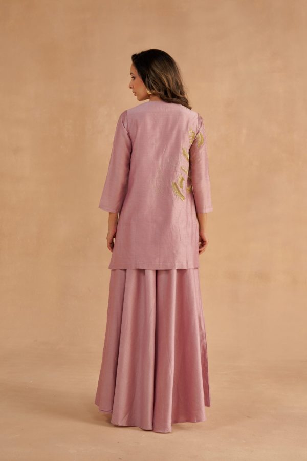 This classic short kurta, crafted in an elegant lilac hue from fine Chanderi silk, gracefully blends traditional design with modern sophistication. The statement lotus motif with intricate Zardozi work that flows across the garment, is complemented by a timeless V-neck cut. Paired with updated sharara pants in subtle lilac Chanderi fabric, the design includes a waist belt and practical pockets. The refined silhouette, featuring a modern slit, elevates the classic sharara style, adding a touch of elegance to any ensemble.