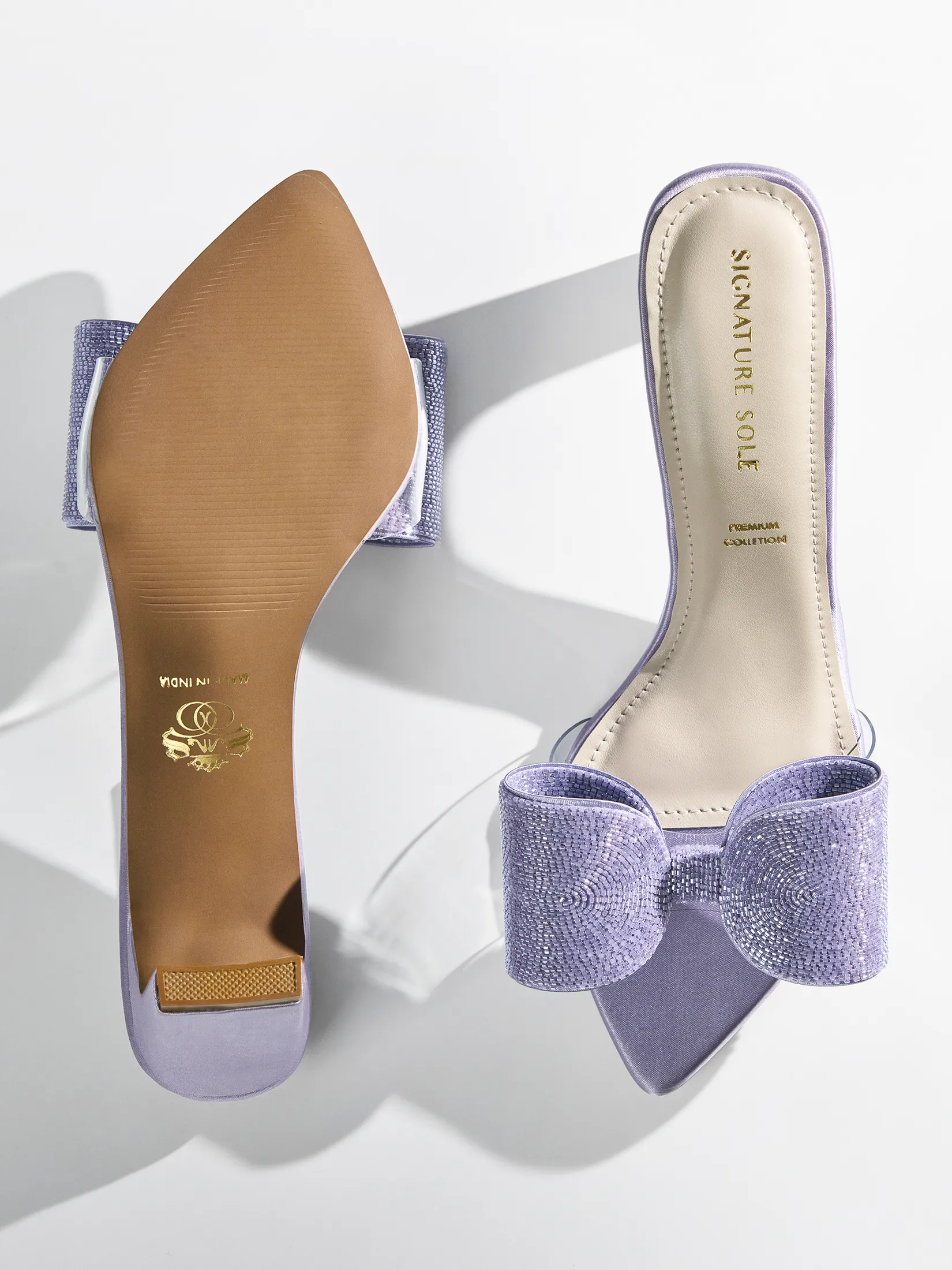 Craft : Oversized 3D bow fully encrusted with micro-rhinestones | Clear transparent body | Satin pointed toe | Premium CollectionMaterial : Fabric on faux leatherWork of : 115 Hours