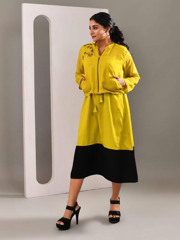 Introducing our deep lime green blended cotton and organza co-ord set, crafted in premium blended cotton for a structured yet breathable feel. This contemporary ensemble features a hand-beaded jacket intricately detailed with contrasting shoulder embroidery, a front zip closure, and functional side pockets — blending elegance with everyday versatility. The color-blocked dress underneath complements the look perfectly, creating a refined statement outfit that transitions effortlessly from formal gatherings to evening soirées.