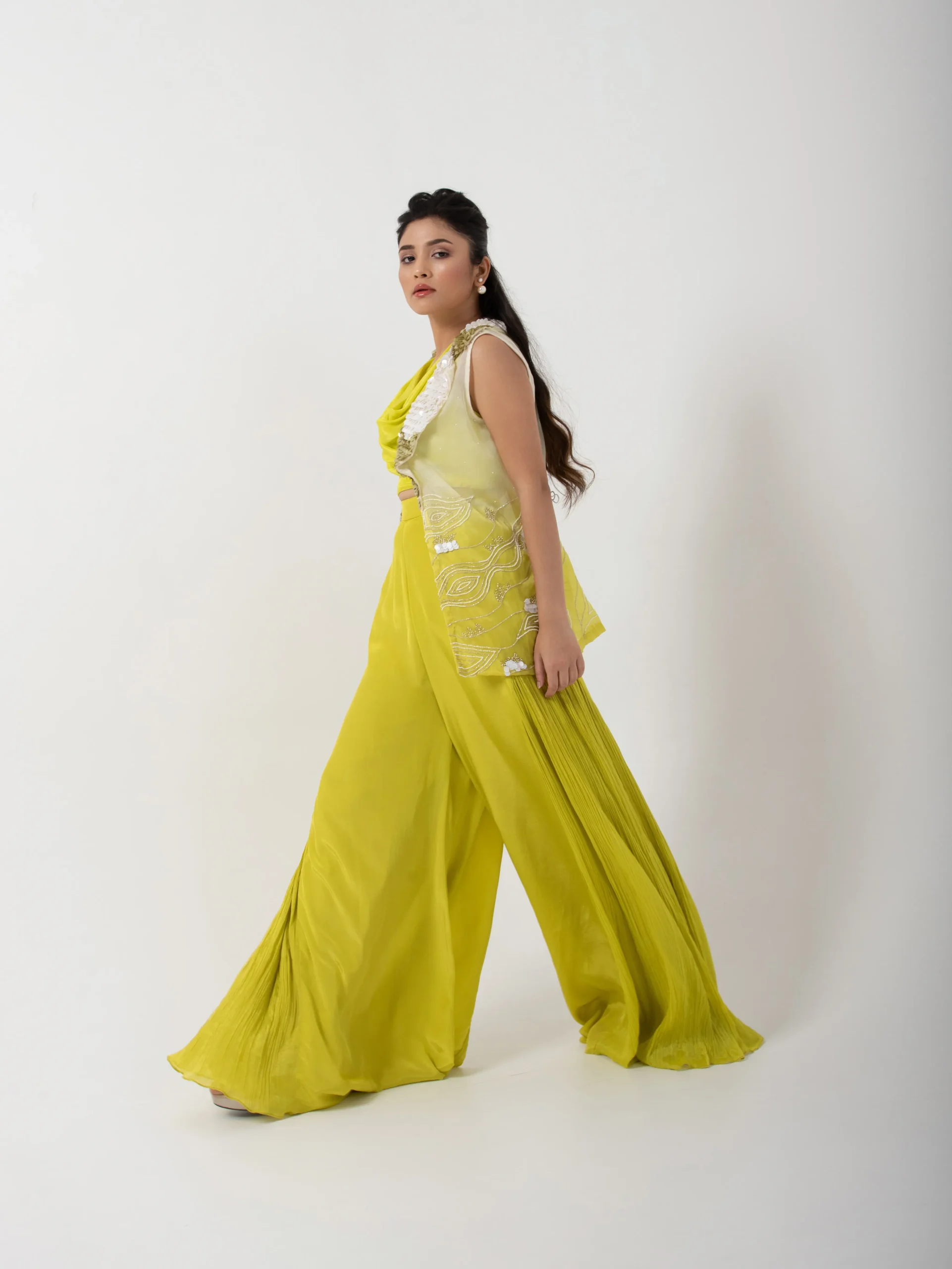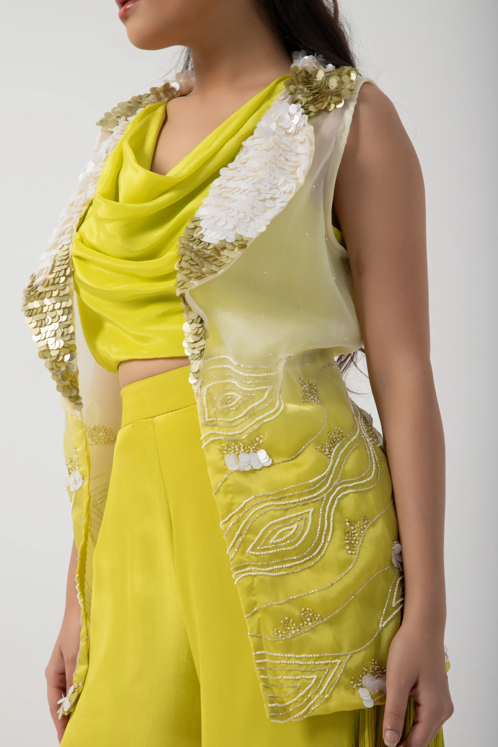 Introducing the lime green three-piece co-ord set. This statement outfit pairs a structured draped top and wide-leg trousers with a sheer embroidered shrug for playful sophistication. The sleeveless translucent outer layer features intricate white and gold sequin embroidery on the collar and delicate beadwork along the hem, adding texture and refined charm. Perfect for mehendi ceremonies, summer weddings, and chic brunch celebrations, this ensemble blends freshness with contemporary grace.