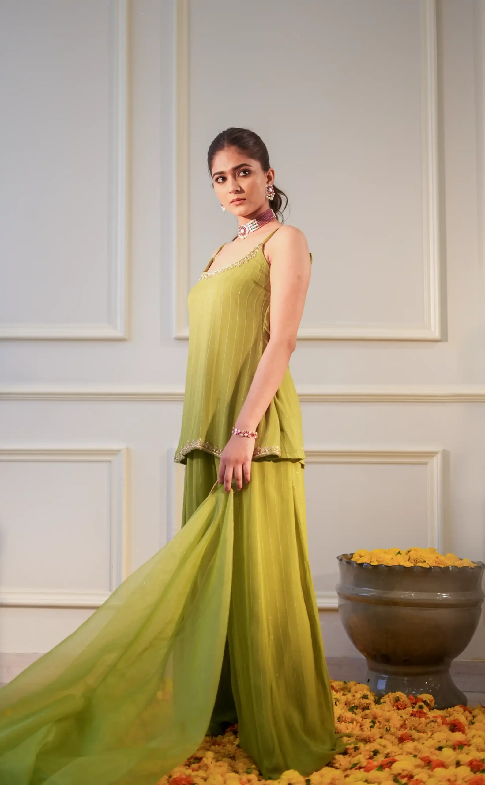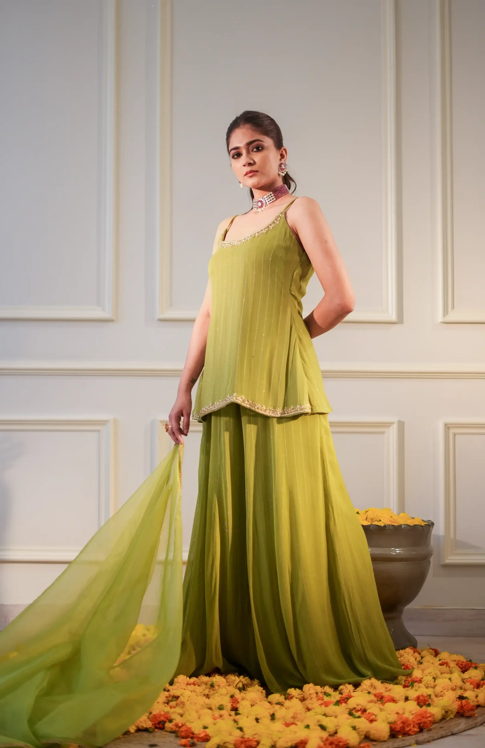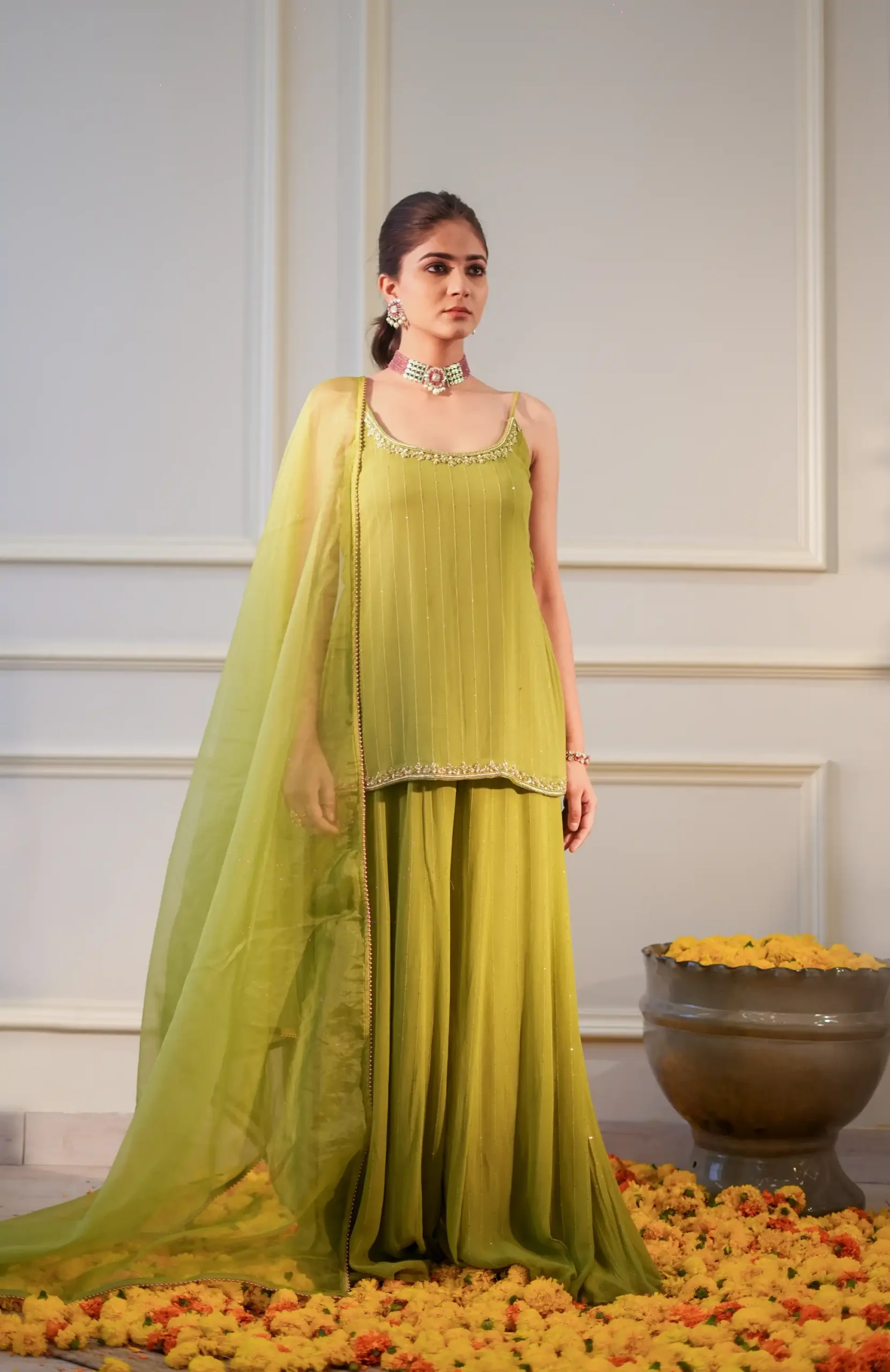 Lime Sequin Georgette Short Kurti Set with Garara and Organza Dupatta