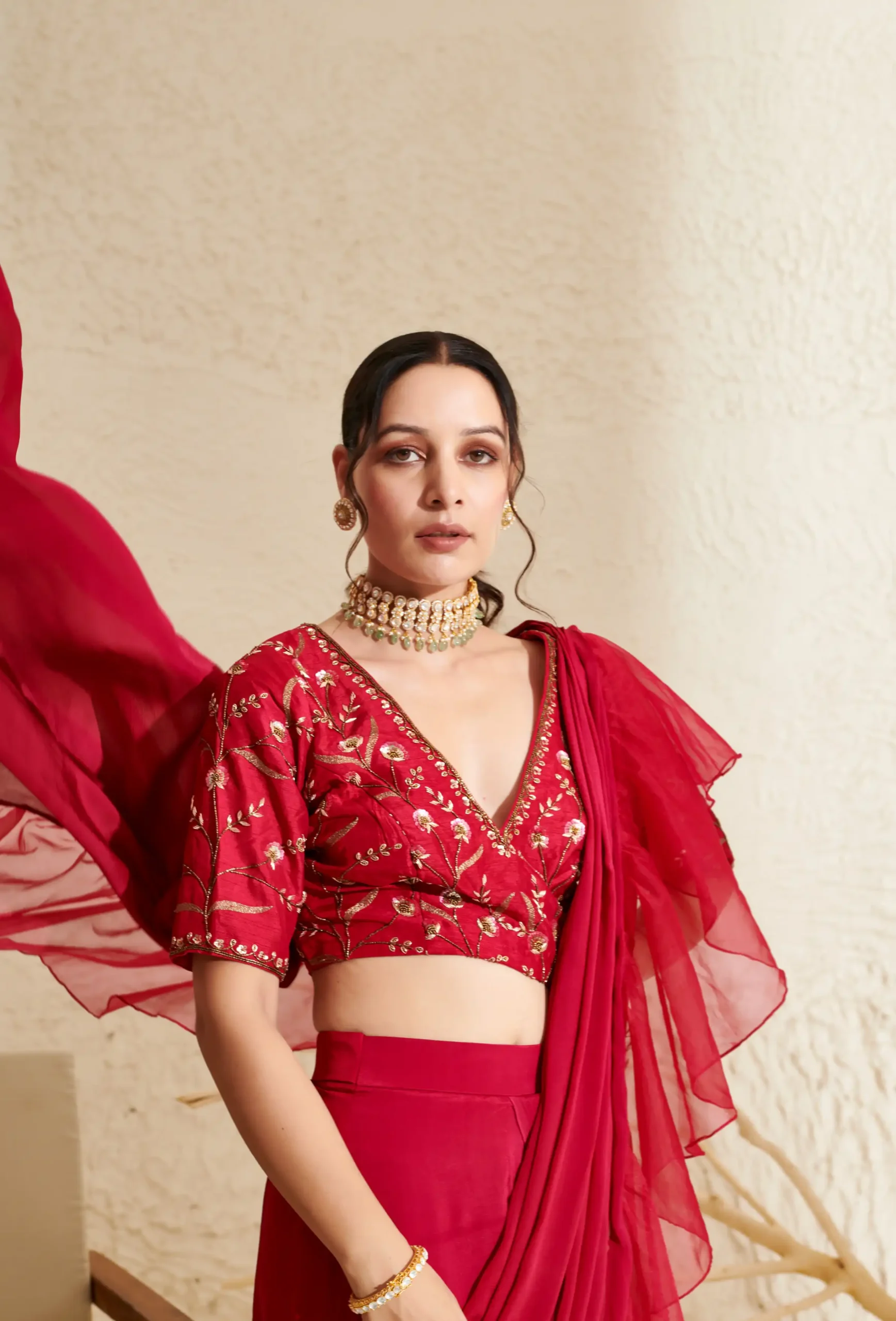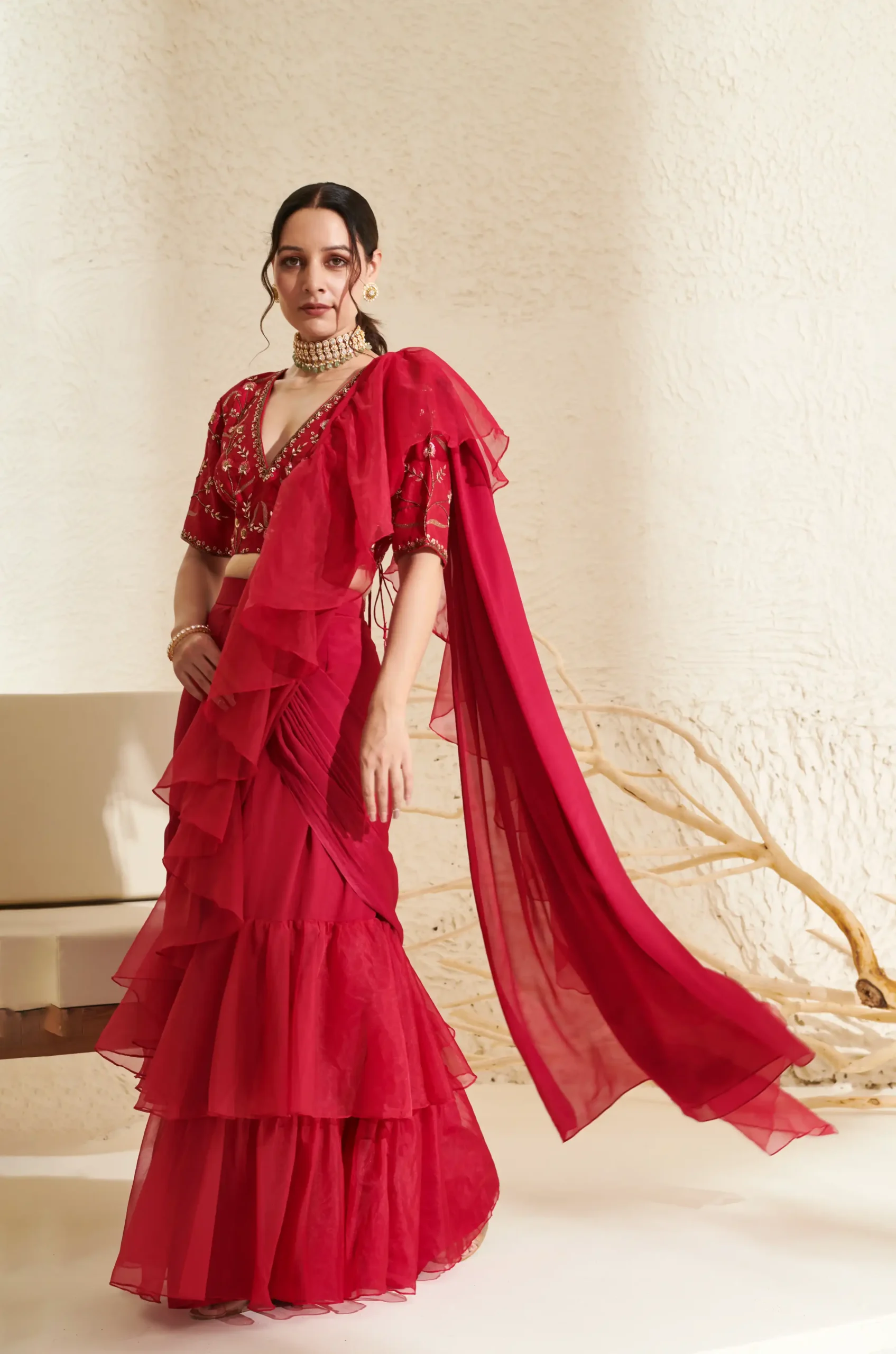 Style this statement organza ruffle saree with bold gold or kundan earrings to enhance the embroidered blouse. Pair it with metallic heels or embellished sandals for a festive look. Opt for radiant makeup with highlighted cheeks and defined eyes, and finish with a sleek bun or soft waves for a glamorous ethnic appearance.