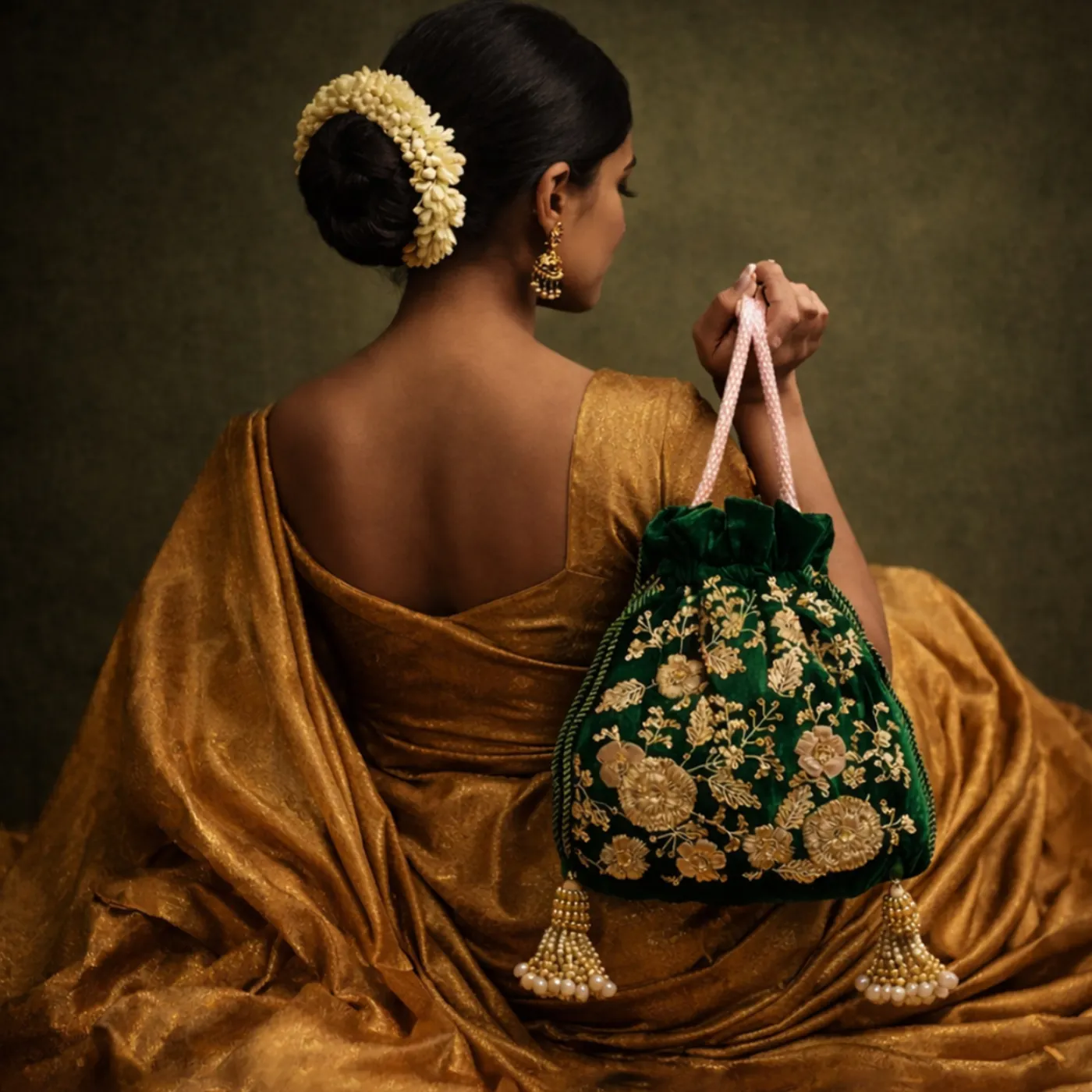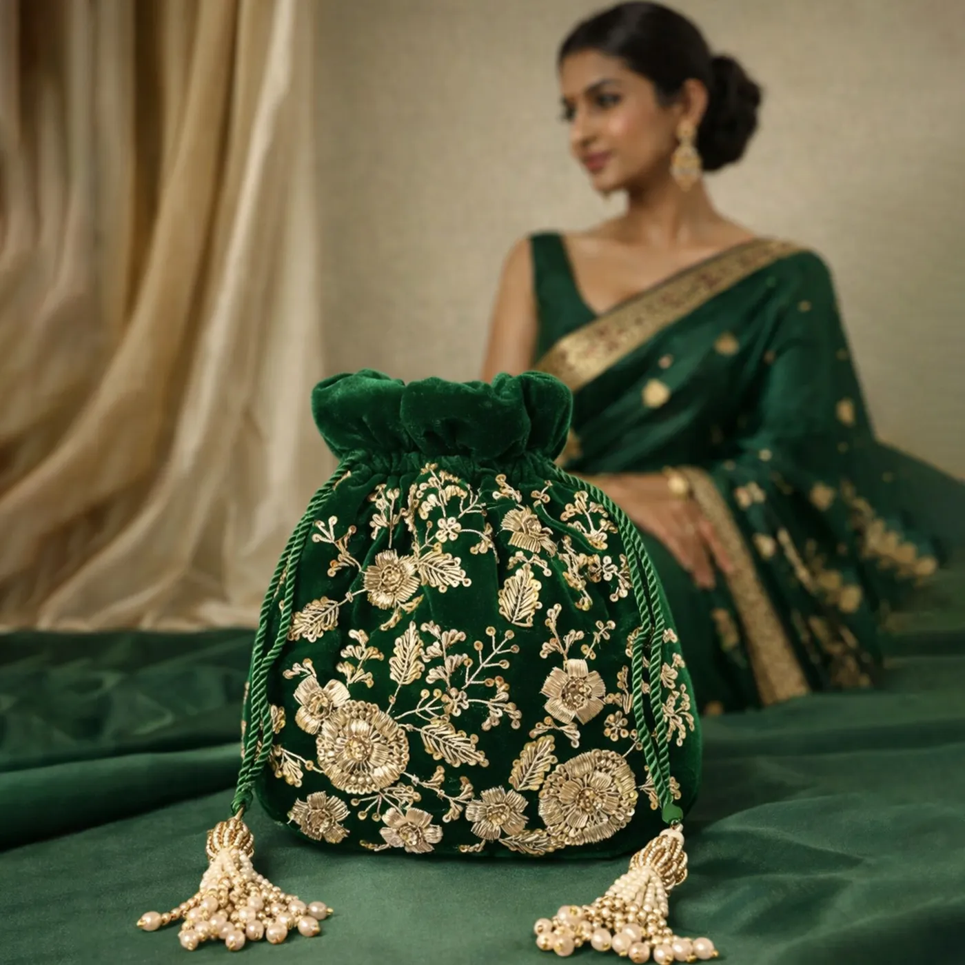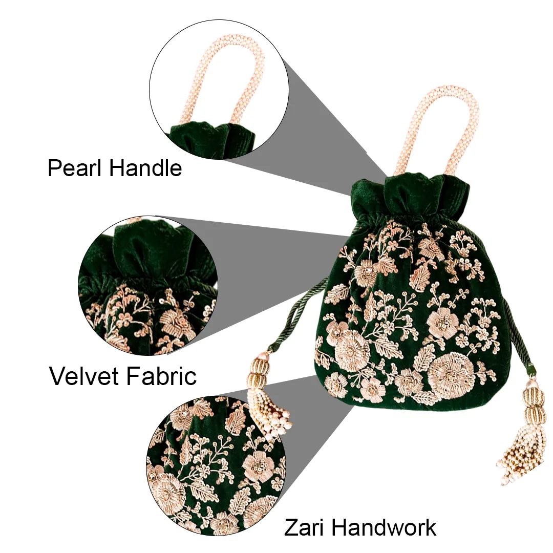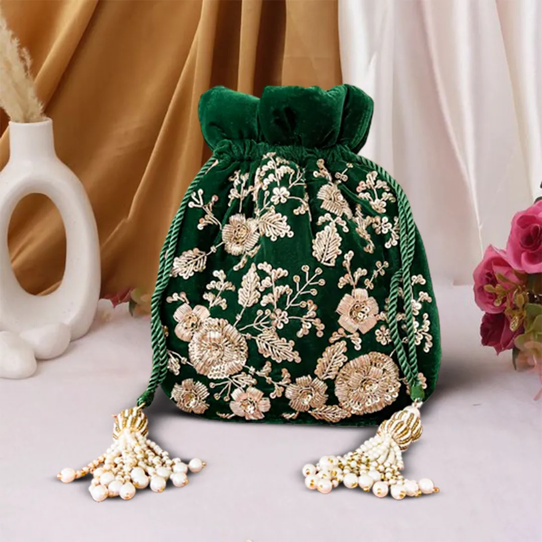 Maharani Hand-Embroidered Velvet Potli Bag with Zari Floral Work – Green
