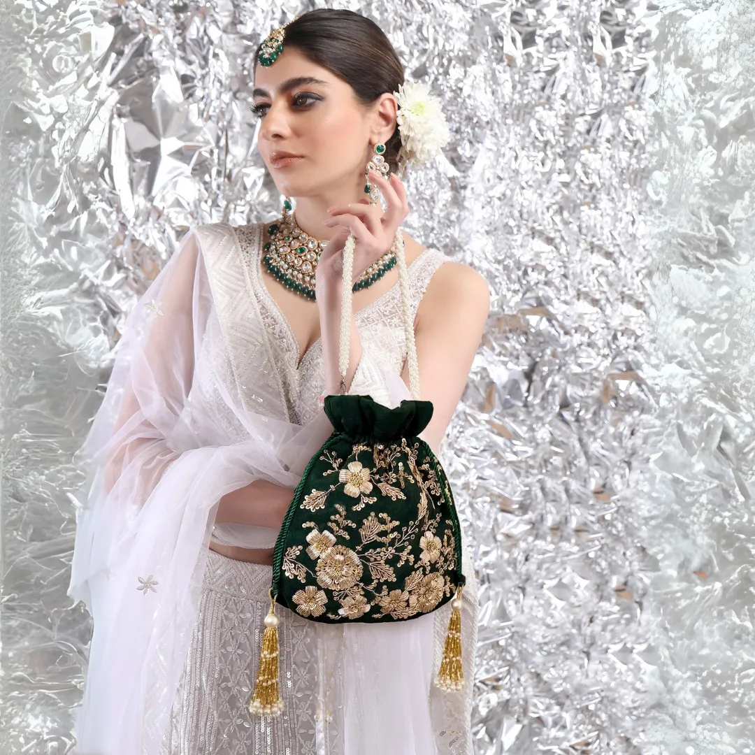 Crafted in rich green velvet, the Maharani Potli features intricate dabka and zari floral embroidery with elegant handcrafted detailing. Finished with pearl tassels and a drawstring closure, this exquisite accessory brings timeless sophistication to festive, wedding, and traditional ensembles.
