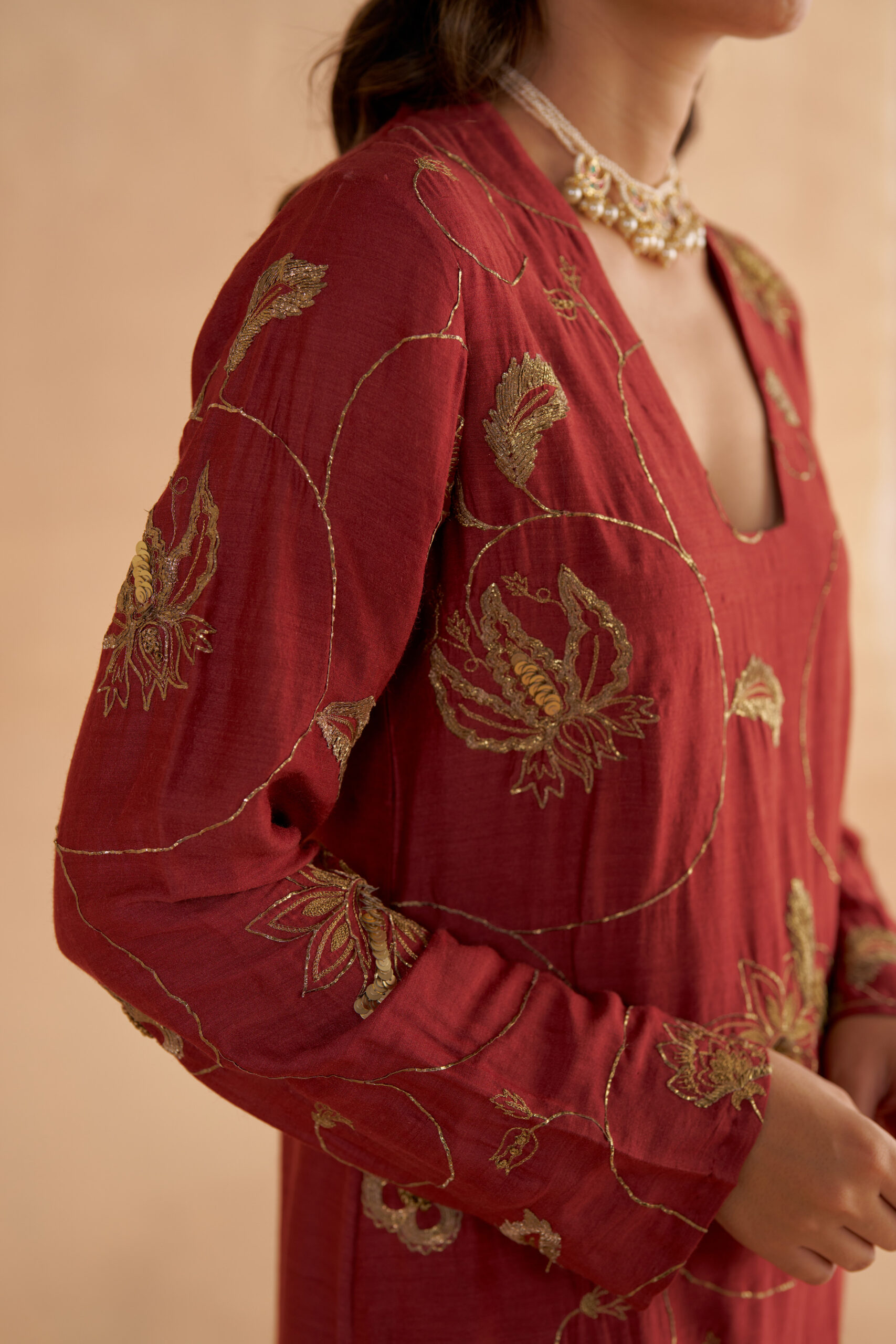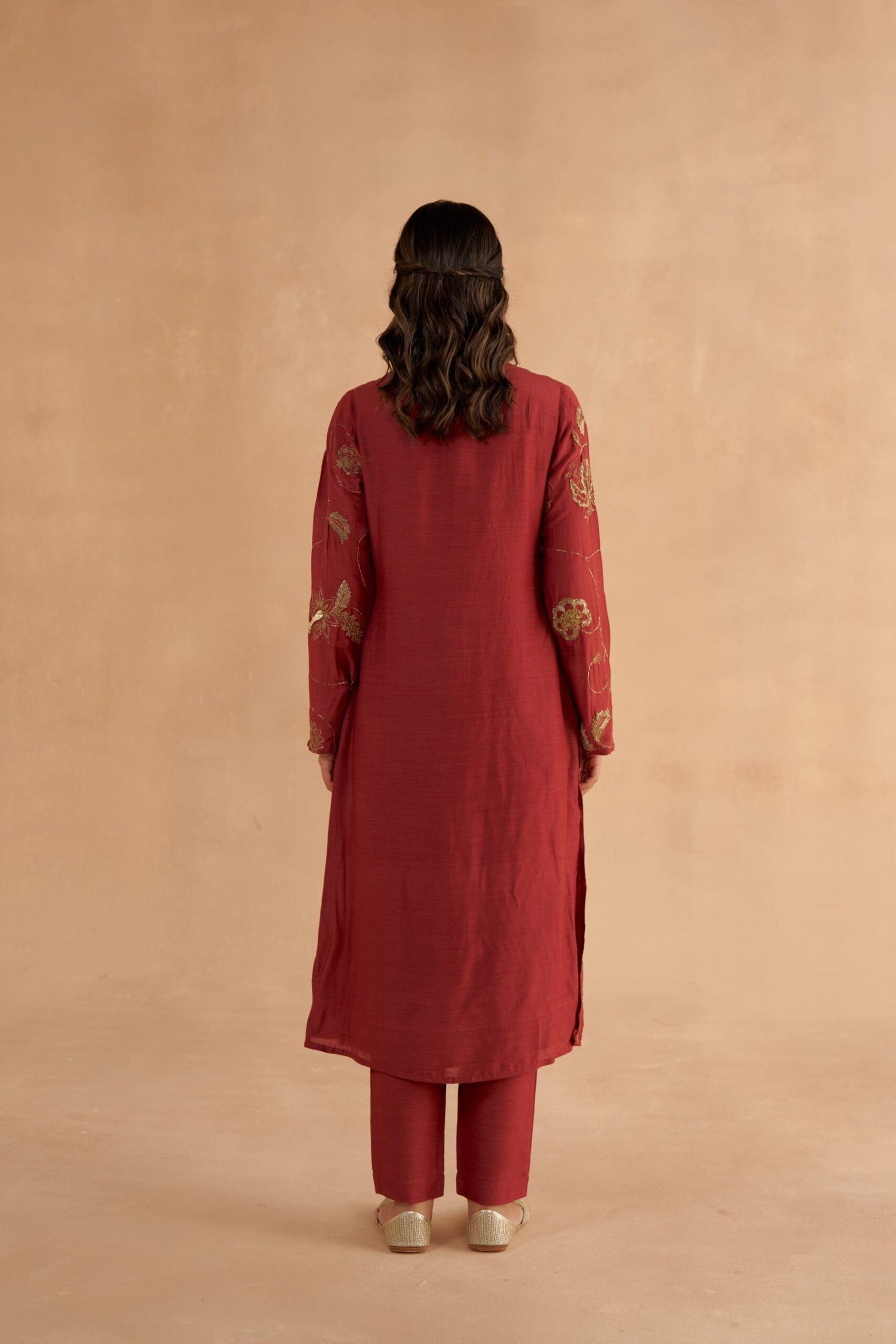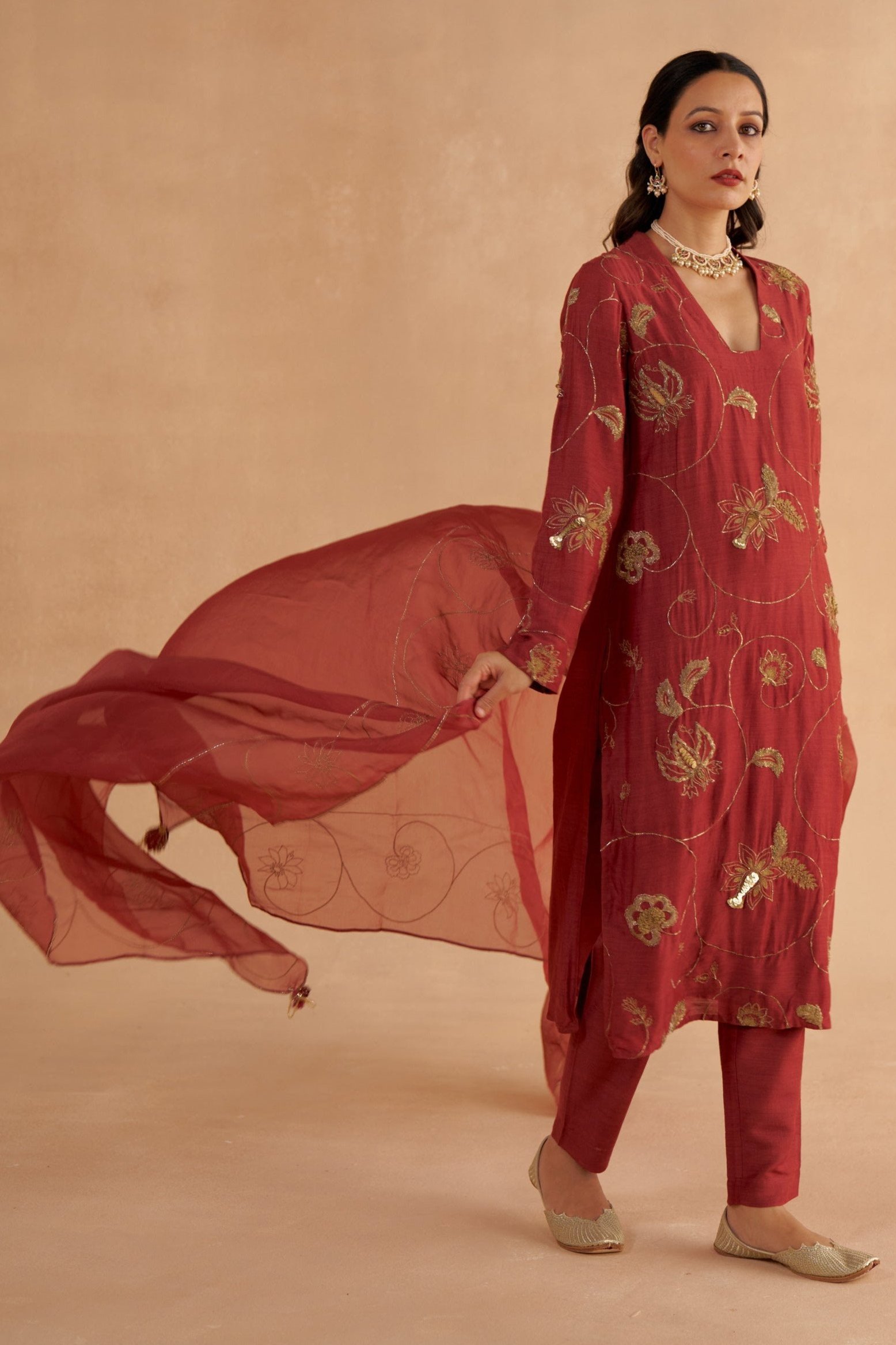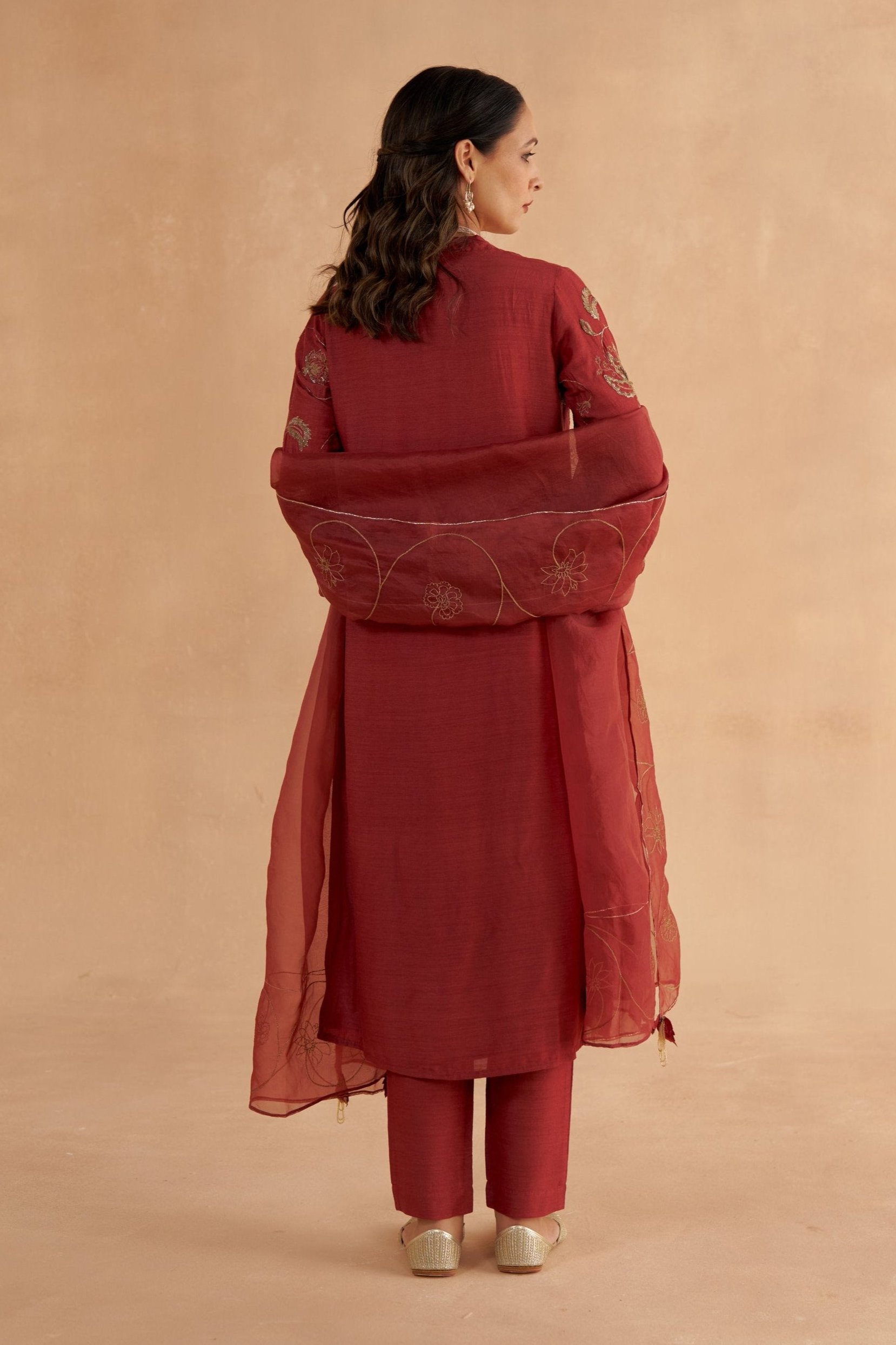 This long kurta in rich mahogany red Moonga silk is adorned with intricate Zardozi embroidery, inspired by traditional chintz patterns. The V-neck and minimalist design serve as a perfect canvas for the detailed embroidery, adding a touch of artistry. Paired with fine mahogany red Moonga silk tapered pants, the drawstring design ensures both comfort and elegance. Thoughtfully crafted with pockets, these pants offer practicality while maintaining a polished look, making them a versatile addition to any ensemble. The look is completed with an elegant red organza dupatta featuring intricate zari embroidery with chintz-inspired motifs. Tassel details at the edges enhance the overall design.